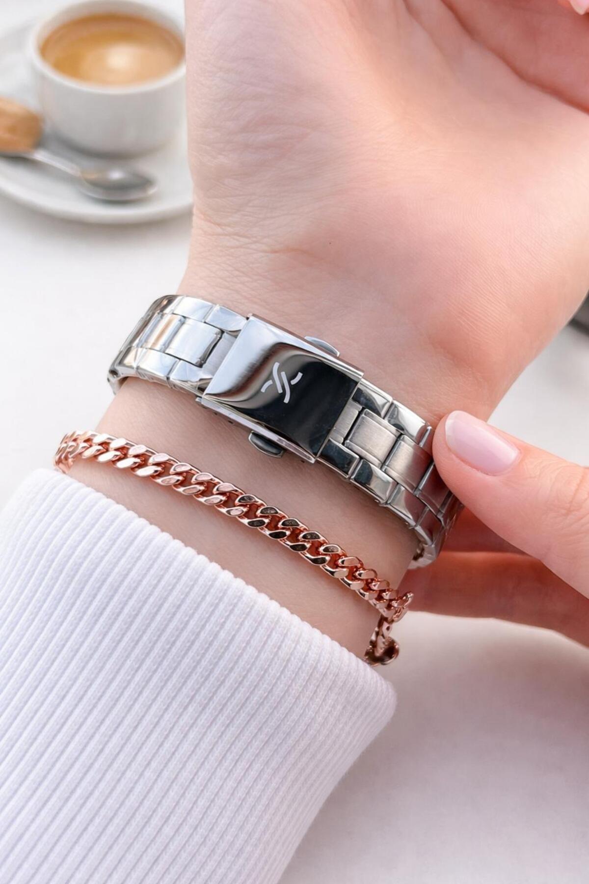 BLKT.0847 PRODUCT FEATURES: LANYARD : STEEL LANYARD COLOR: SILVER CASE COLOR : SILVER/ROSE DIAL COLOR :WHITE CASE DIAMETER : 34 MM CASE : STEEL PLATED MECHANISM : BATTERY POWERED GLASS : MİNERAL CALENDAR : Yes - Mineral glass type offers scratch resistance and protects your watch screen.
