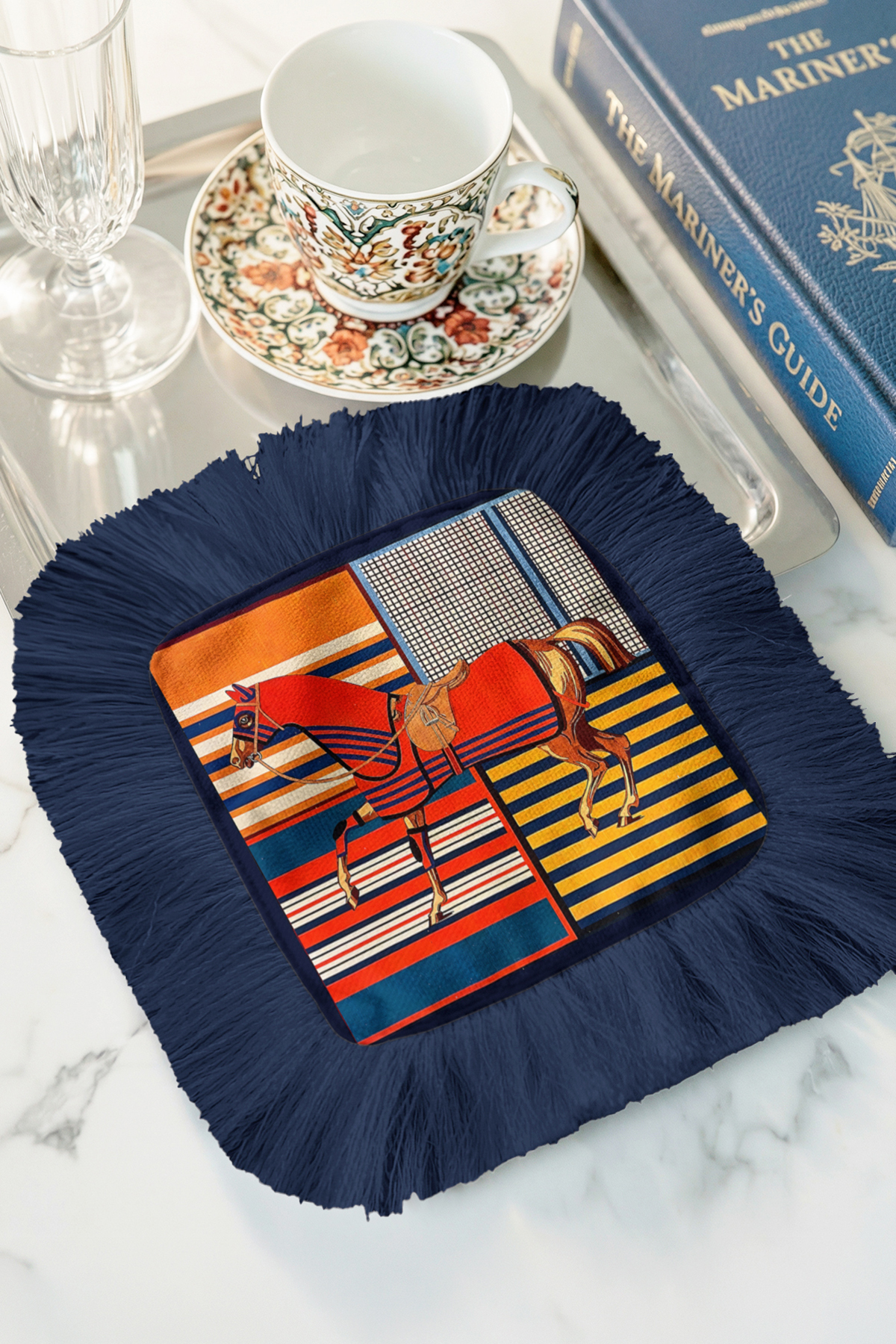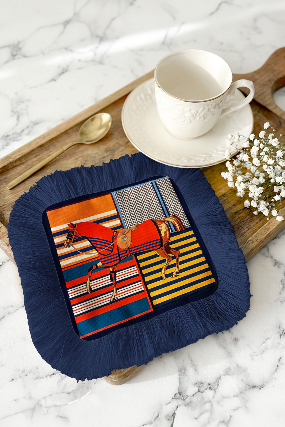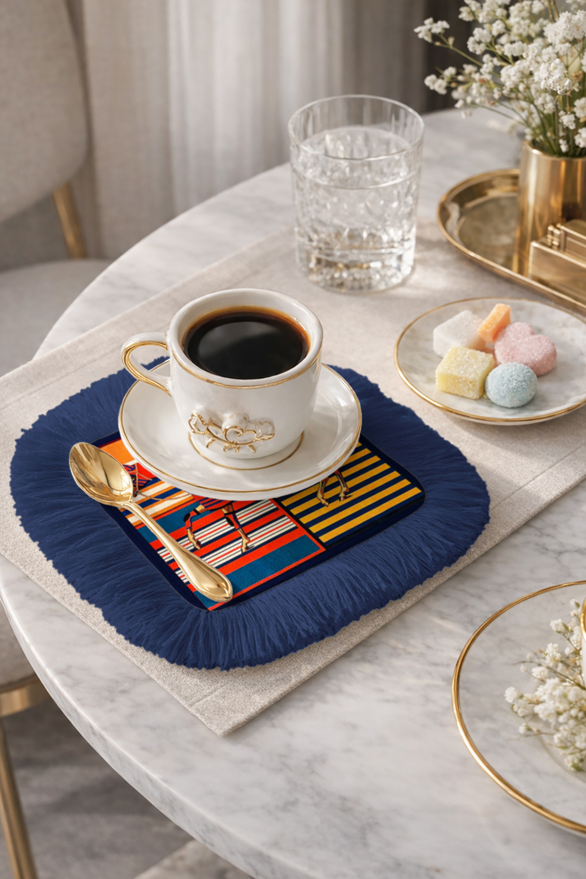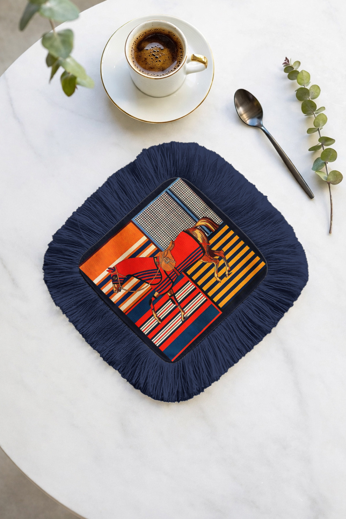 Elegant Eclectic Navy Blue Red Coaster Handkerchief Made of60% Cotton + 40% Polyester fabric with soft velvet texture.