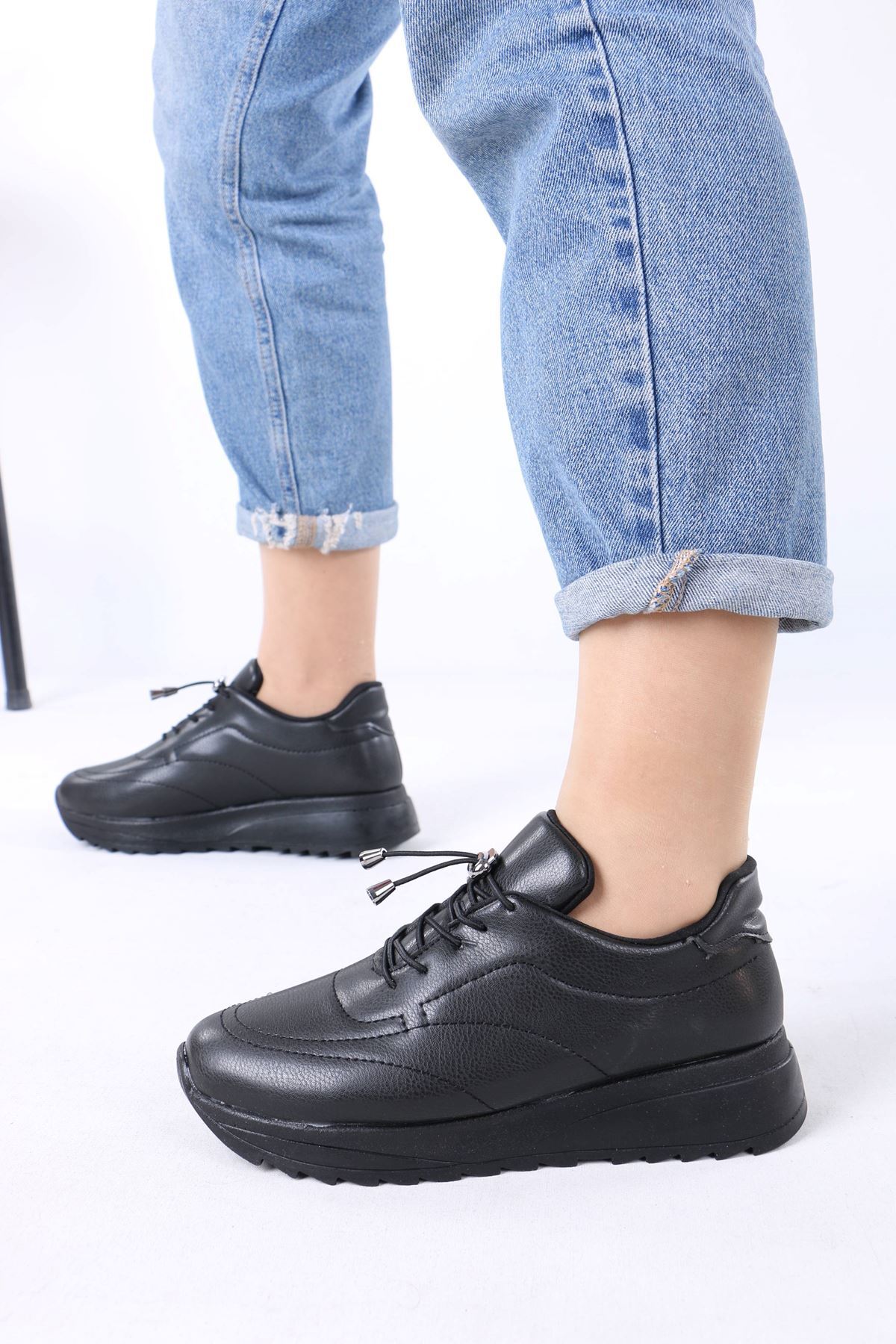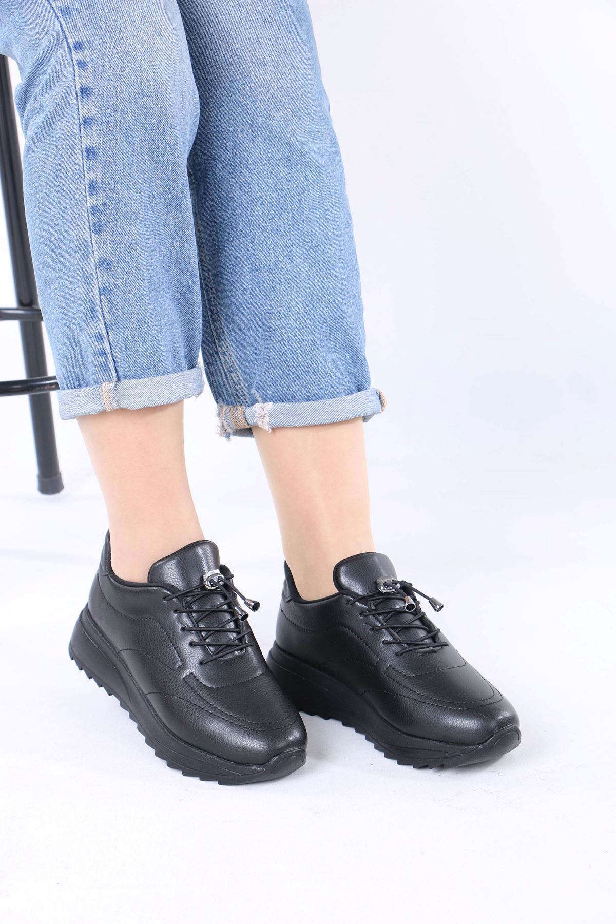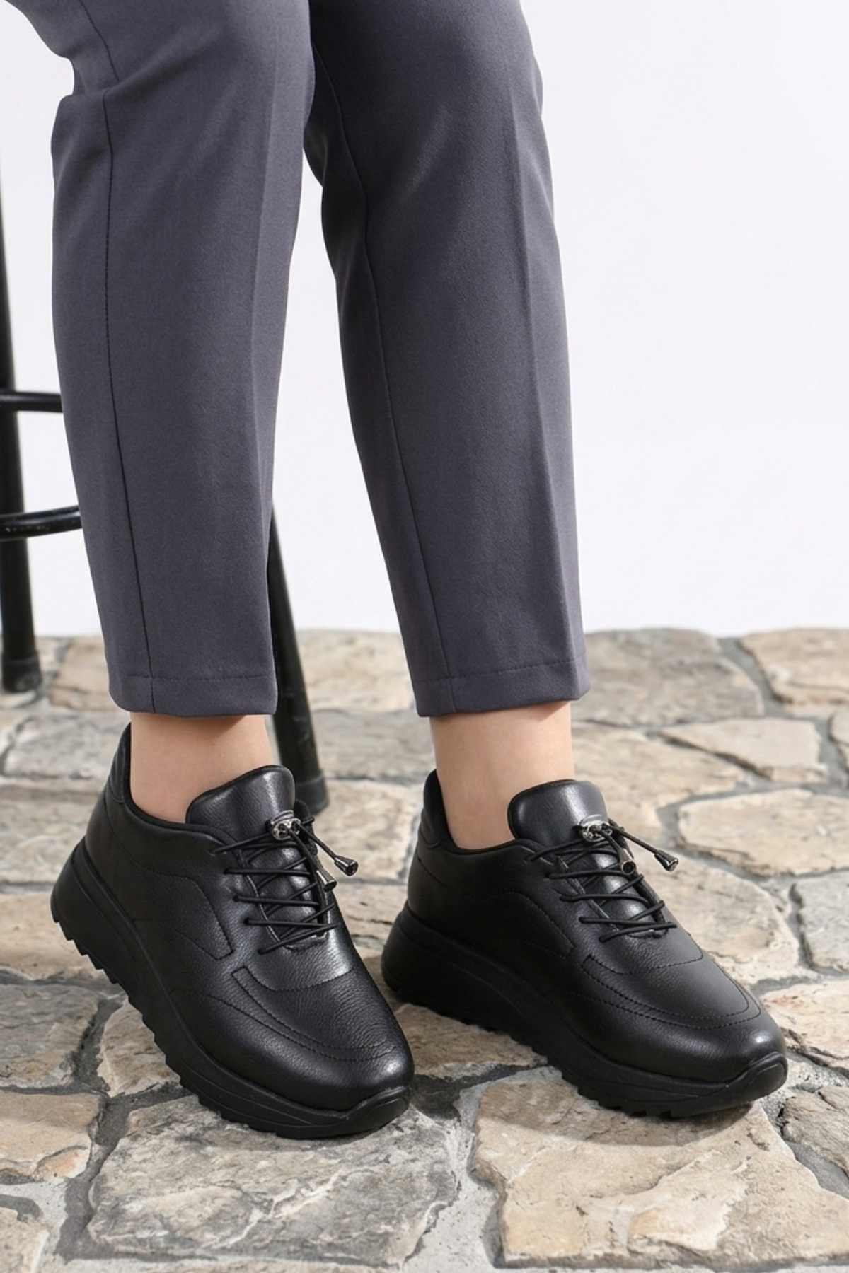sefayol Lanton Black Matte Leather Lace-Up Women's Casual Sports Shoes | ByTR