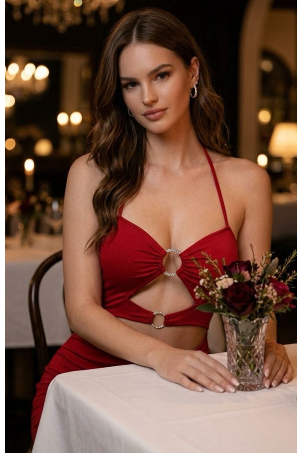 SİA LESS Women's Romantic Stylish Evening Red Dress Ruched Neckline Mini Dress | ByTR