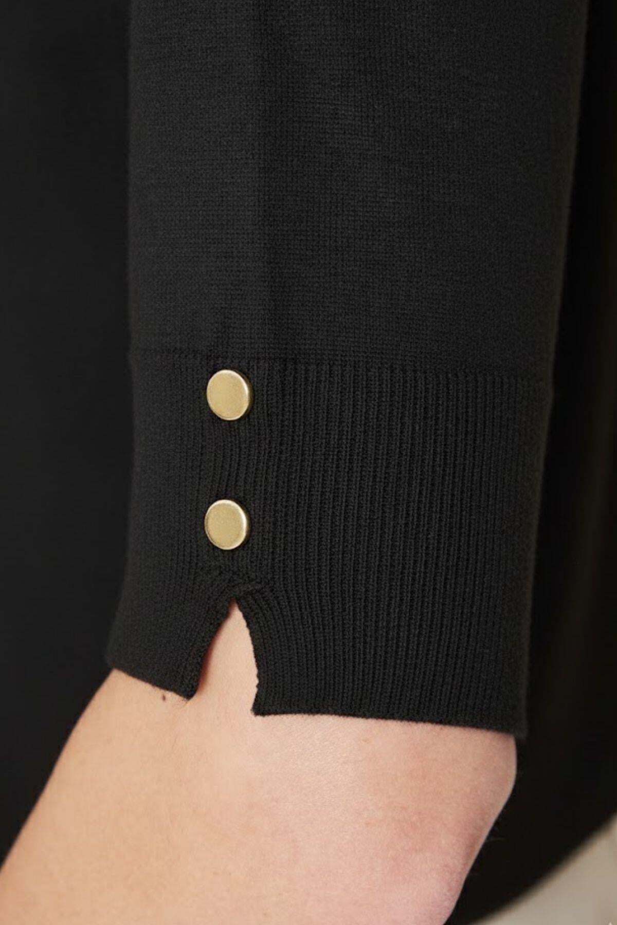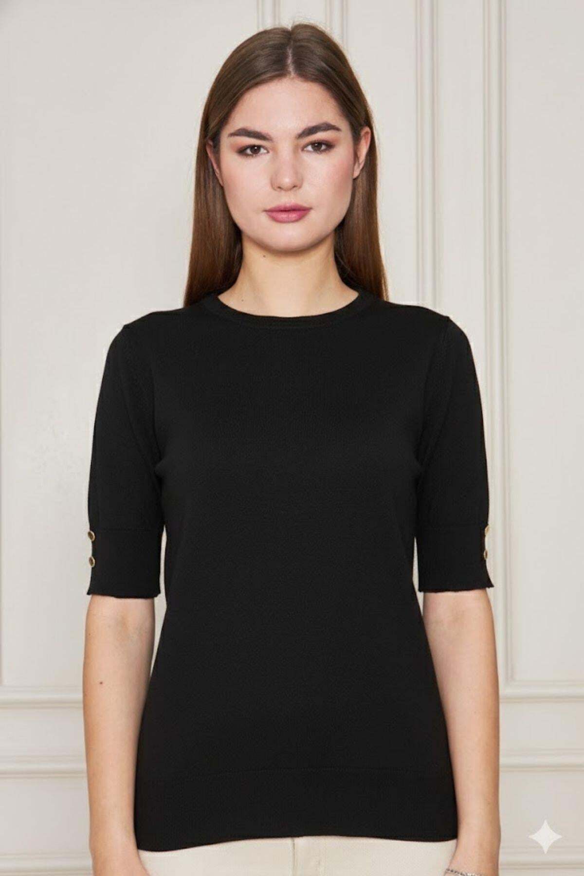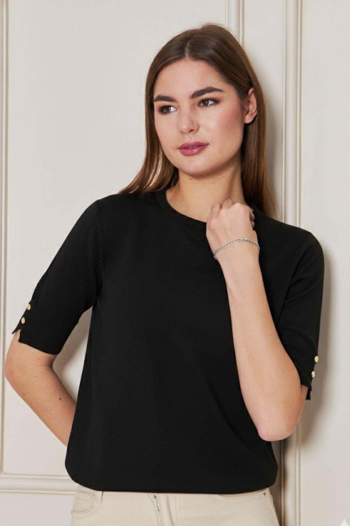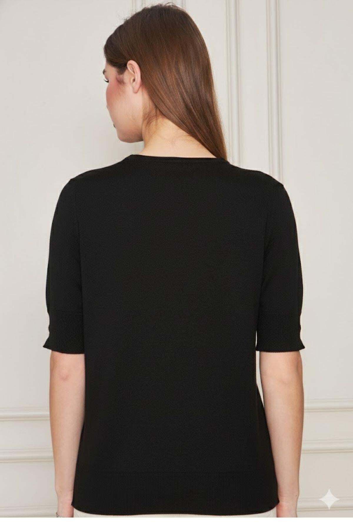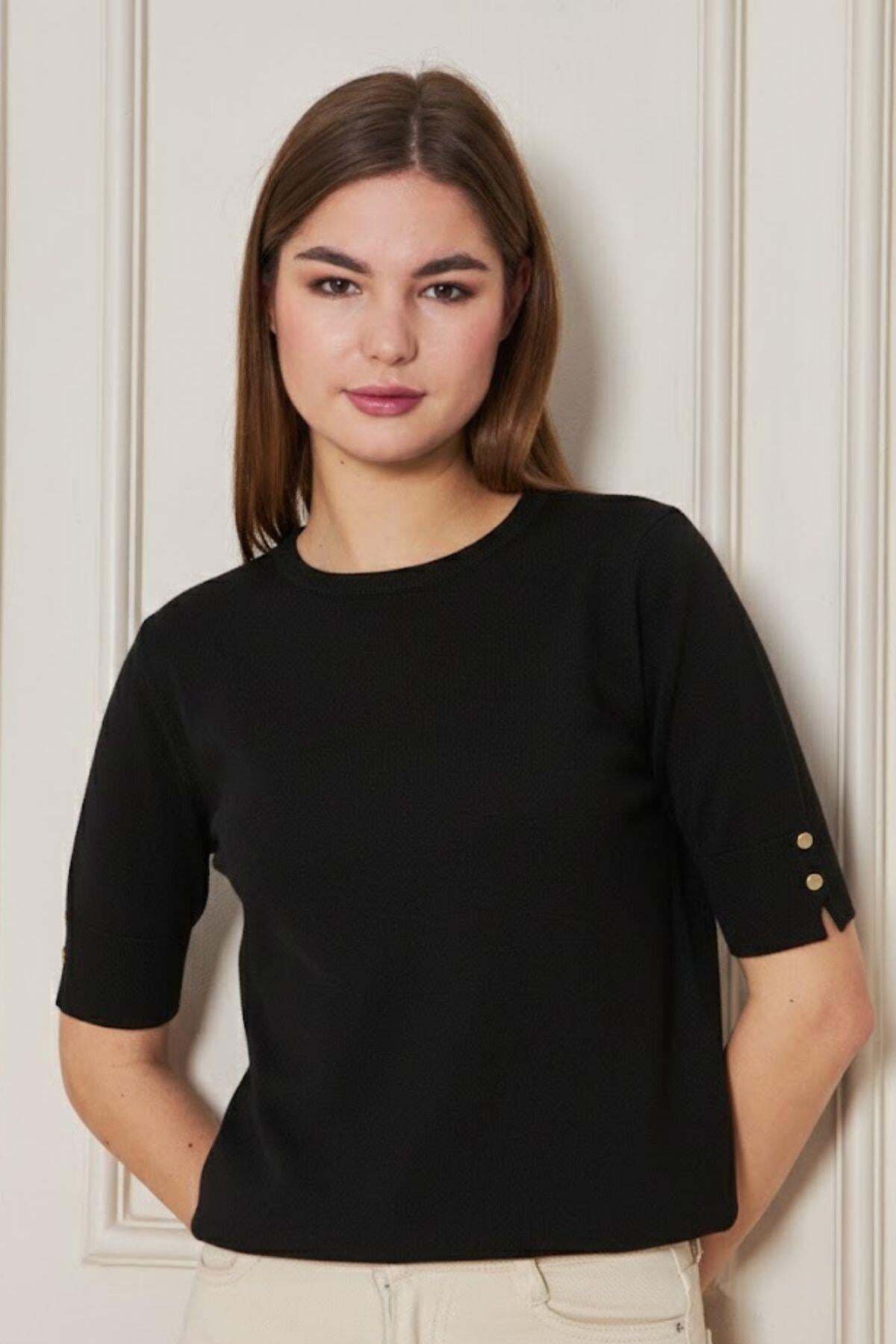 A simple and elegant look with a bicycle neckline detail. Metal snap details add a modern touch. Short sleeves and stretchy knitwear fabric offer the opportunity to use in all seasons. It can be easily combined with jeans, skirts or fabric pants. If you are looking for comfortable elegance in your daily style, this elegant blouse from Riverside is for you.