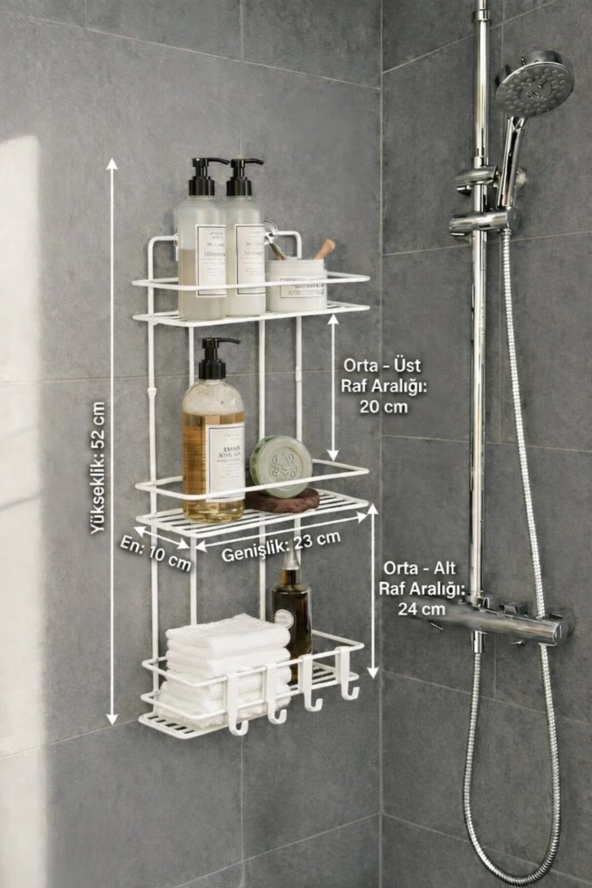 it can be installed with extra rigidity, either without drilling into your wall with adhesive or with ready-made screw holes. With its hooked design, it also offers an ideal solution for hanging your fibers, towels and accessories.