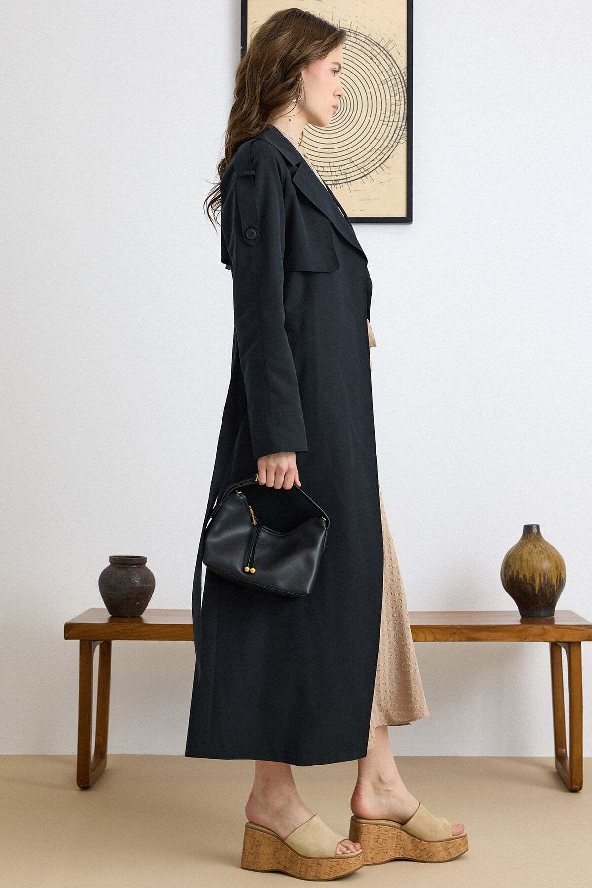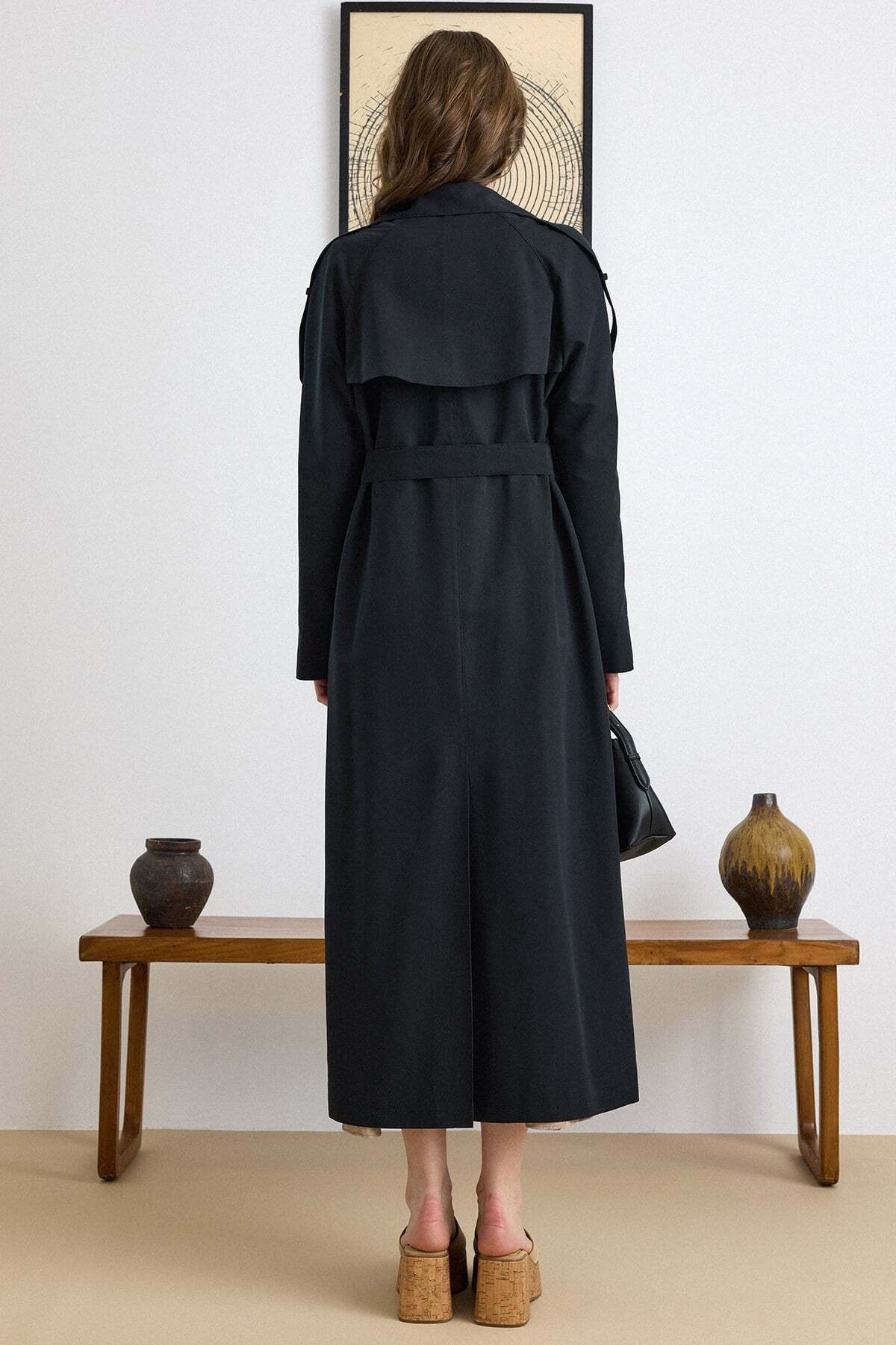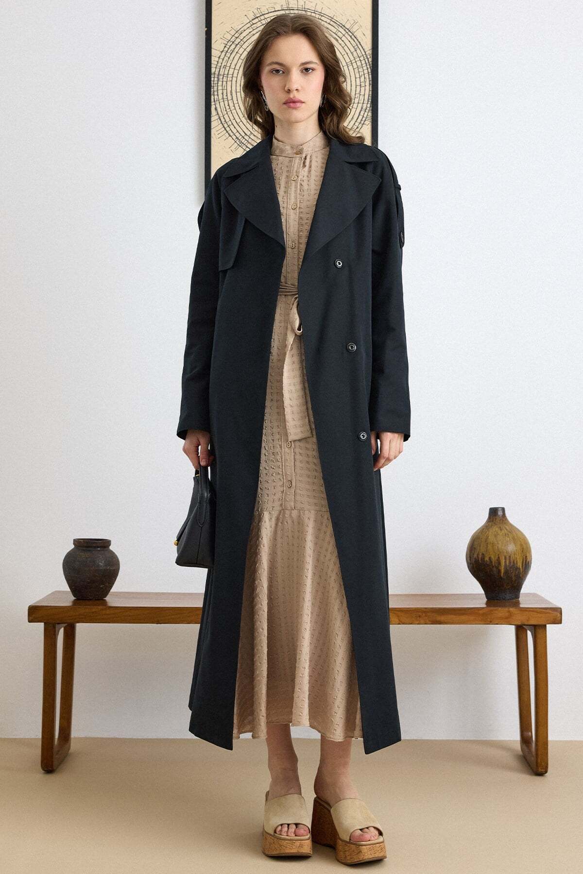 Epaulette and Cloak Detailed Unlined Long Trench Coat BLACK 6808
