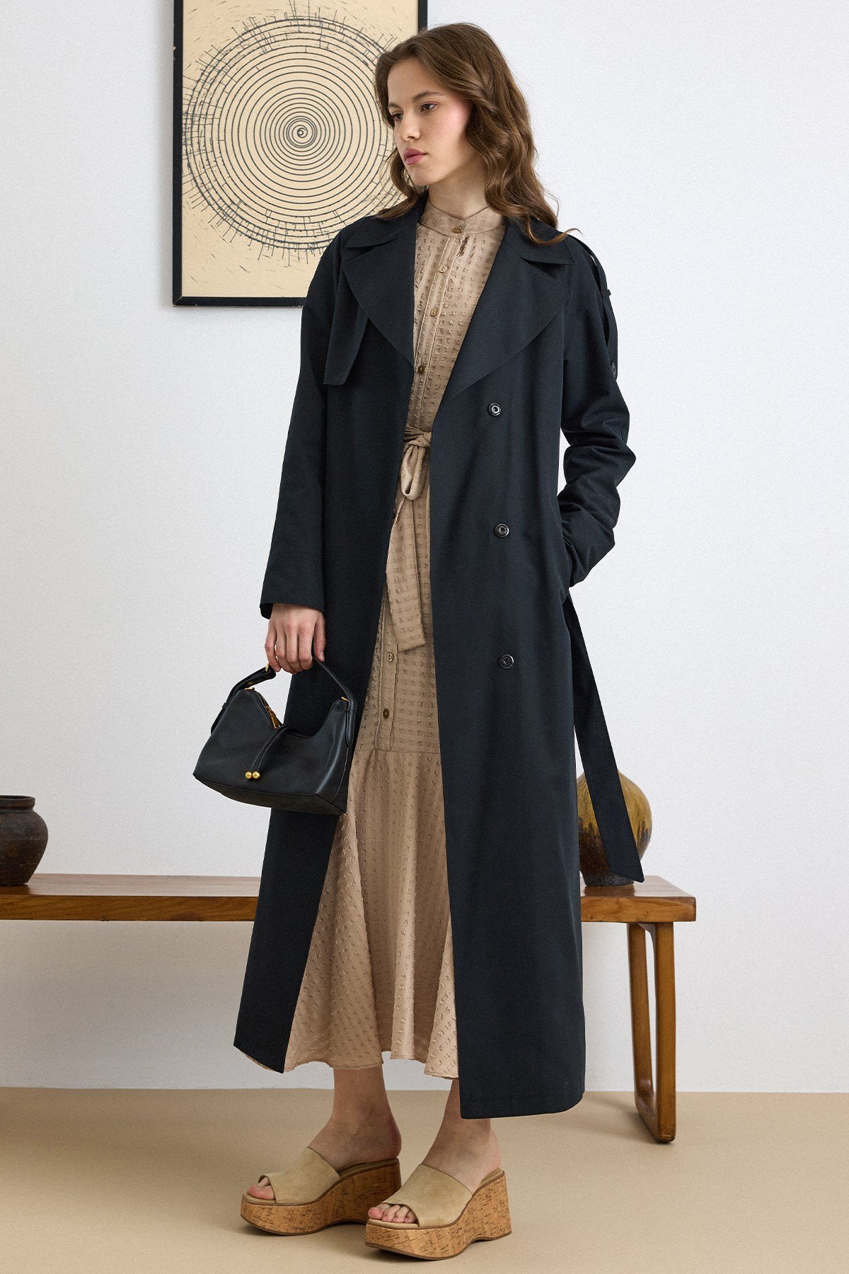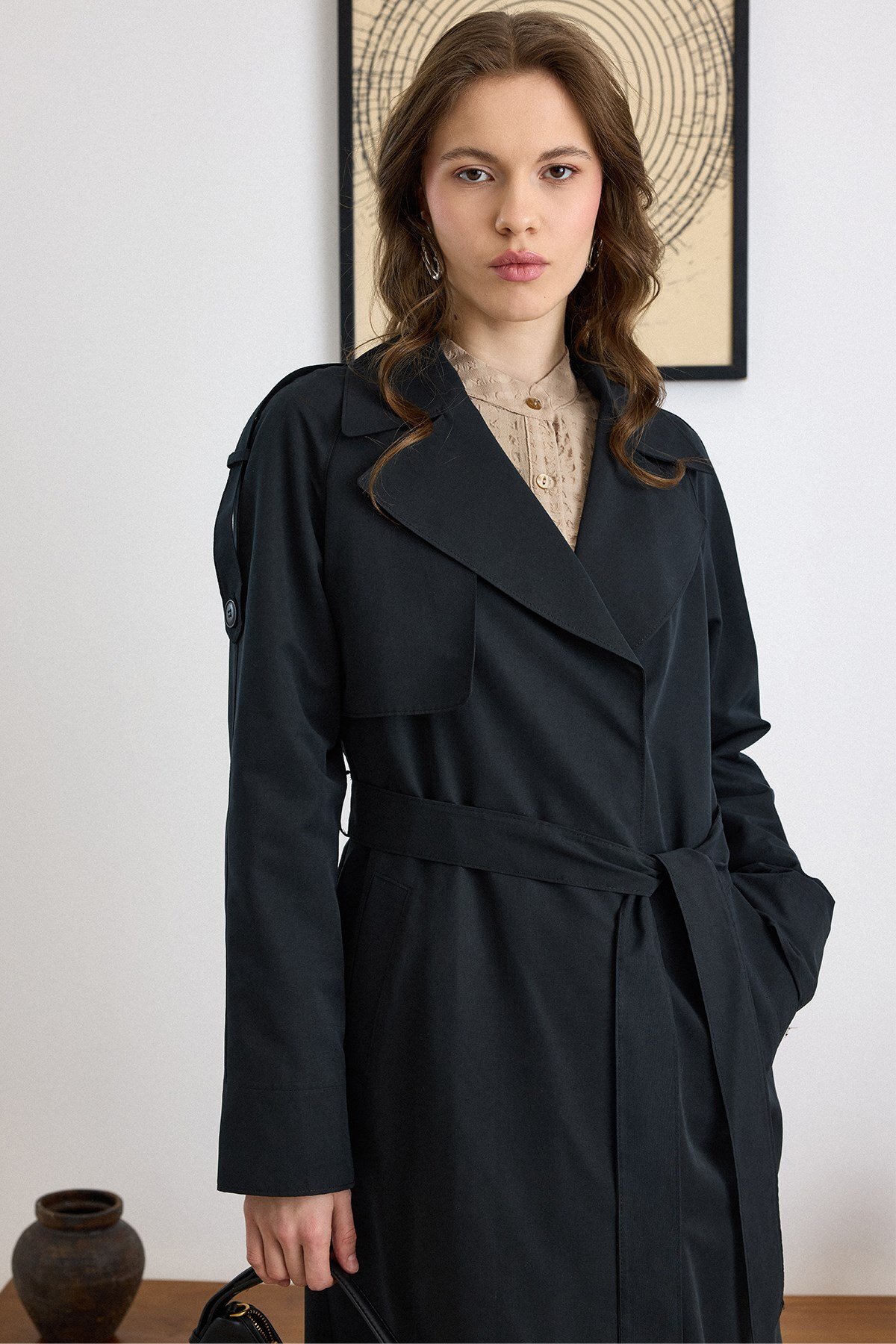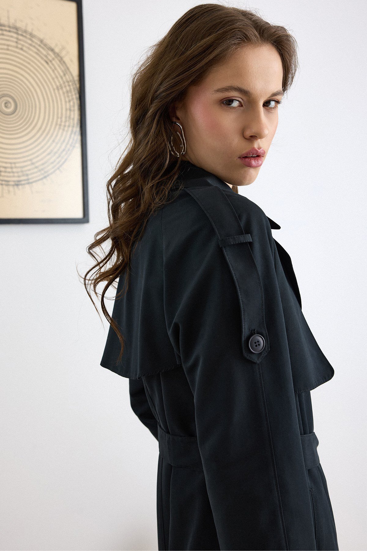 Olcay Epaulette and Cloak Detailed Unlined Long Trench Coat BLACK 6808 | ByTR