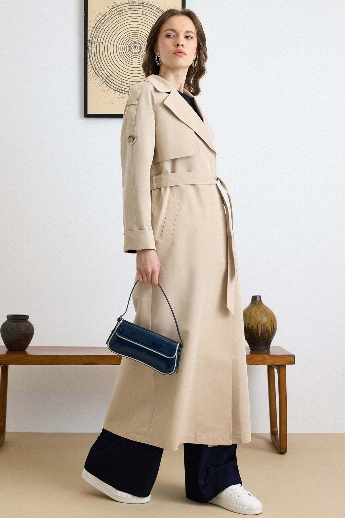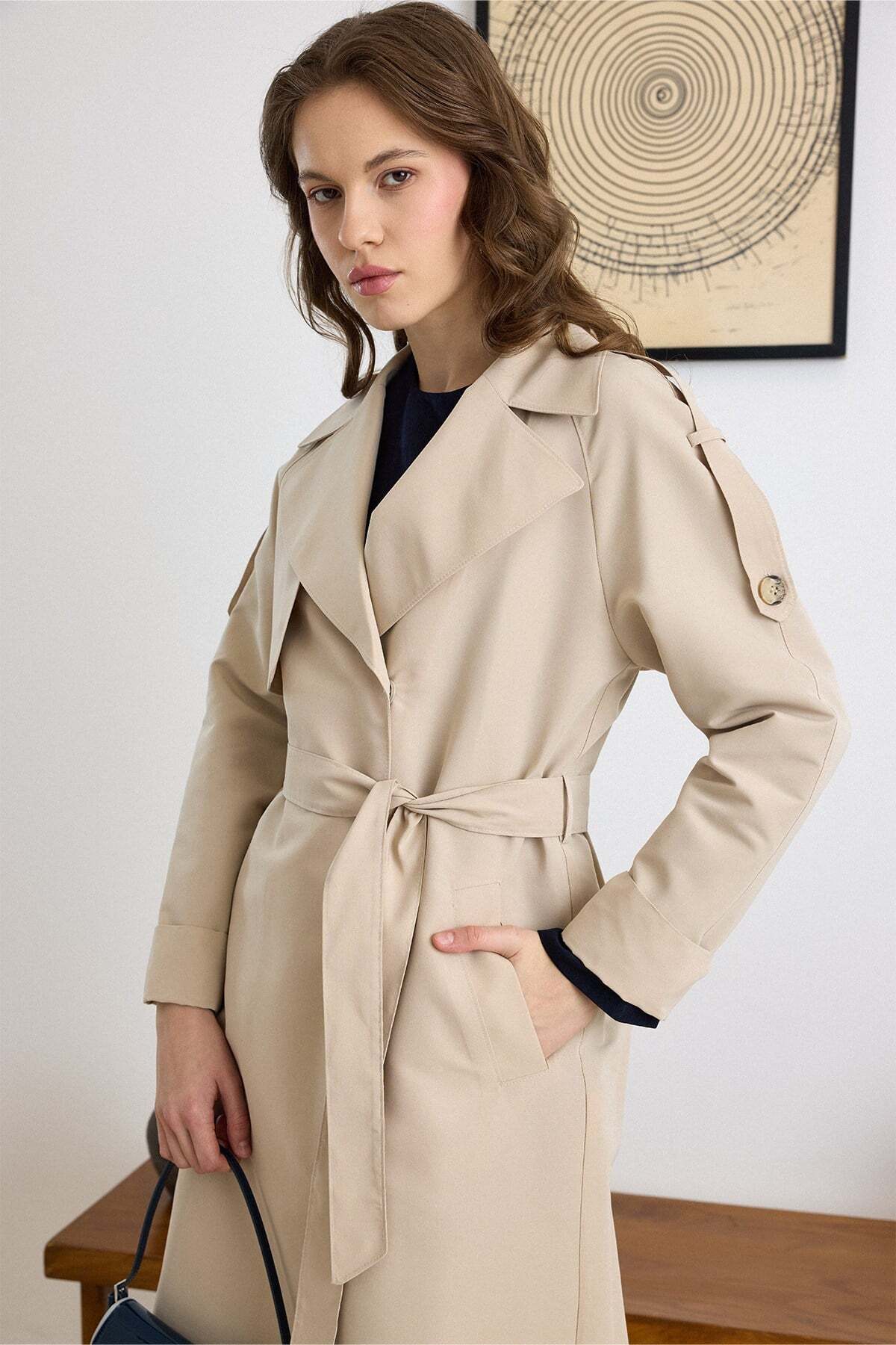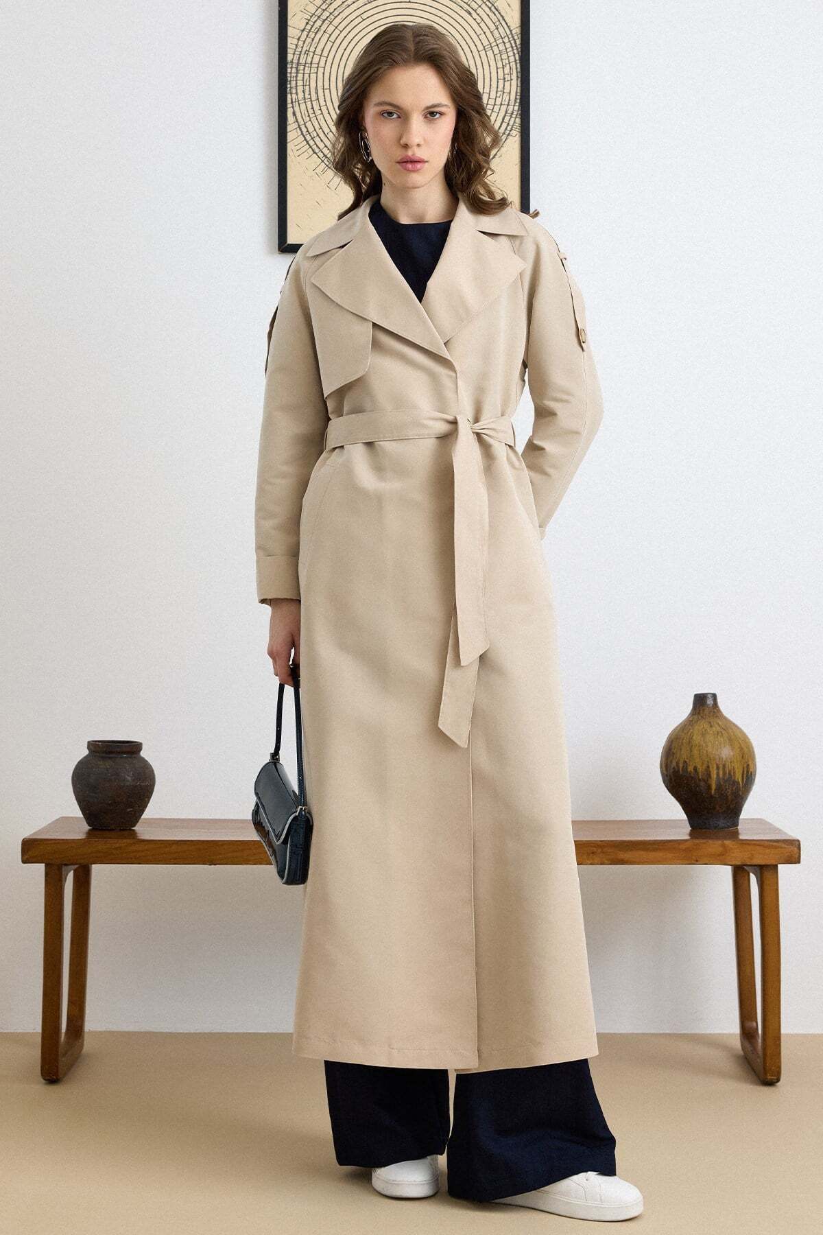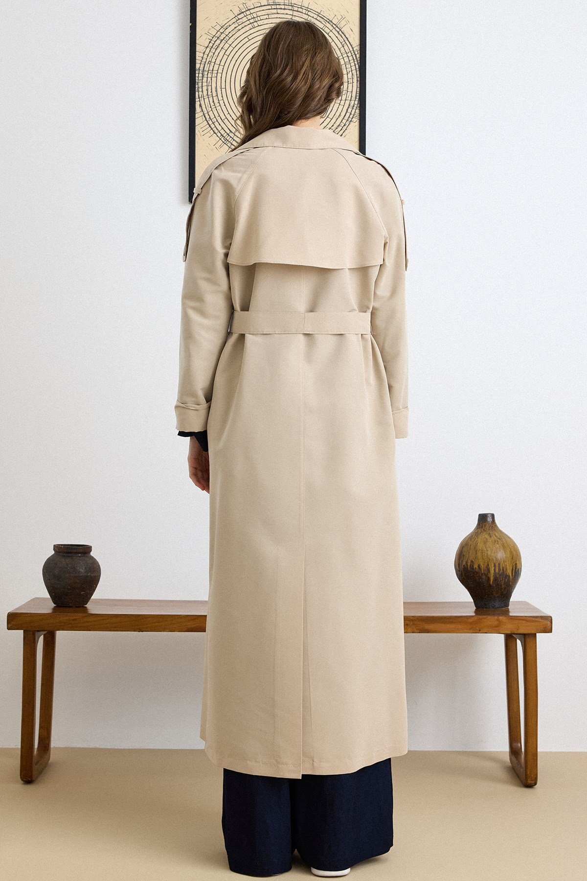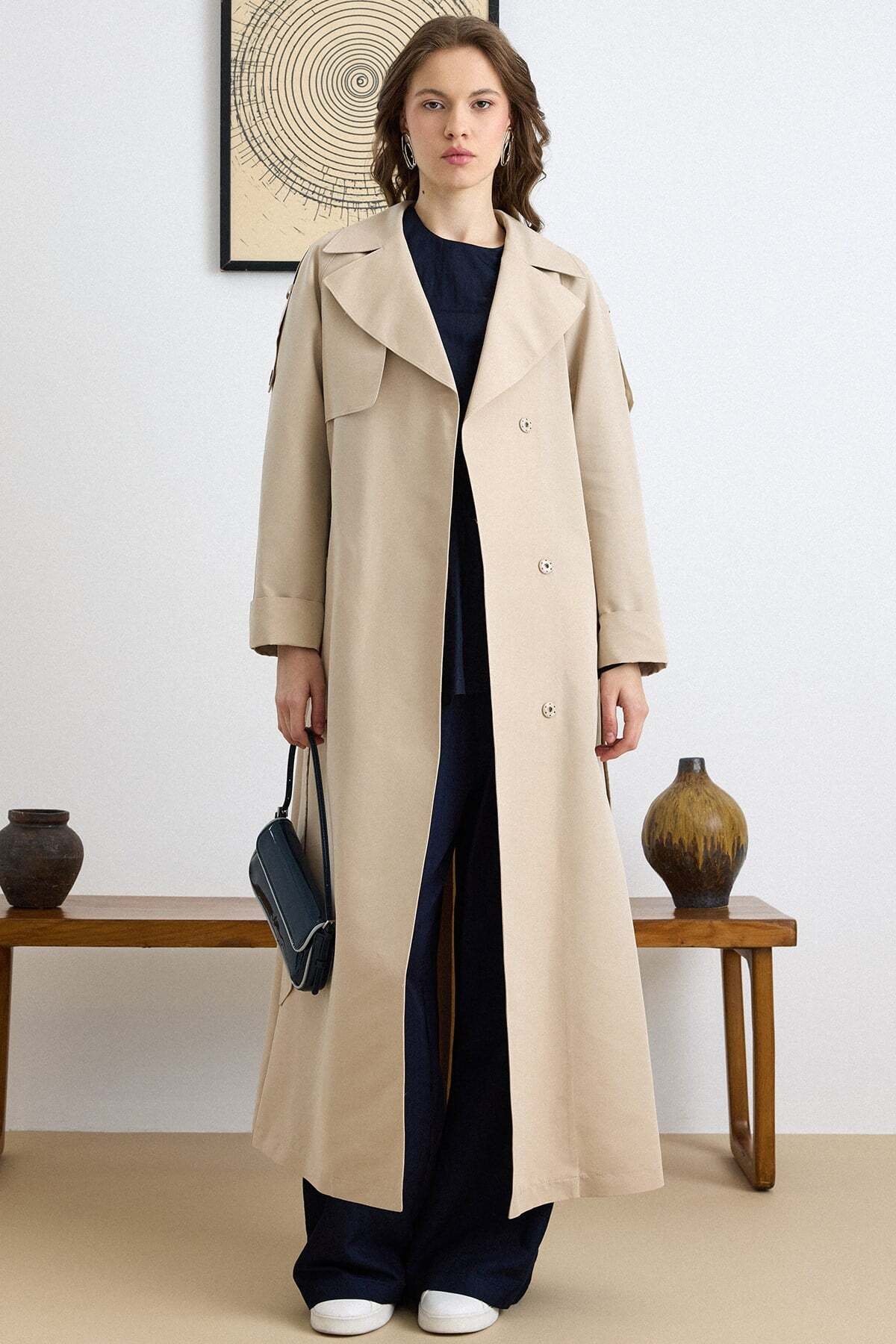 Olcay Epaulette and Cloak Detailed Unlined Long Trench Coat STONE 6808 | ByTR