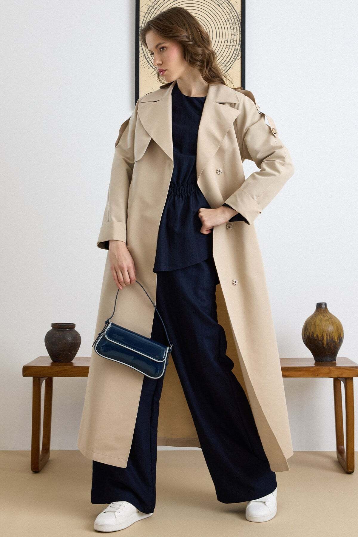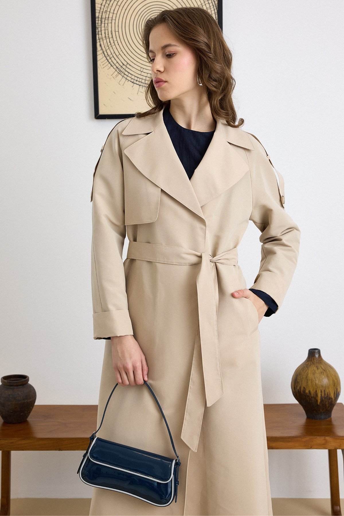Epaulette and Cloak Detailed Unlined Long Trench Coat STONE 6808