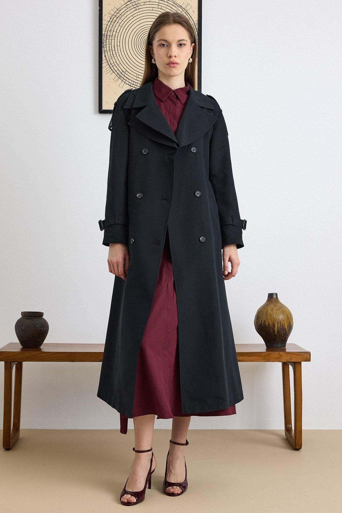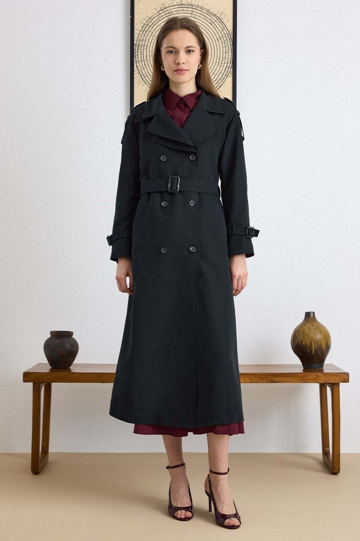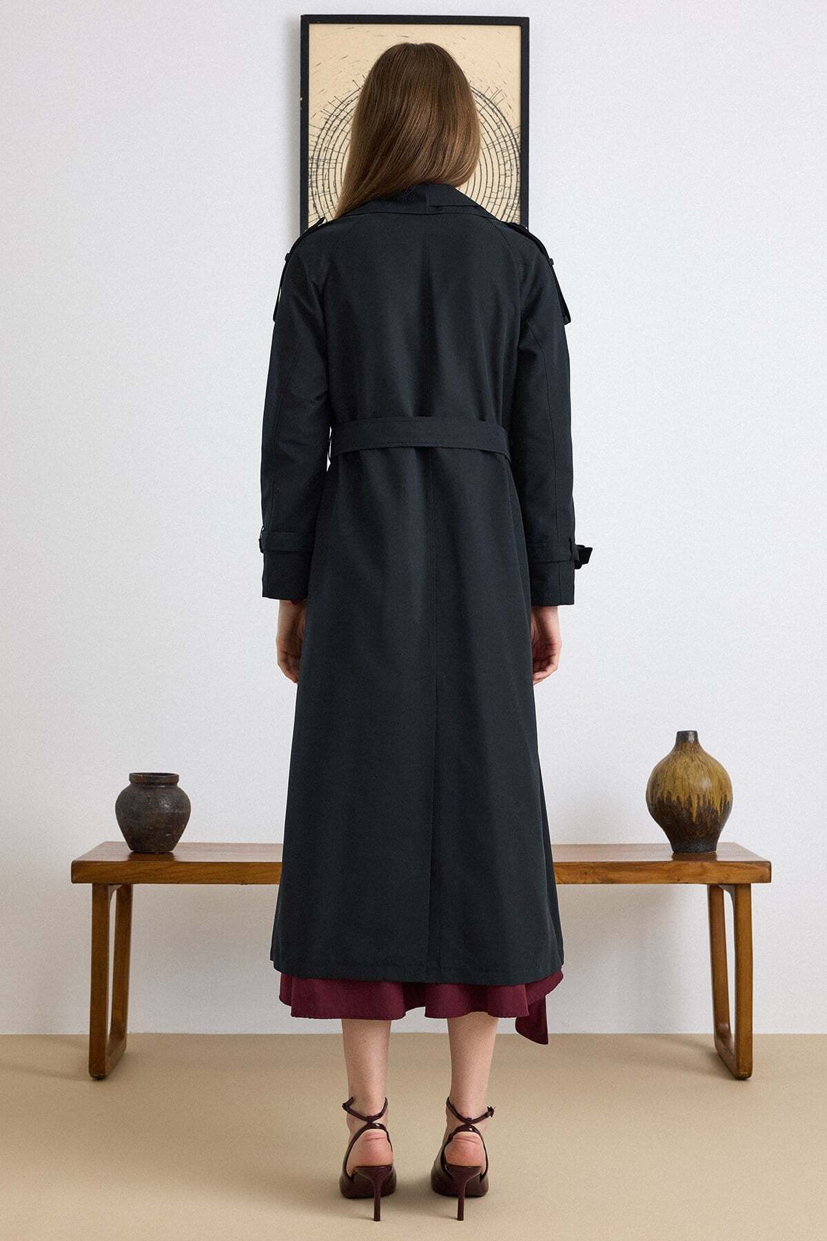 Olcay Double Collar Detailed Water Repellent Unlined Long Trench Coat BLACK 6832 | ByTR