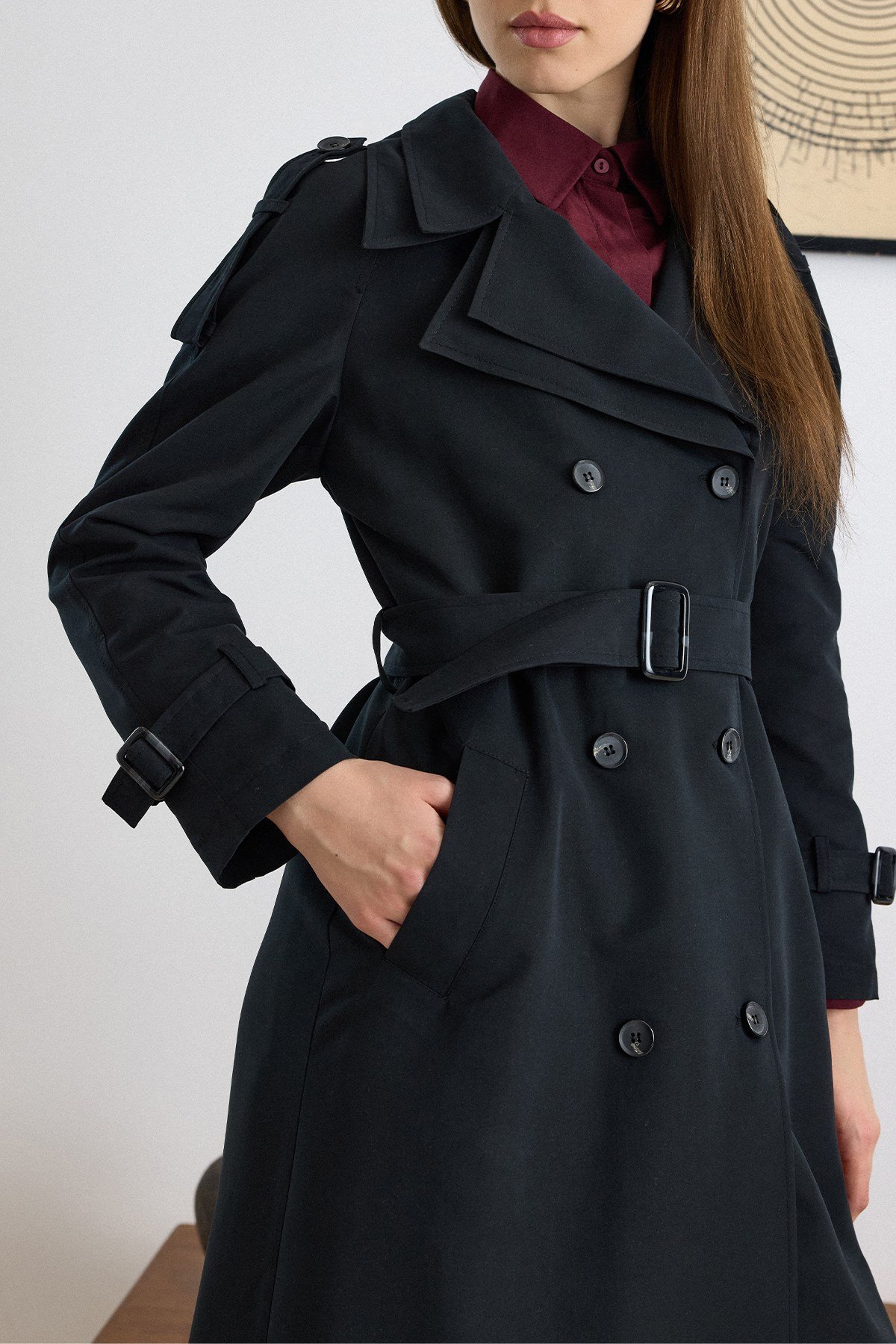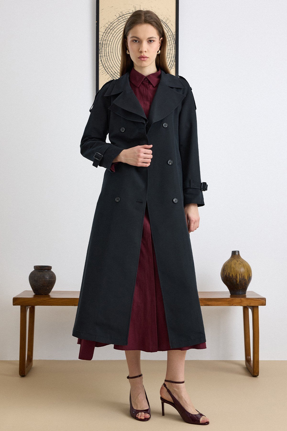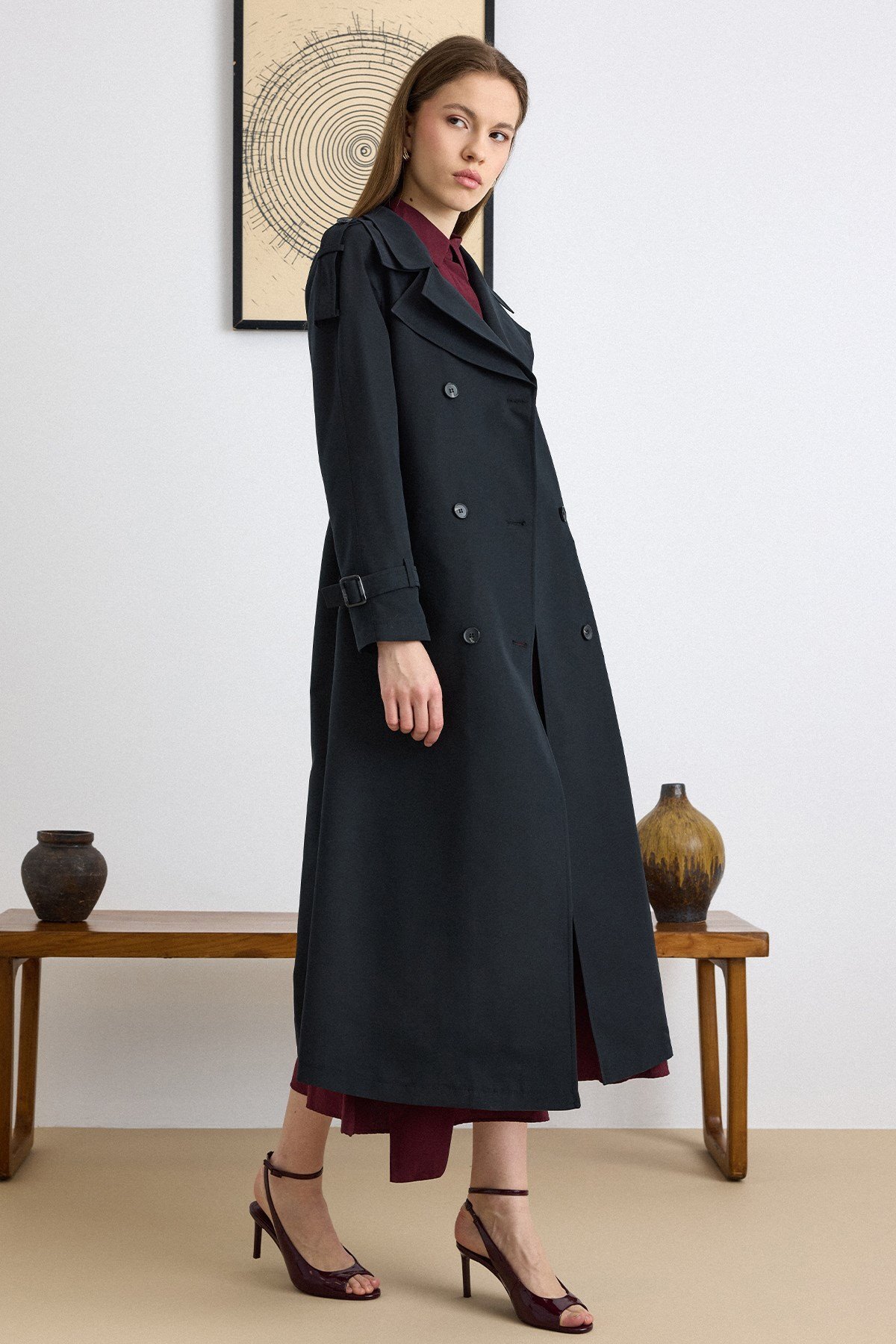 Olcay Double Collar Detailed Water Repellent Unlined Long Trench Coat BLACK 6832 | ByTR
