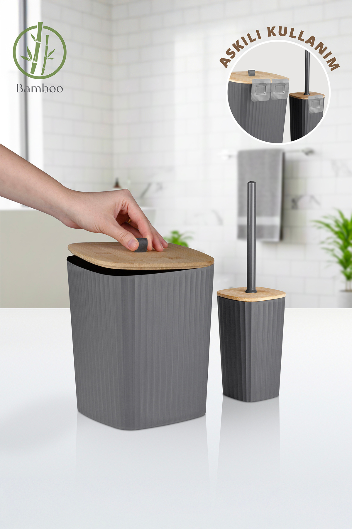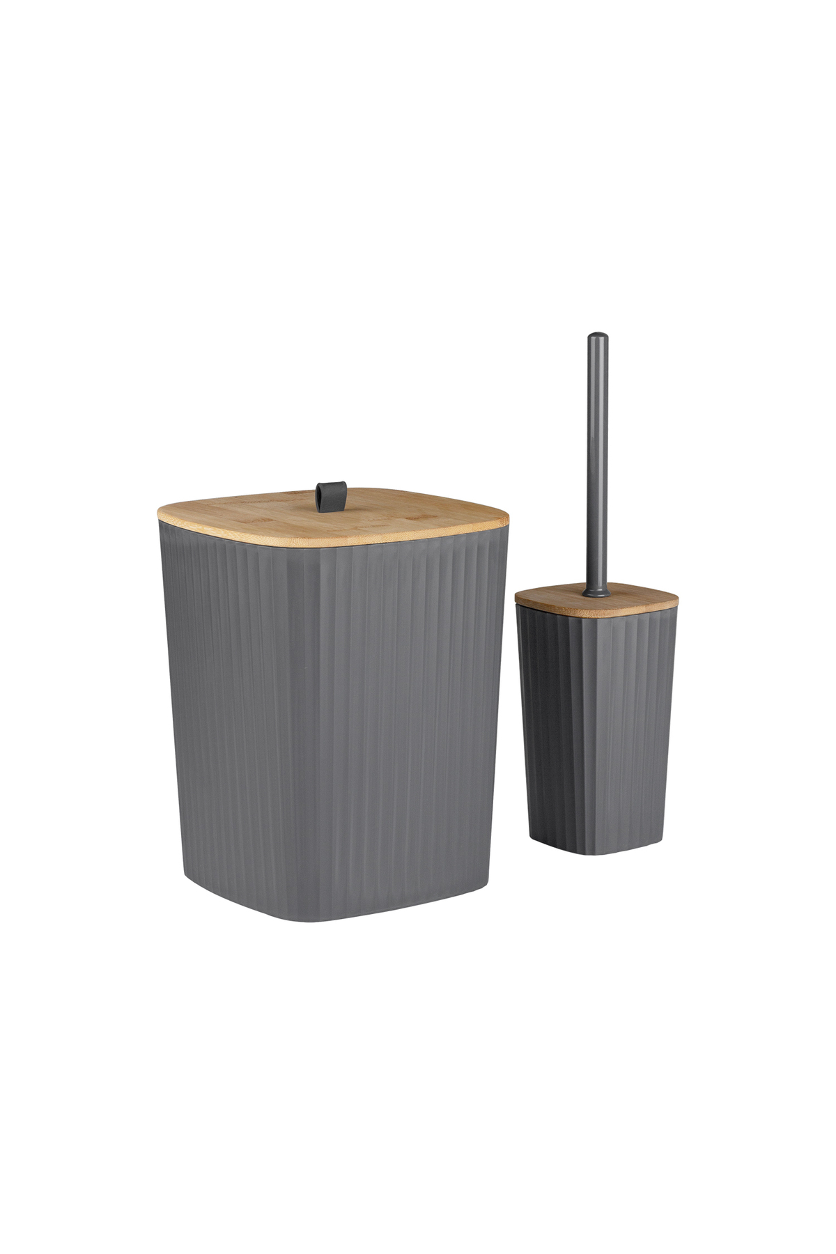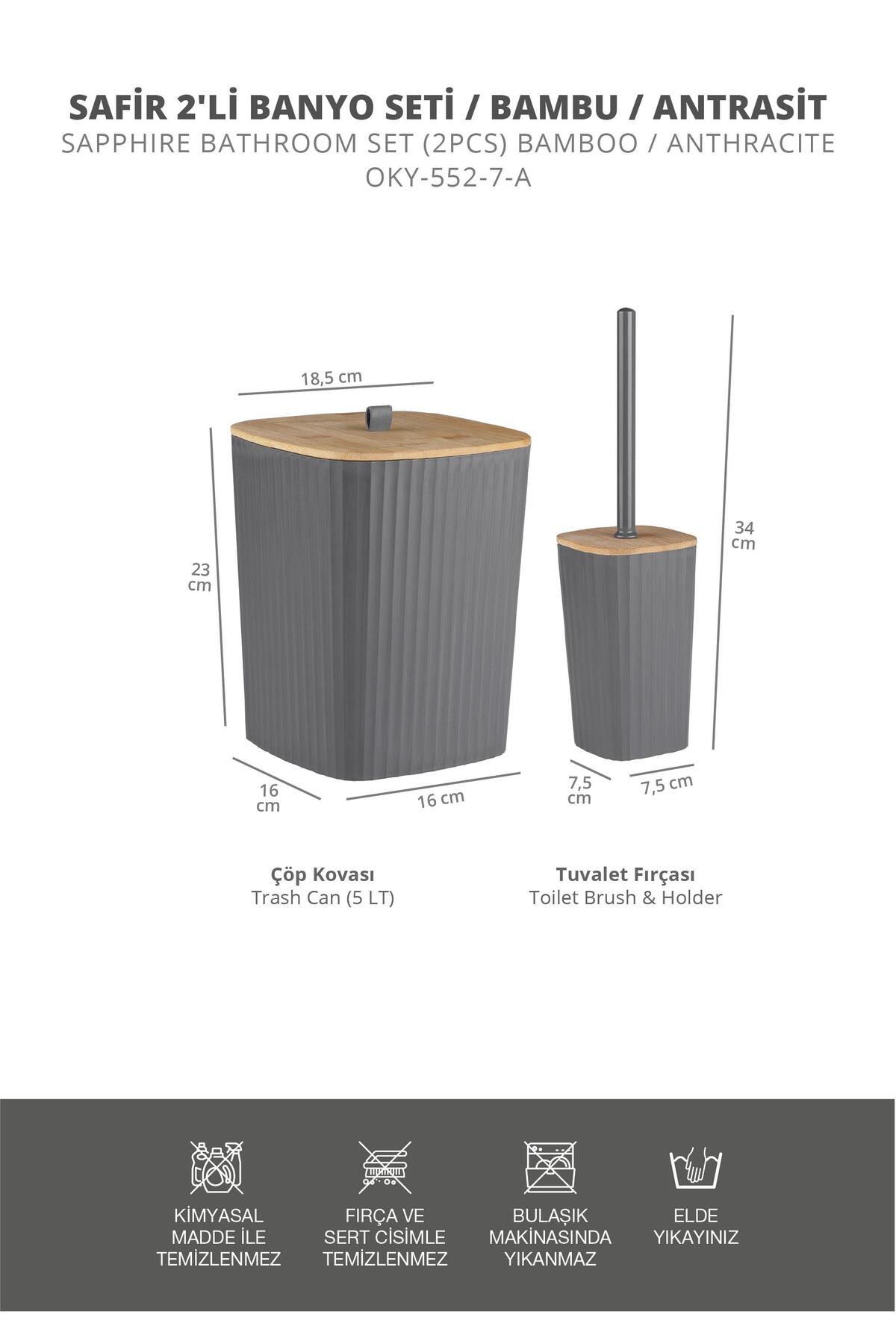 Ocean Home Sapphire Adhesive Real Bamboo Toilet Brush Holder and Trash Can Set Anthracite 2-Piece Bathroom Set