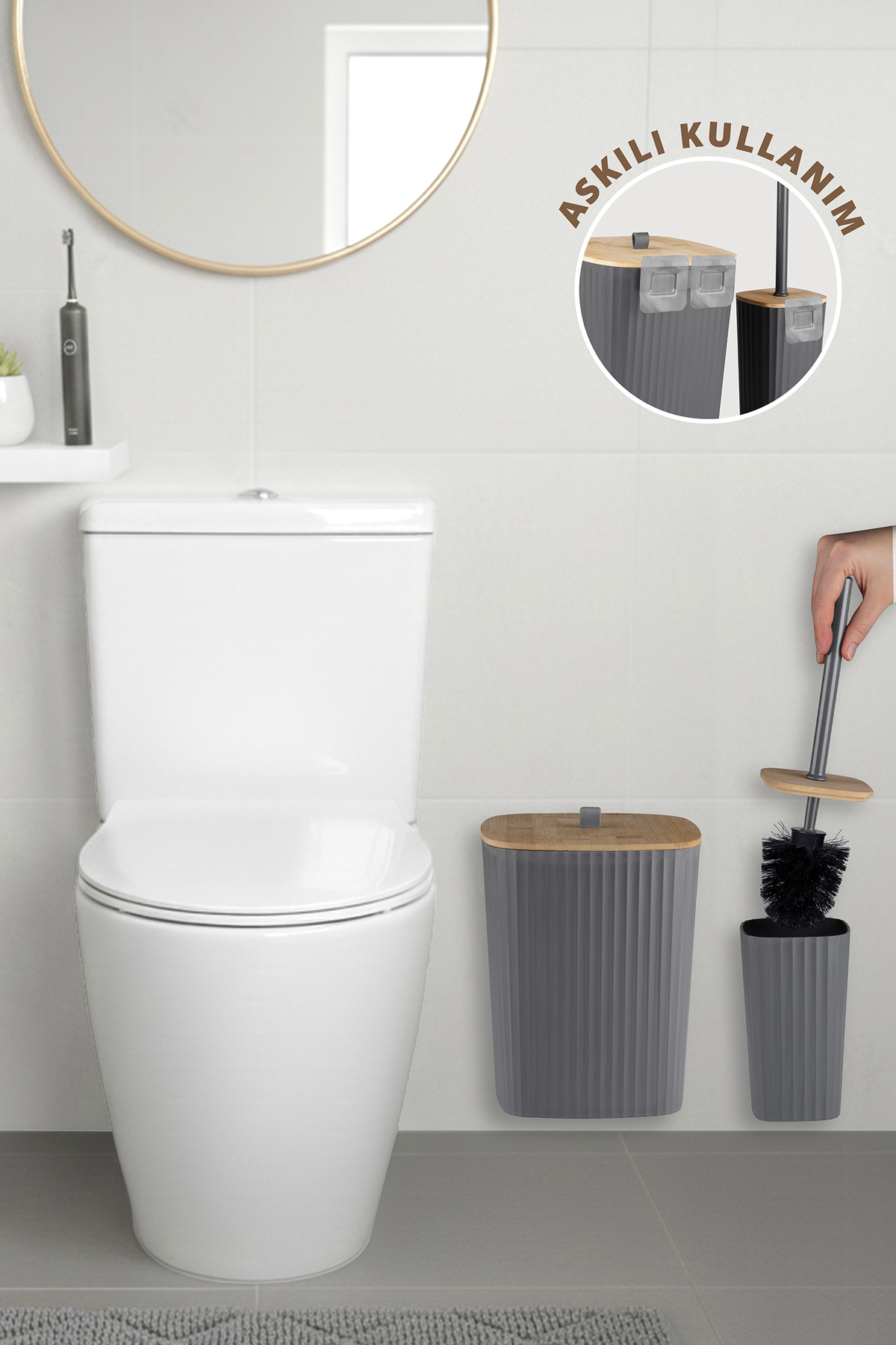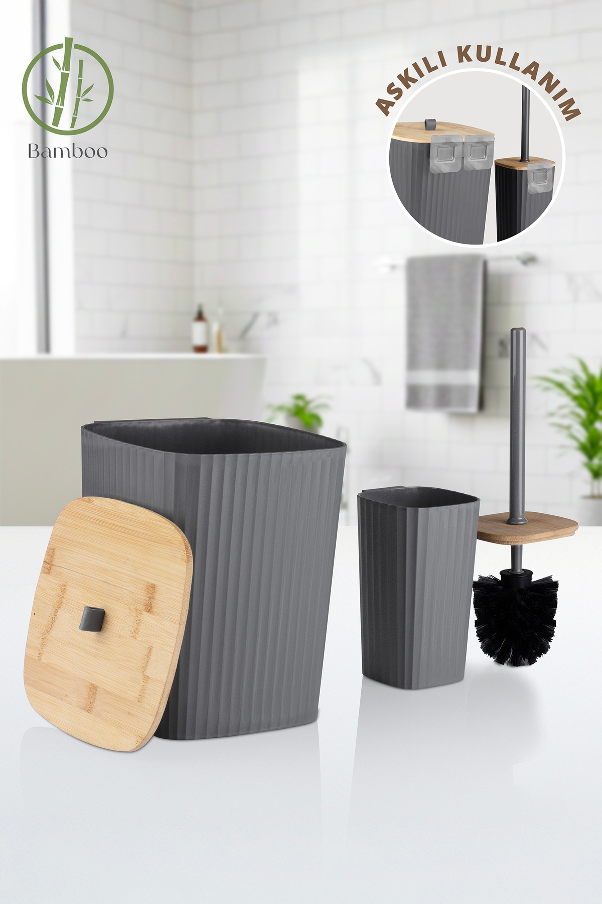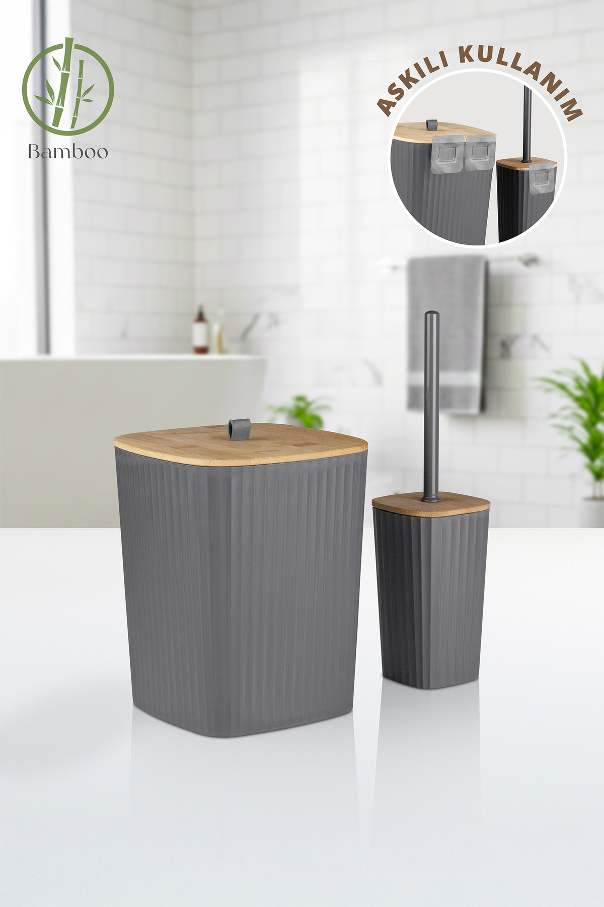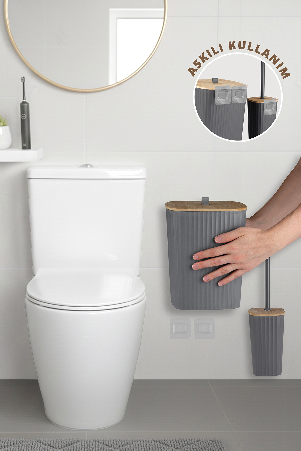 Ocean Home Sapphire Adhesive Real Bamboo Toilet Brush Holder and Trash Can Set Anthracite 2-Piece Bathroom Set