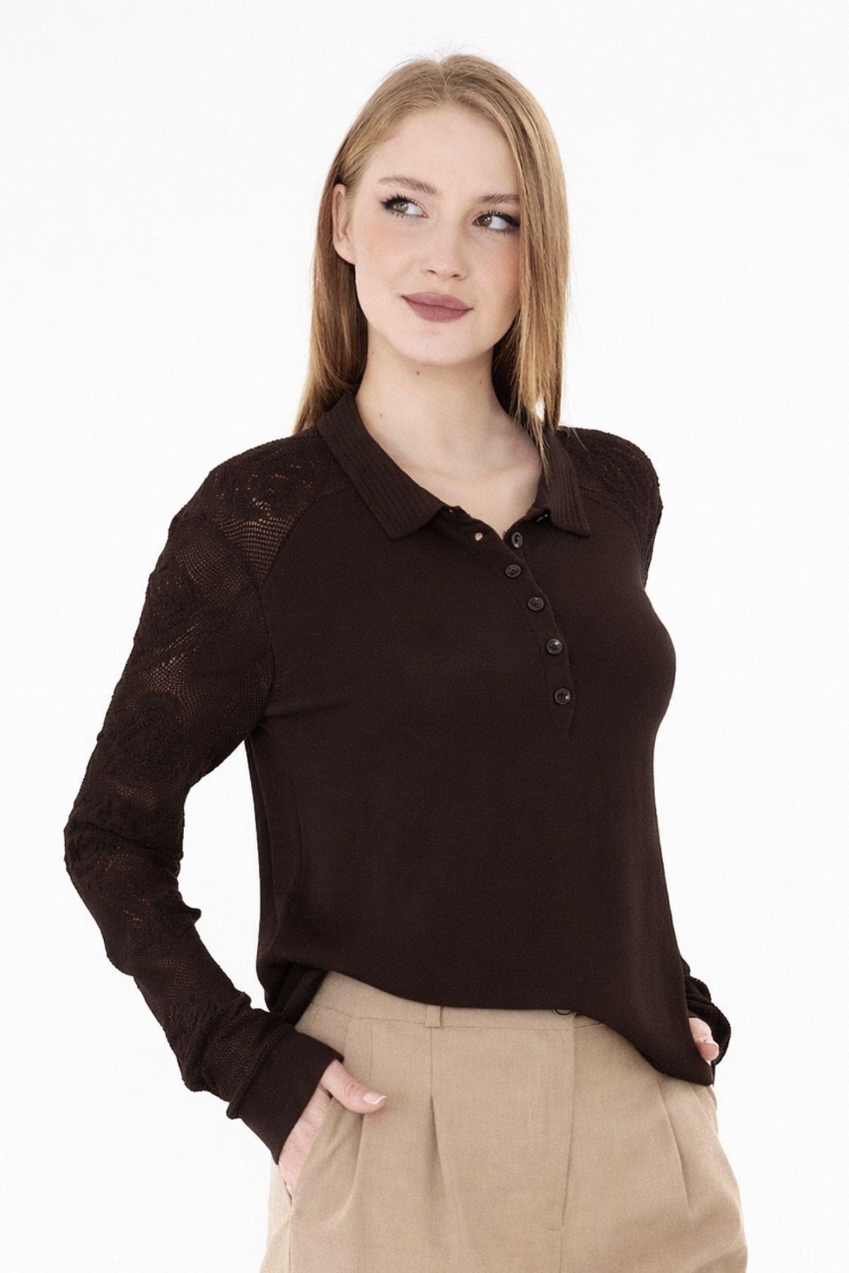 Irmak Kerekli Women's Soft Textured Rose Patterned Lace Mesh Polo Neck Knitwear Blouse 953 BROWN | ByTR