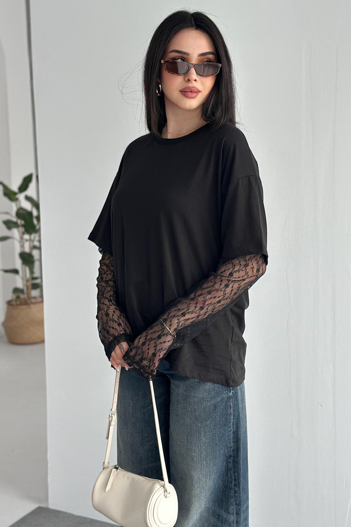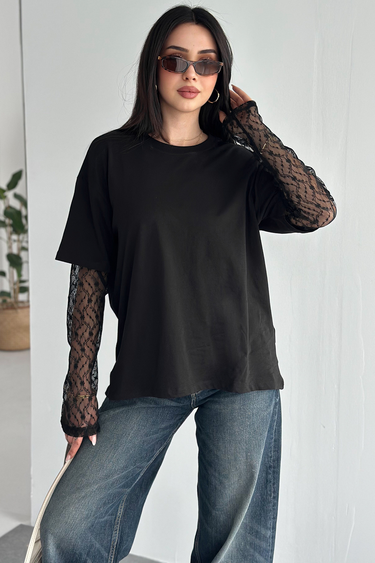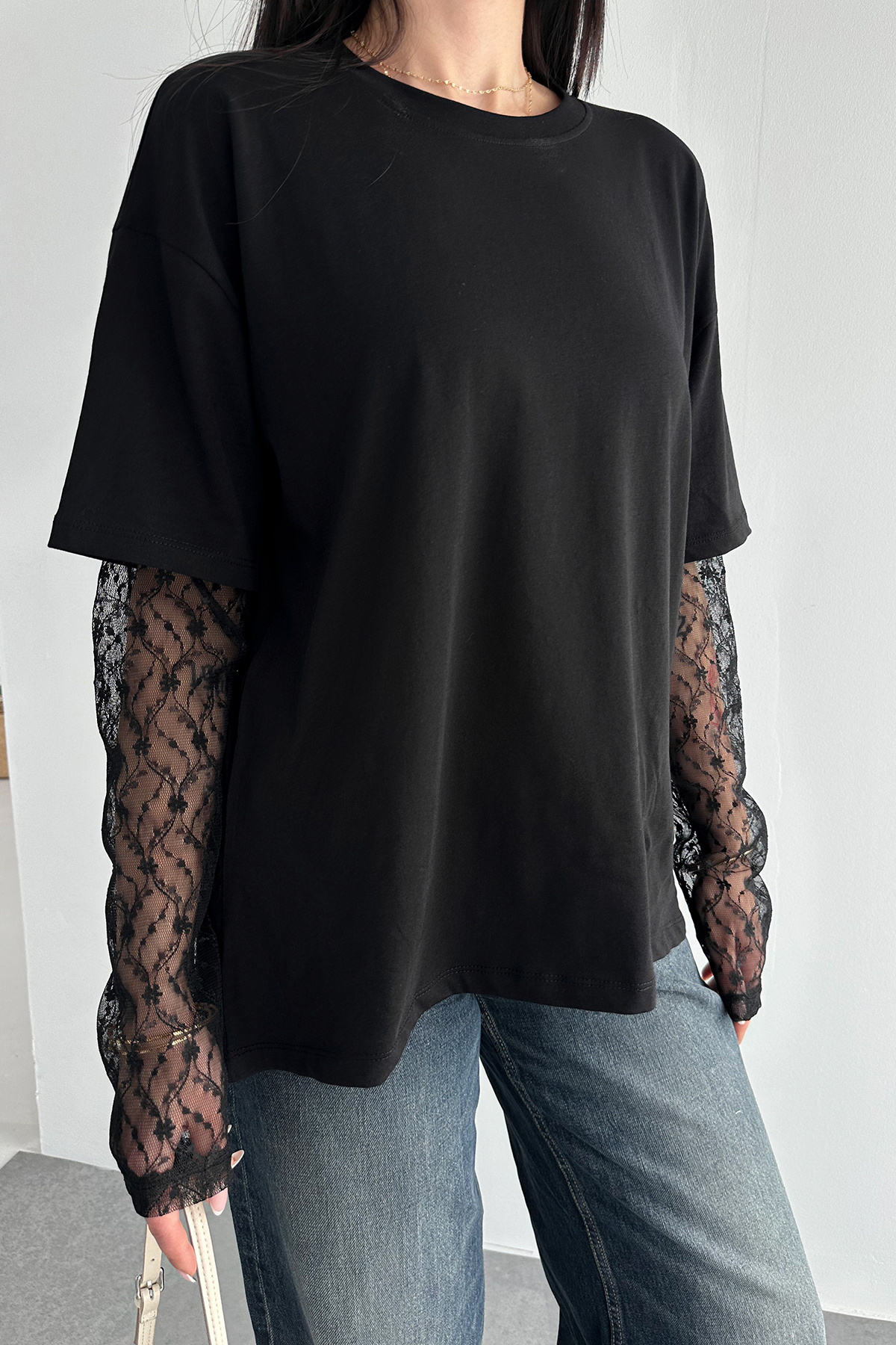 Lace Sleeve T-Shirt – Black Elegance Tee 2689