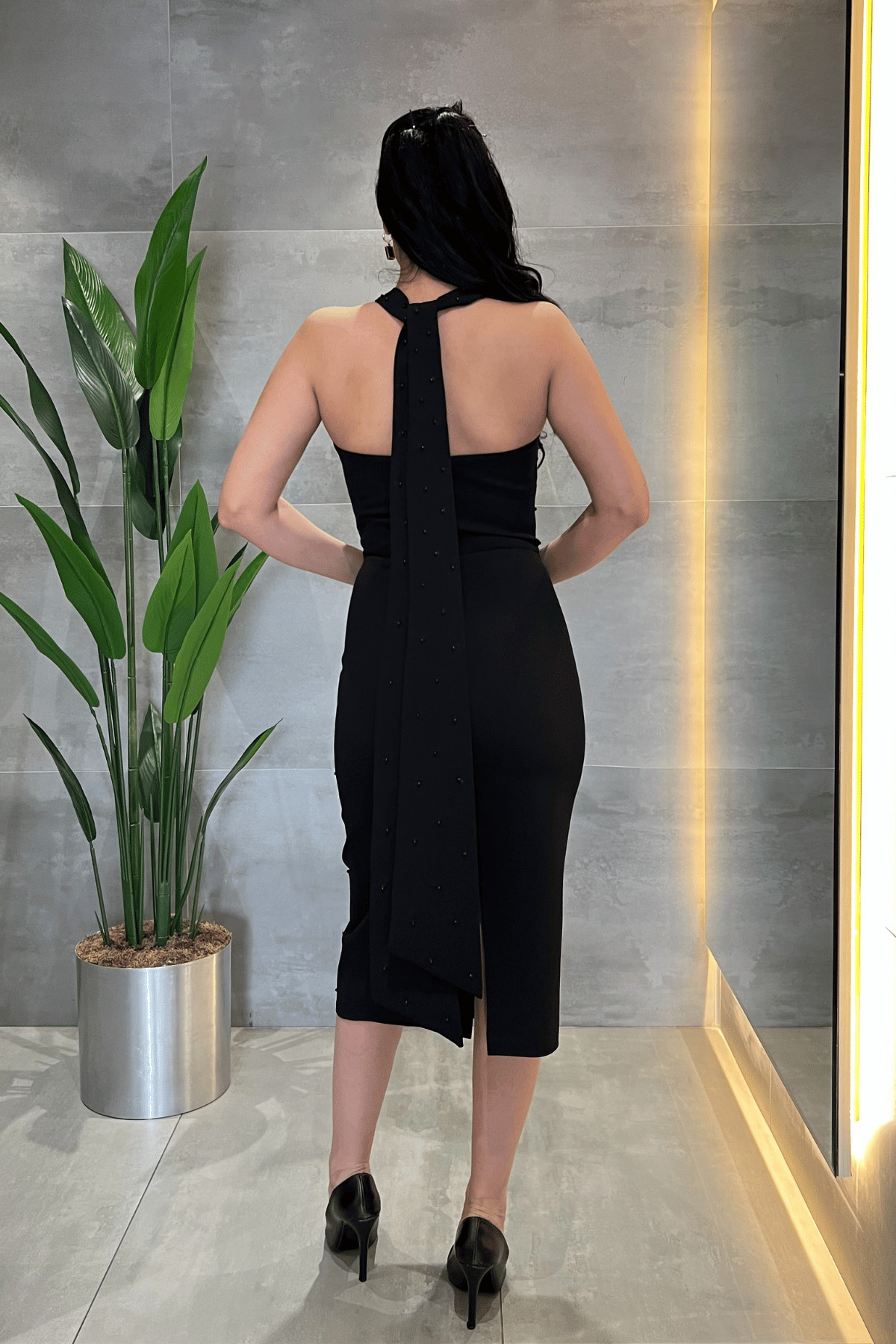 Atlas Fabric Pearl Detailed Tie Neck Dress - BLACK