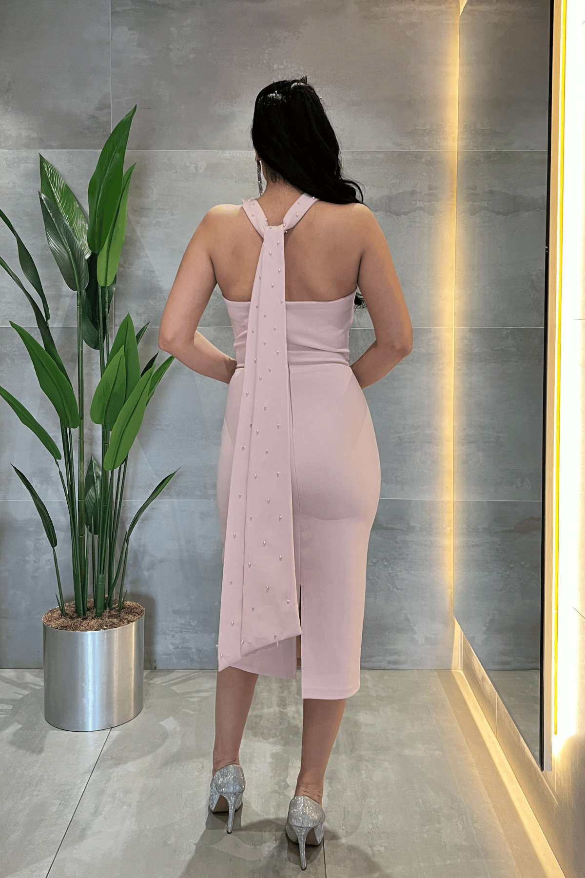 giyimmasalı Atlas Fabric Pearl Detailed Neck Tie Pencil Dress - POWDER | ByTR