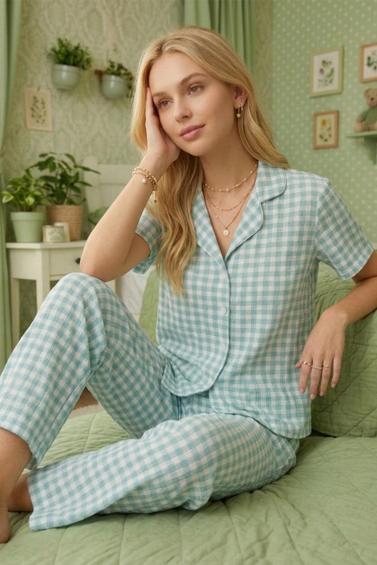 The square patterned pajama set, which offers comfort and elegance together, makes your time at home more enjoyable.