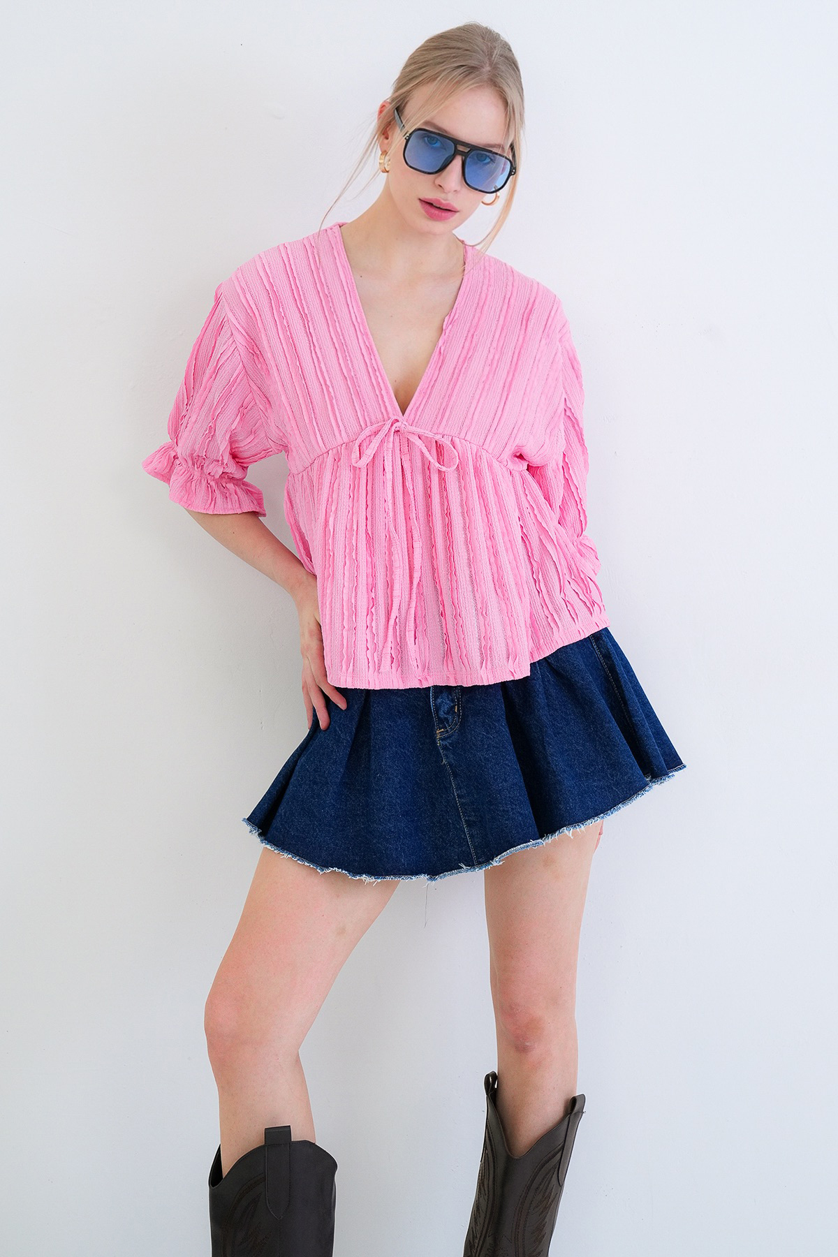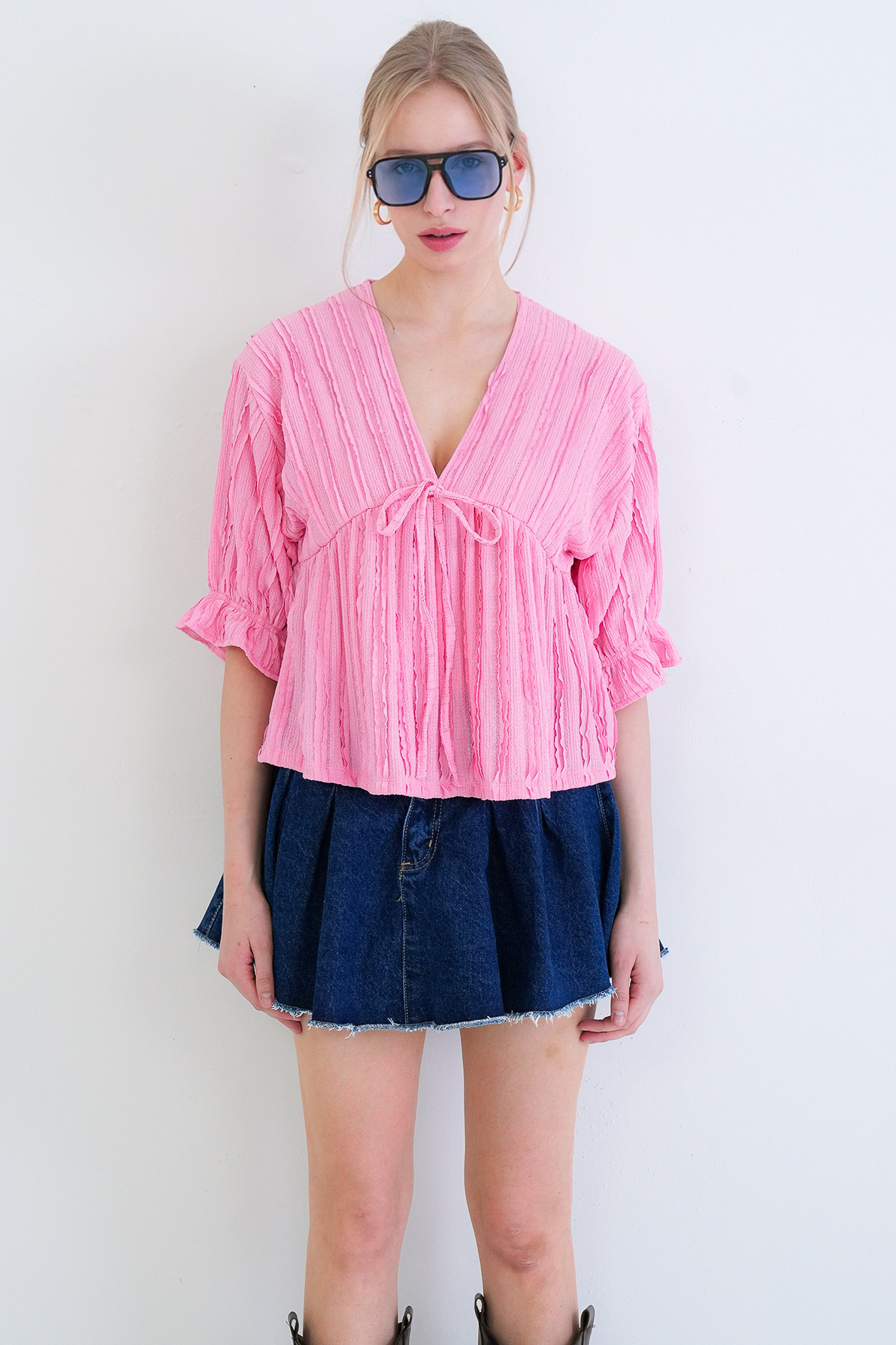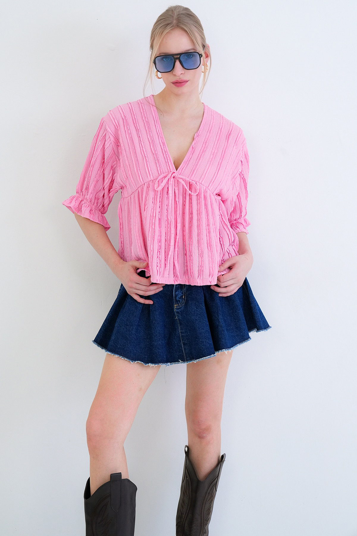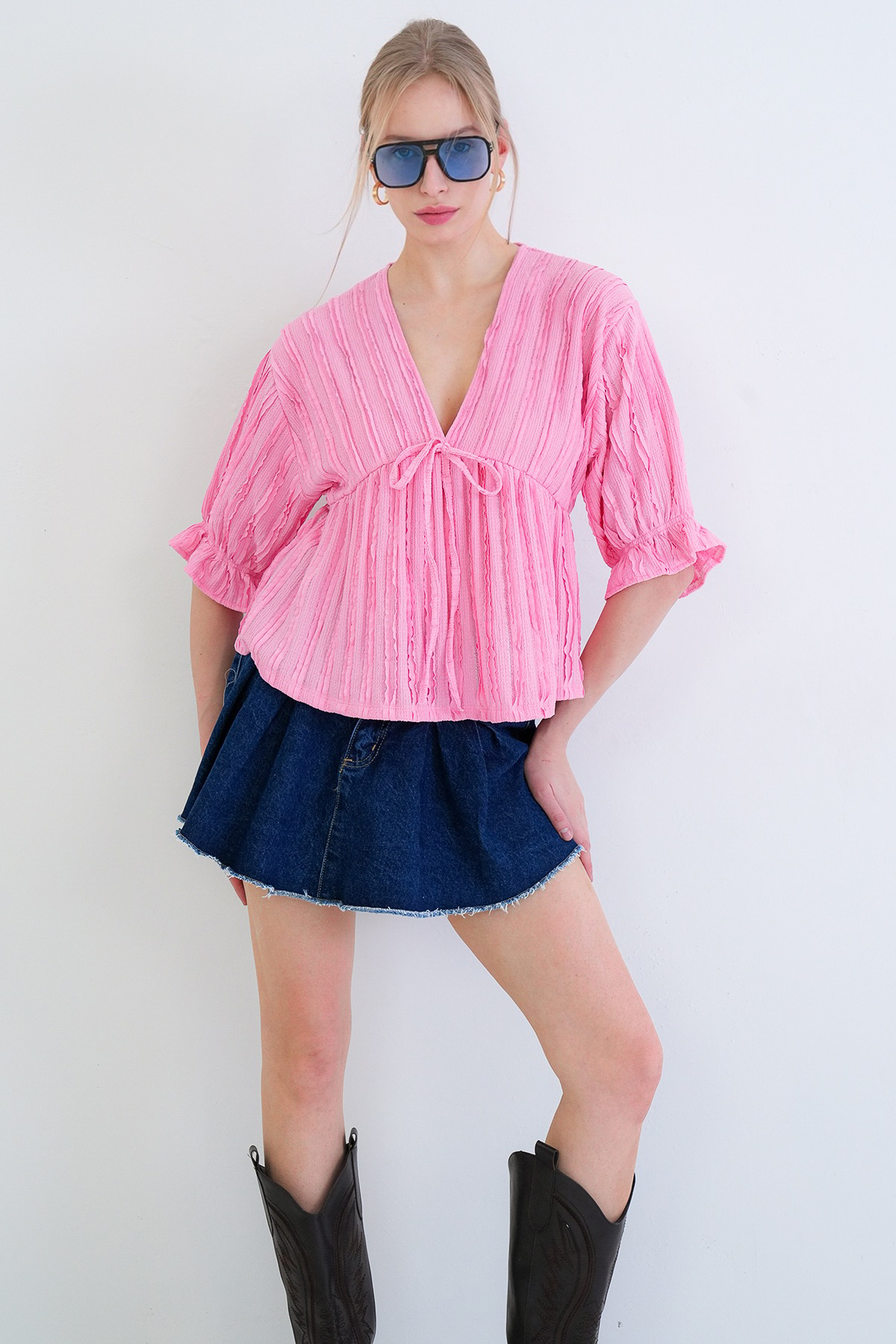 Attracting Attention with its Feminine Lines, This Blouse Offers an Elegant Look with its V-Neck and Ruffle Details.