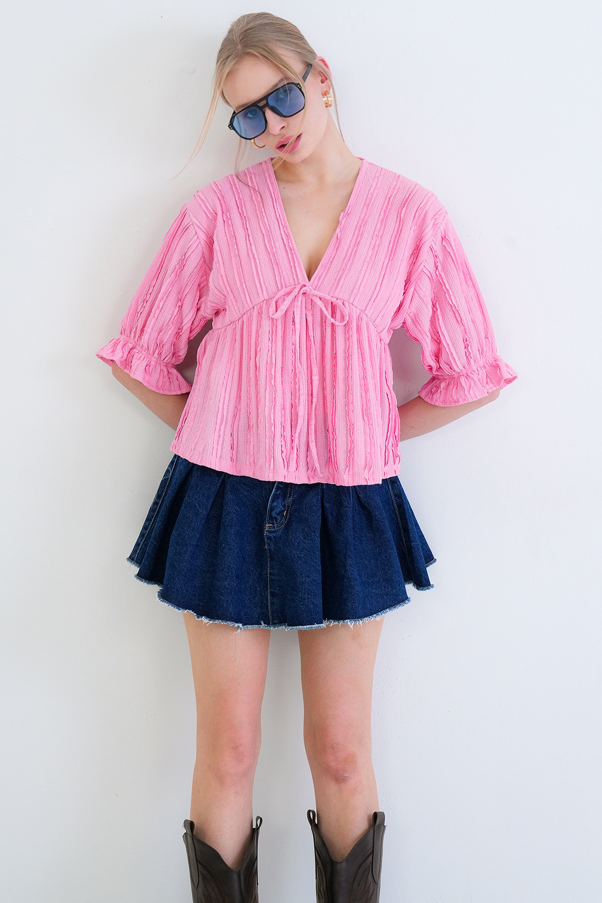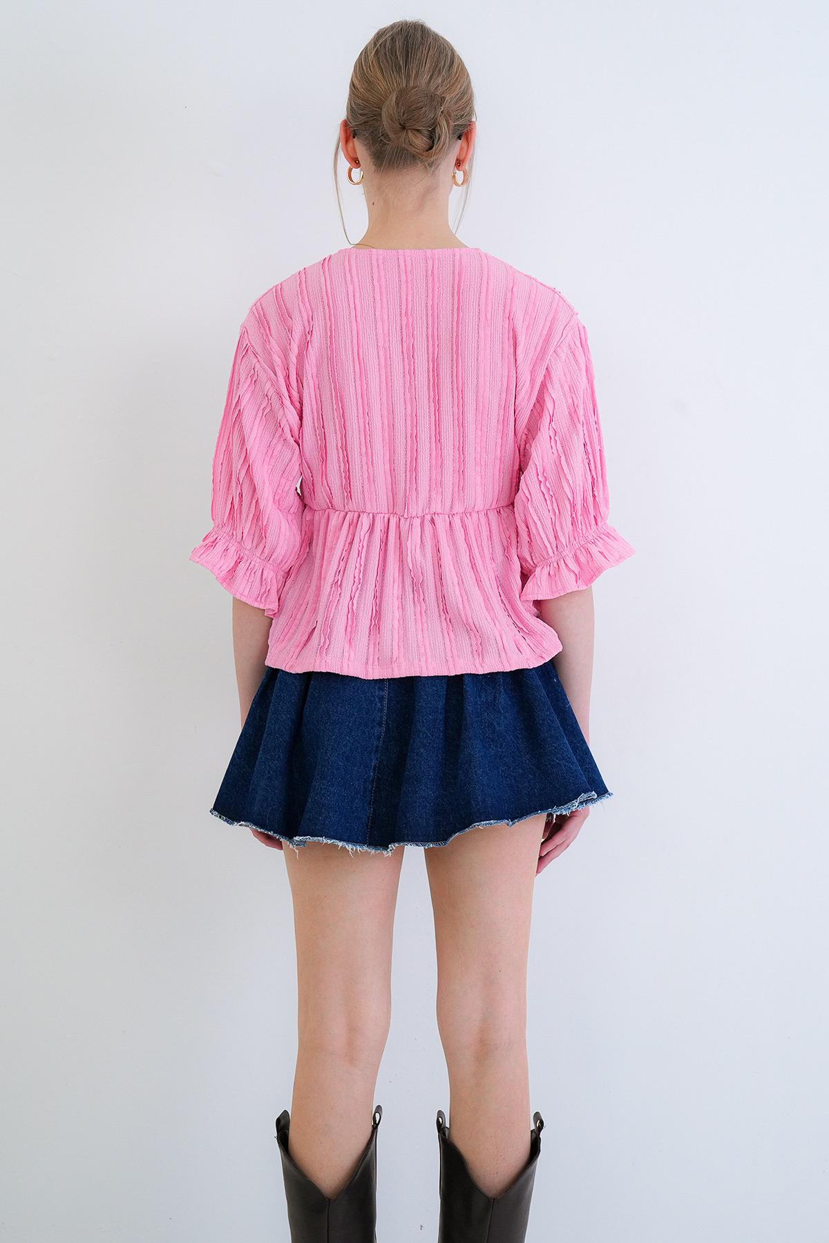 Pink V-Neck Truvakar Sleeve Elastic Ruffle Fabric Blouse ALC-X15414