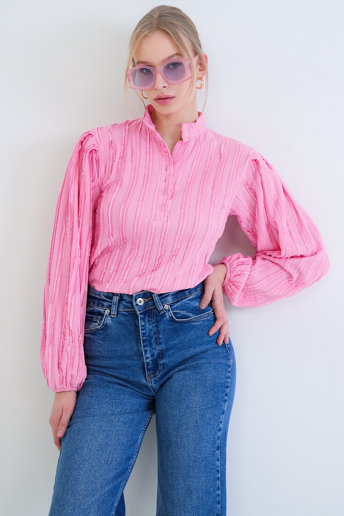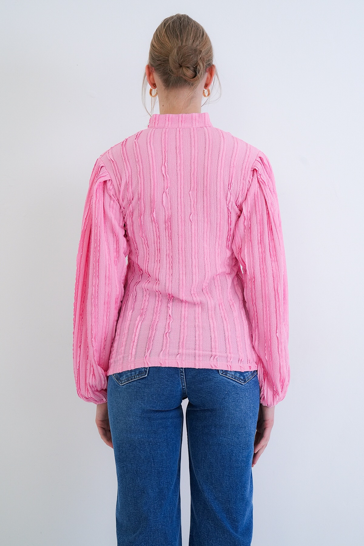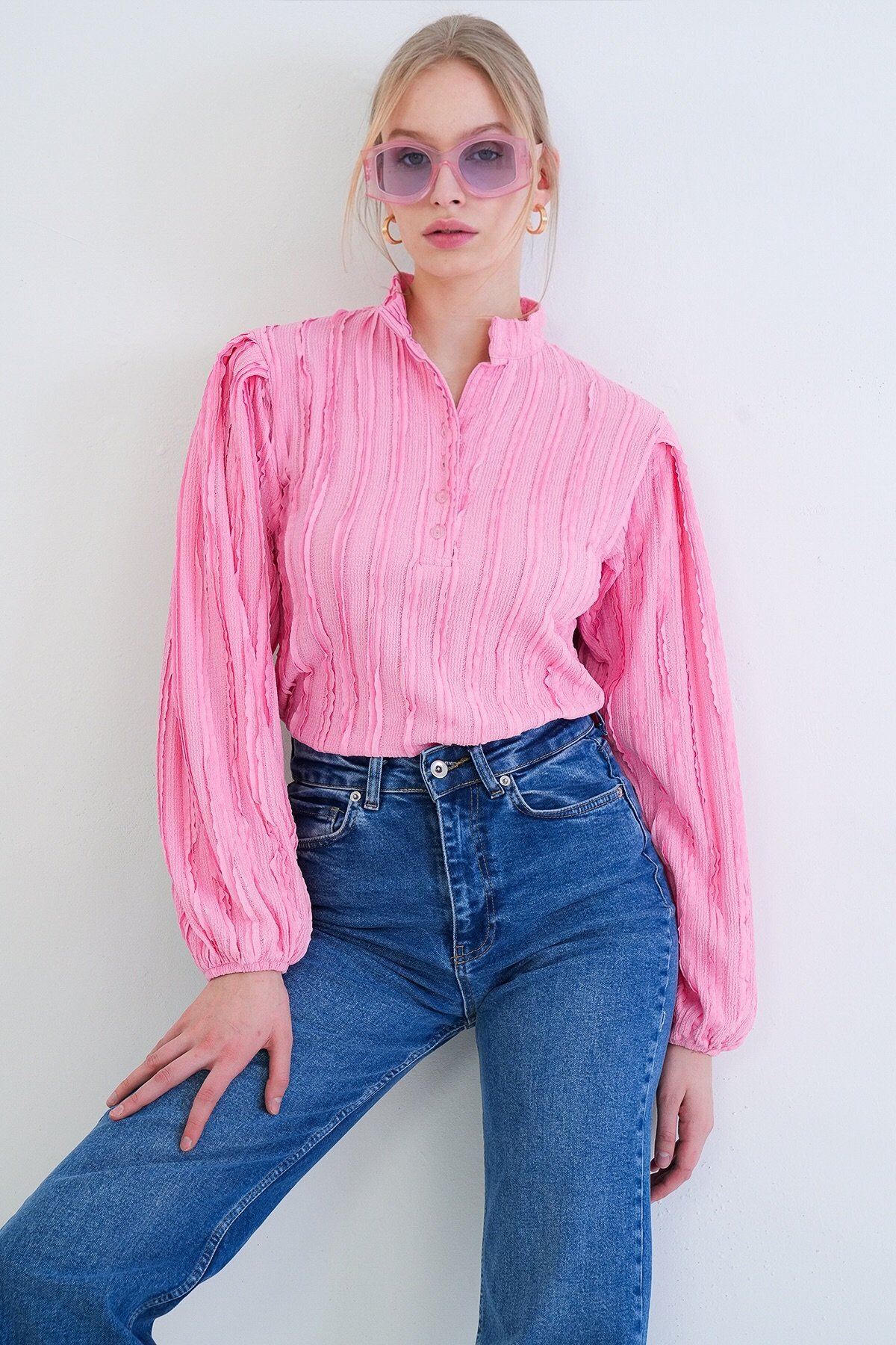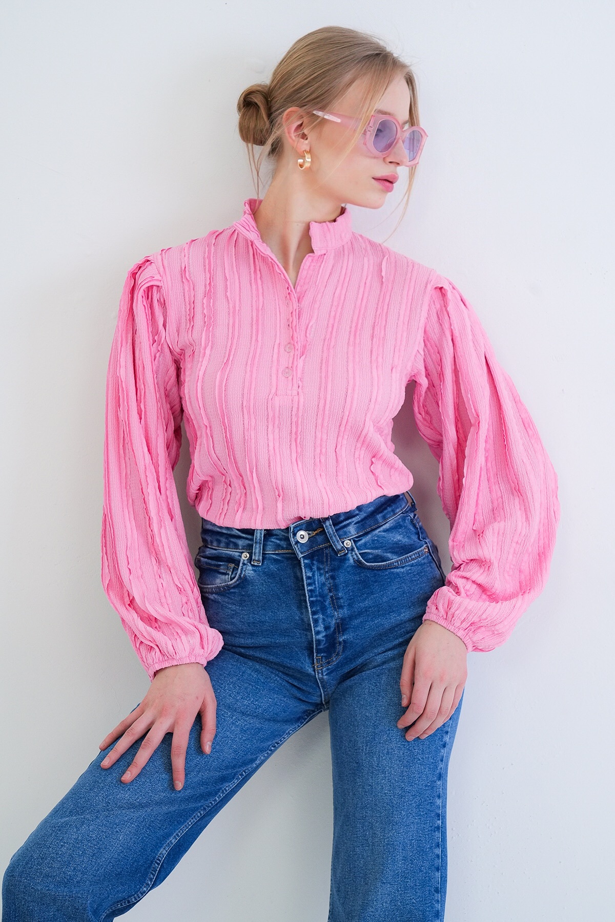 Pink Judge Collar Front Buttoned Balloon Sleeve Ruffle Fabric Shirt Blouse