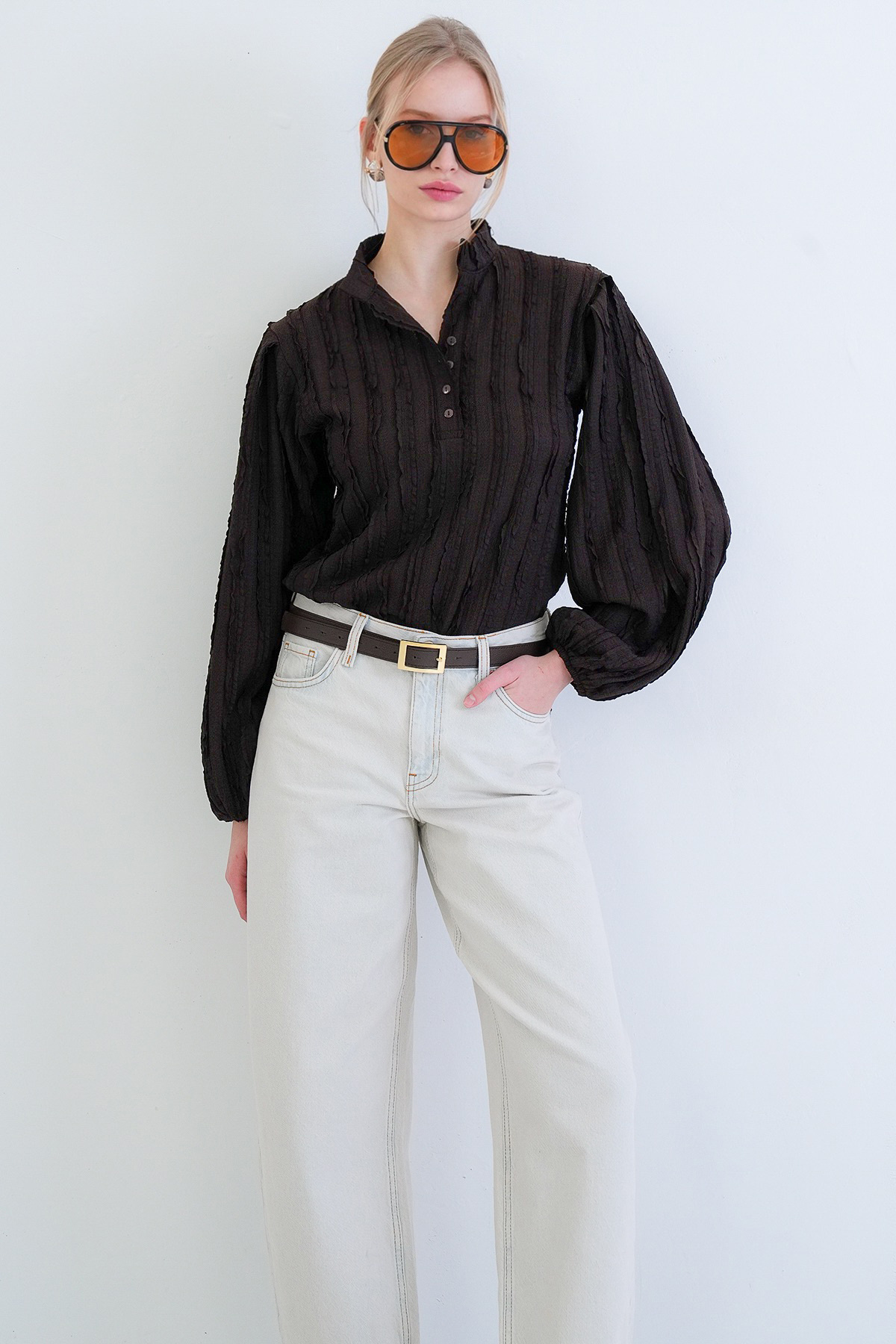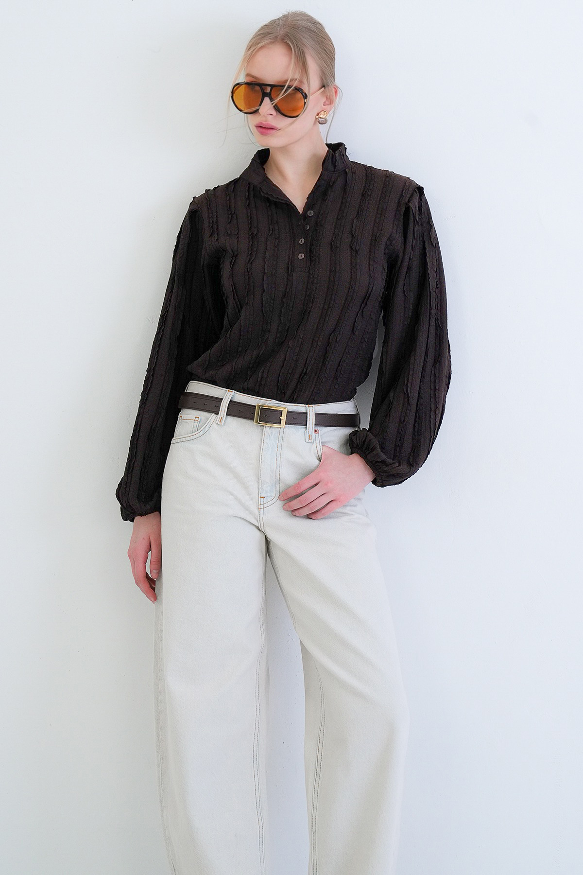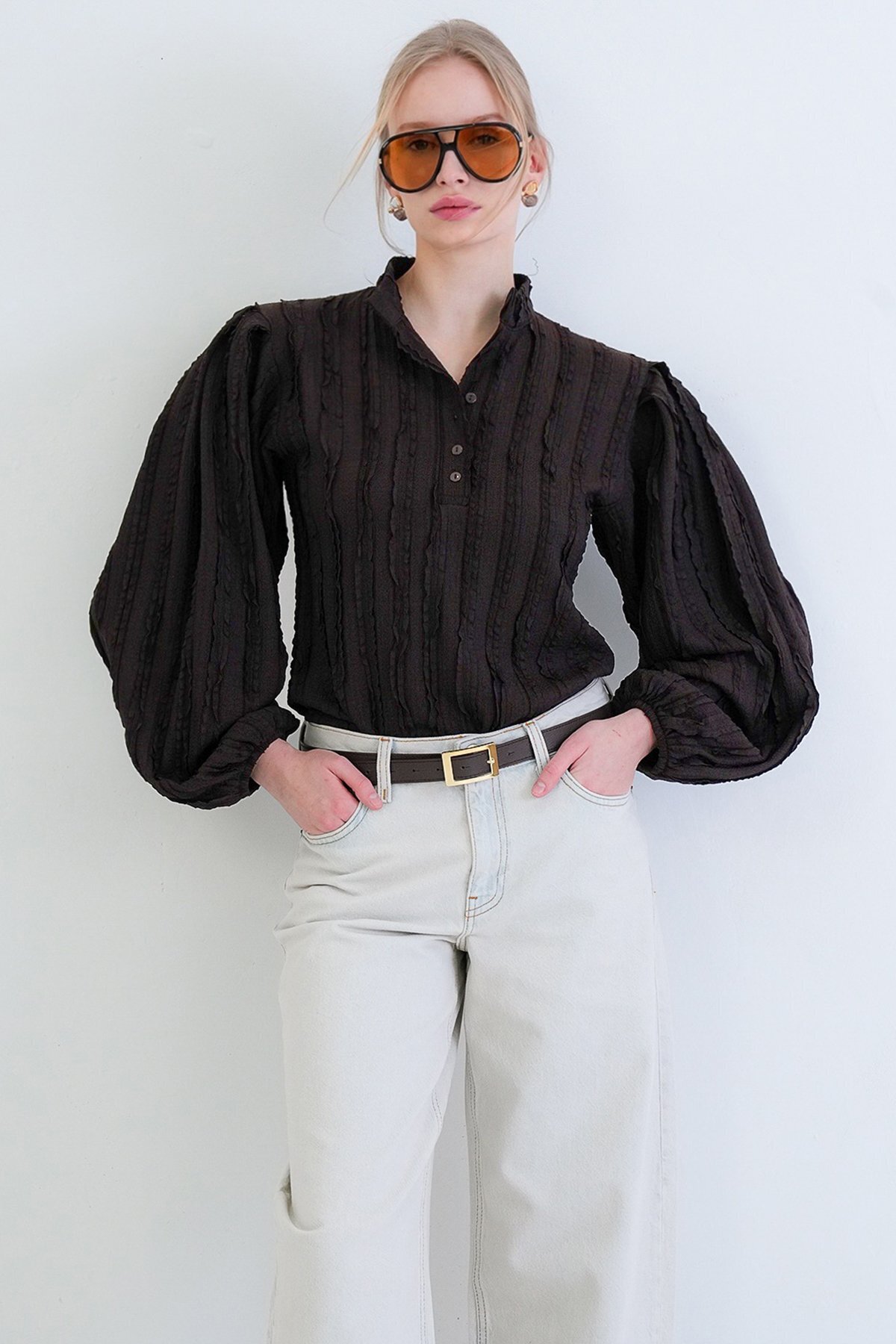 Bitter Coffee Dominant Collar Front Buttoned Balloon Sleeve Ruffle Fabric Shirt Blouse