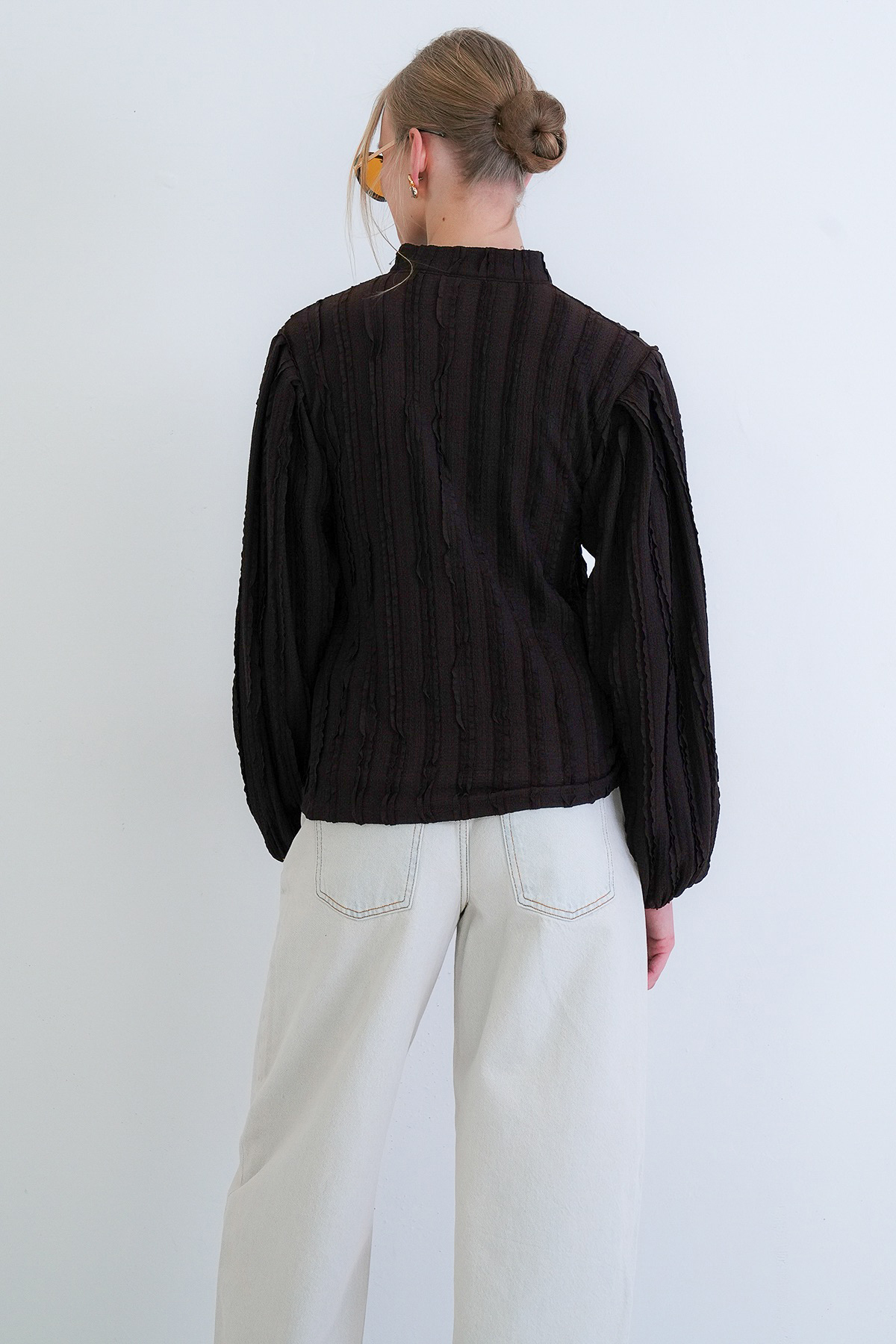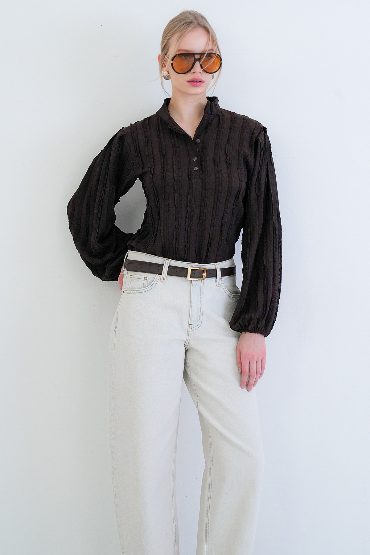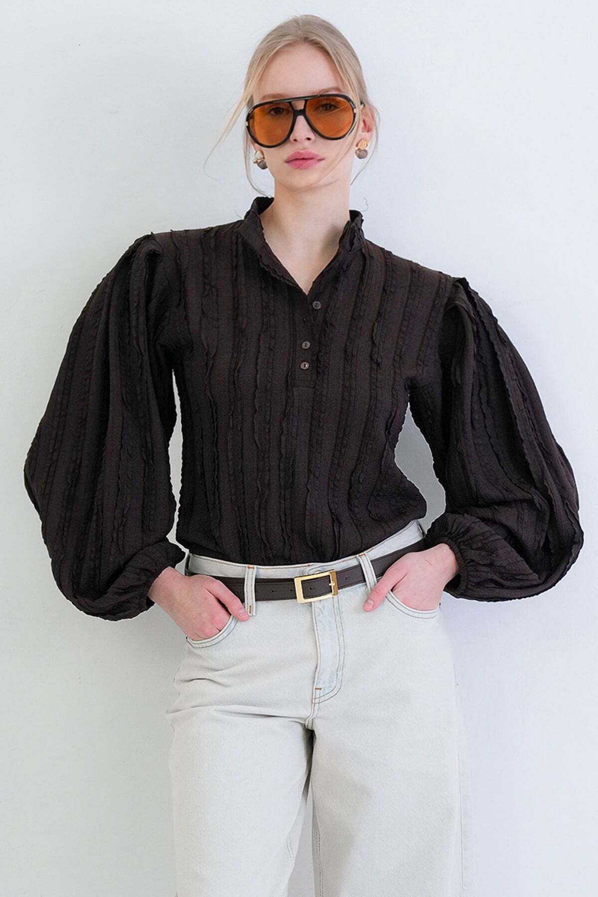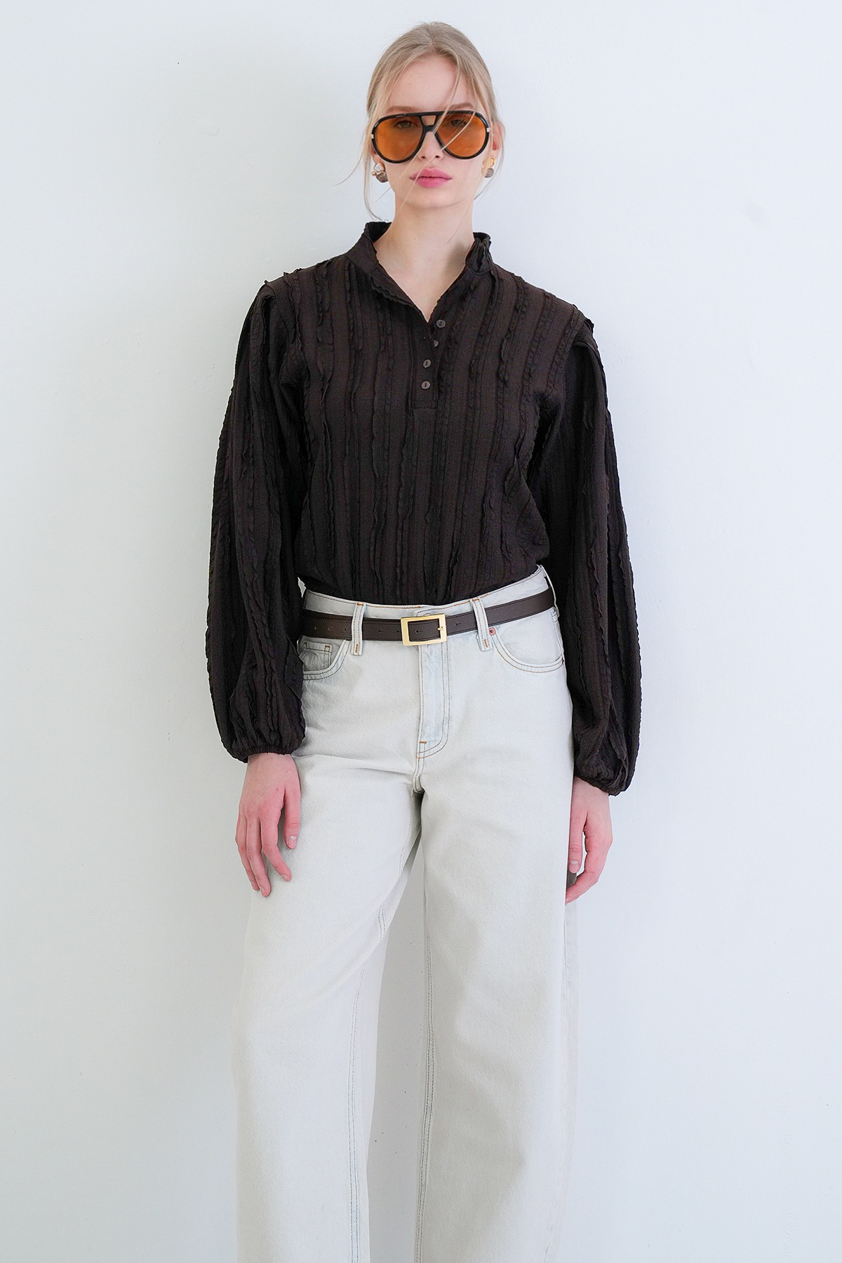 Bitter Coffee Dominant Collar Front Buttoned Balloon Sleeve Ruffle Fabric Shirt Blouse