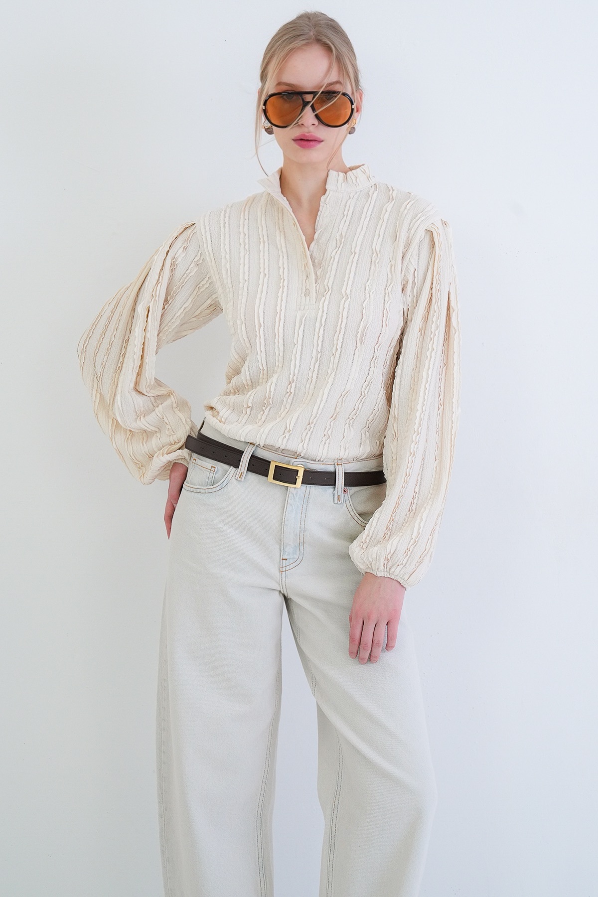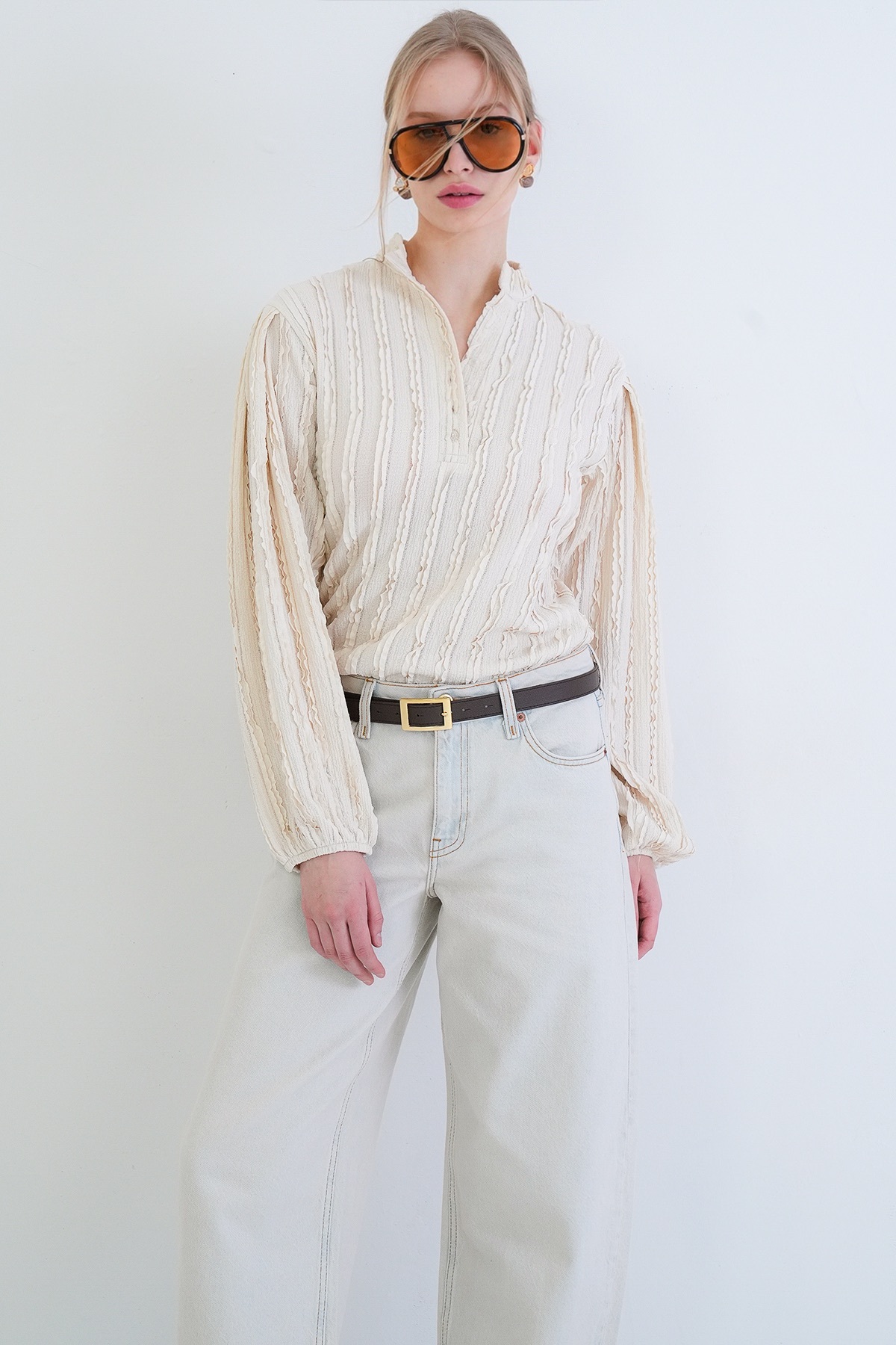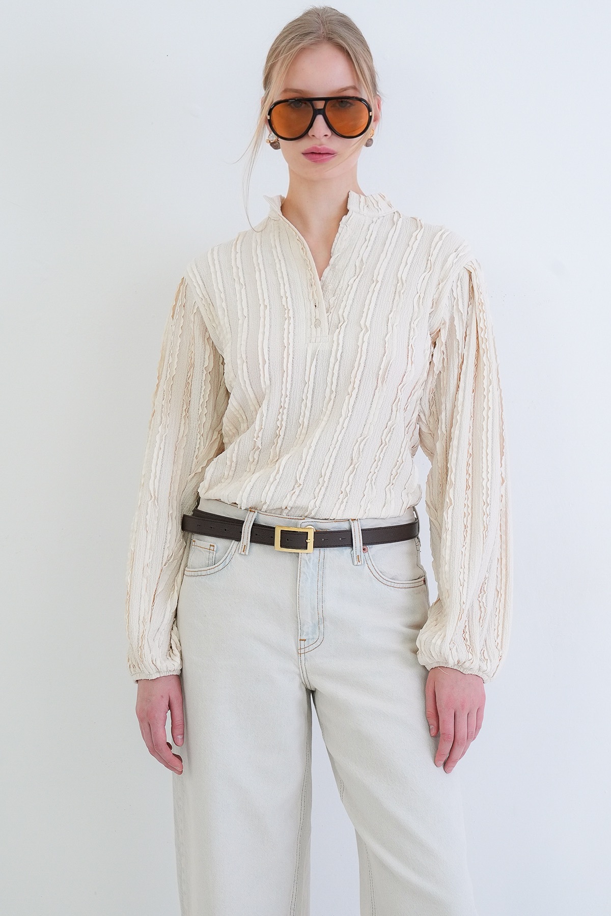 Ecru Judge Collar Front Buttoned Balloon Sleeve Ruffle Fabric Shirt Blouse
