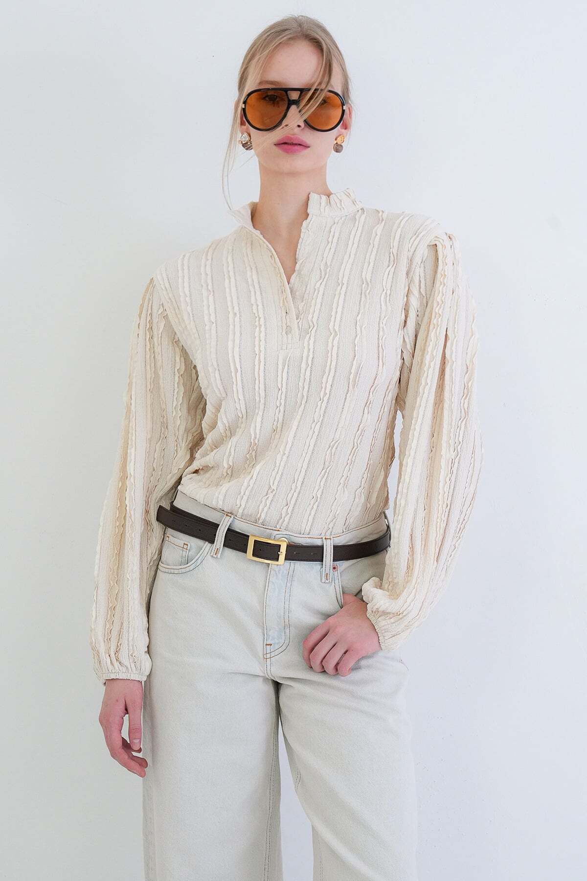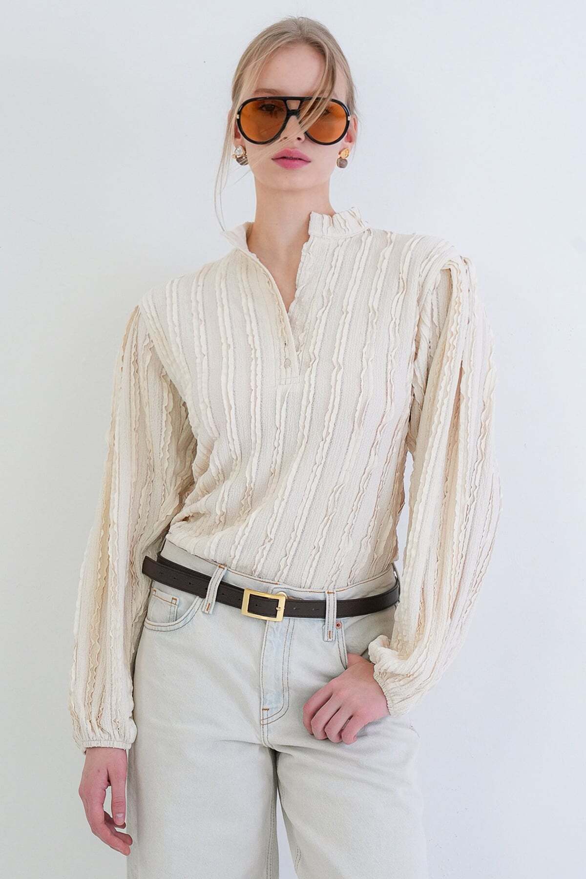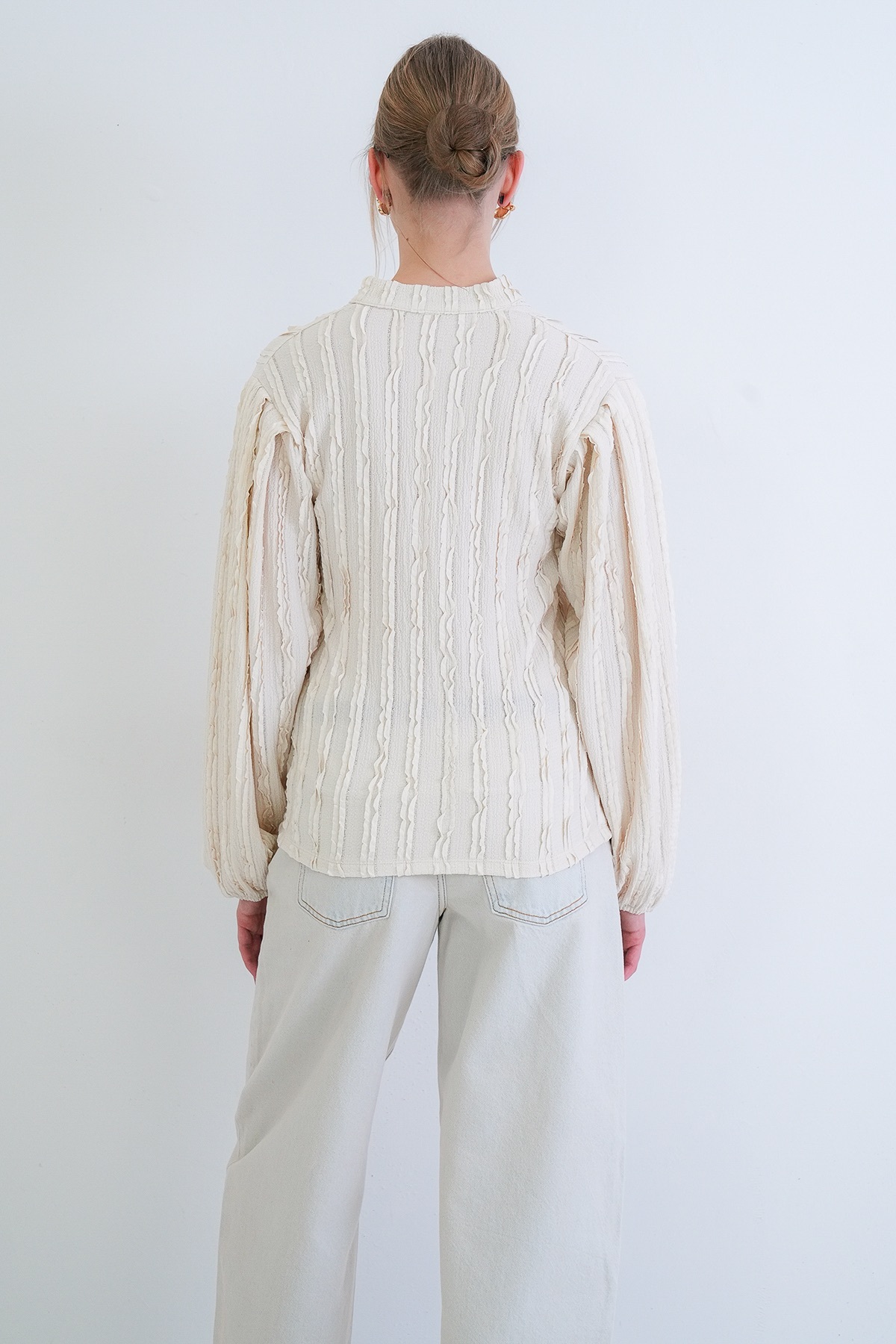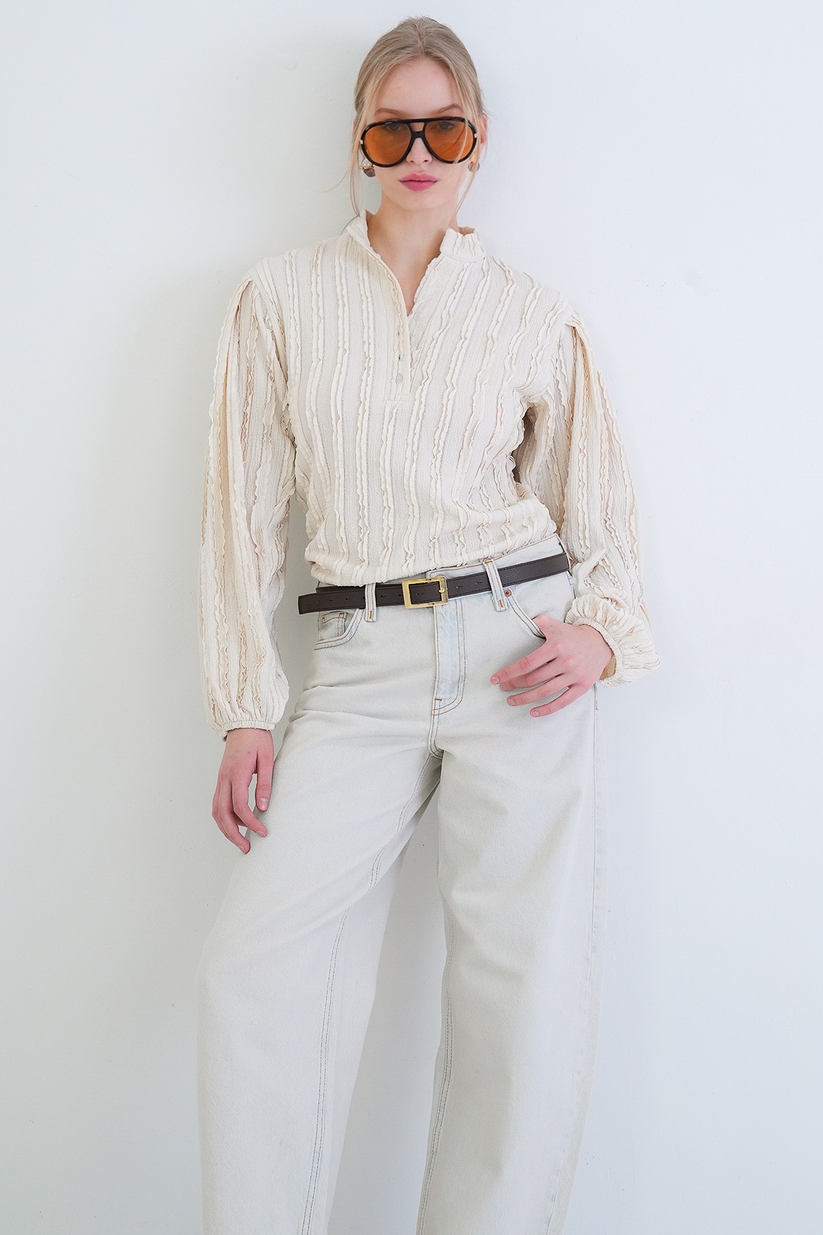 Ecru Judge Collar Front Buttoned Balloon Sleeve Ruffle Fabric Shirt Blouse