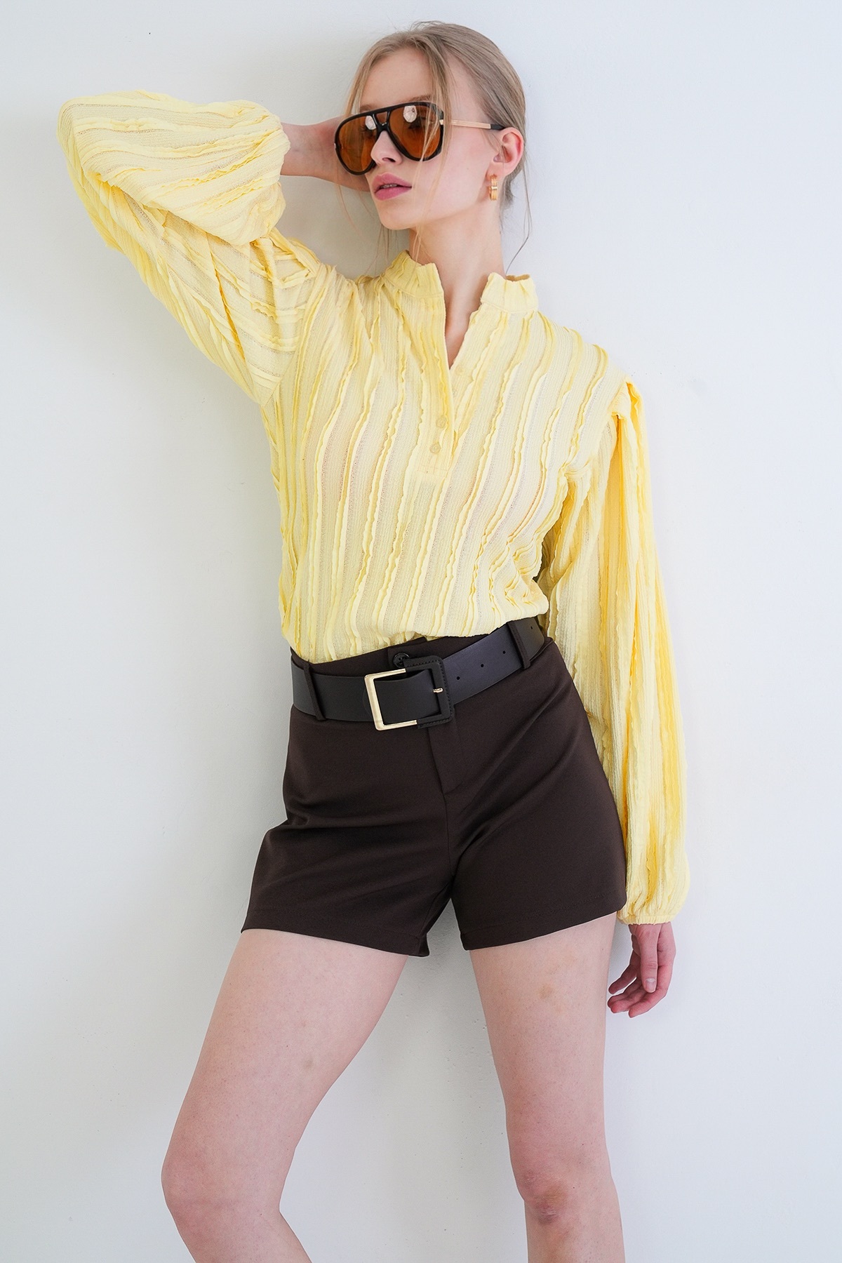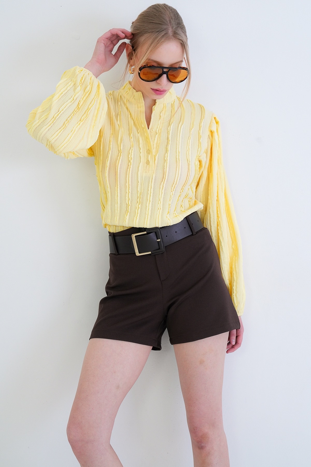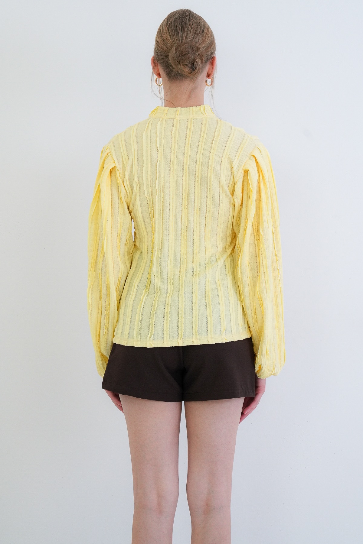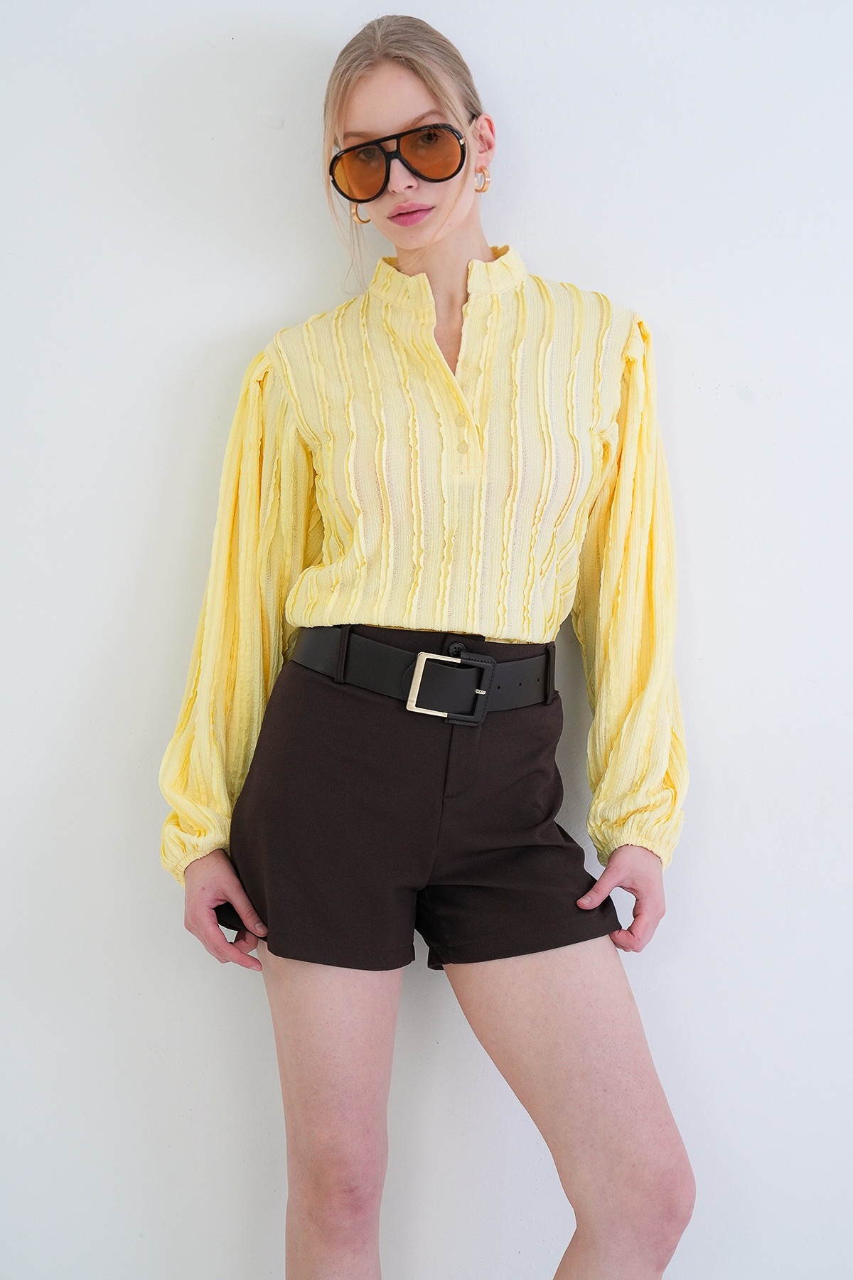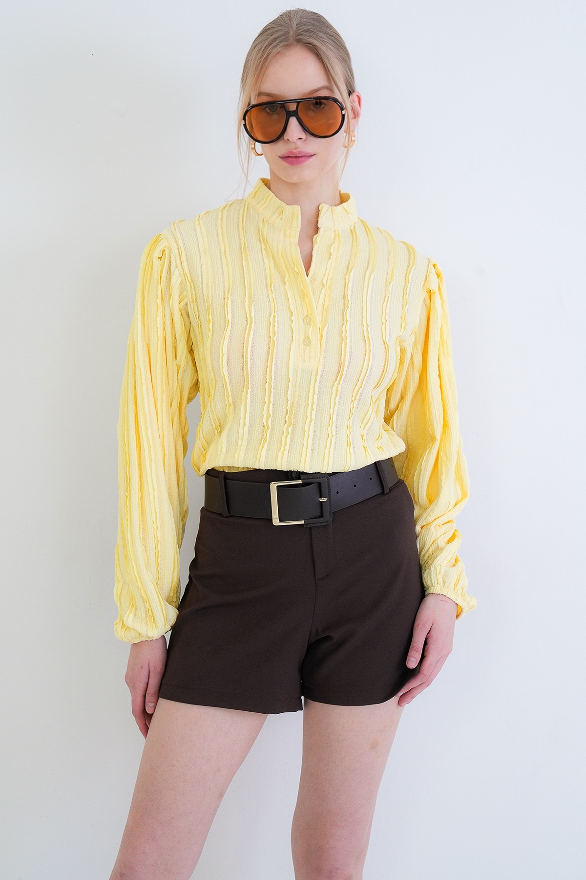 Yellow Judge Collar Front Buttoned Balloon Sleeve Ruffle Fabric Shirt Blouse