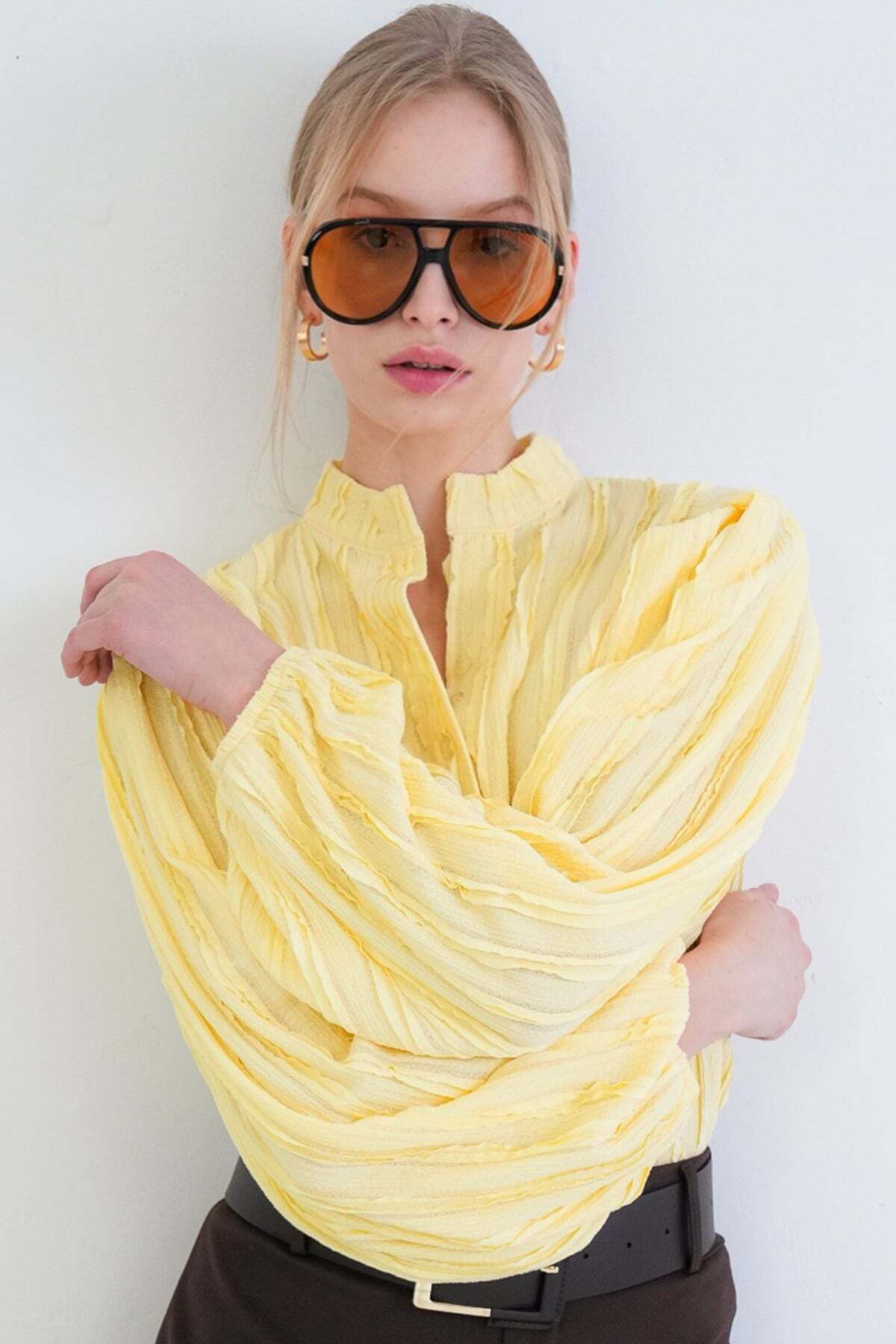 Standing Out With Feminine Lines, This Blouse Offers An Elegant Look With Its Dominant Collar And Balloon Sleeve Design.