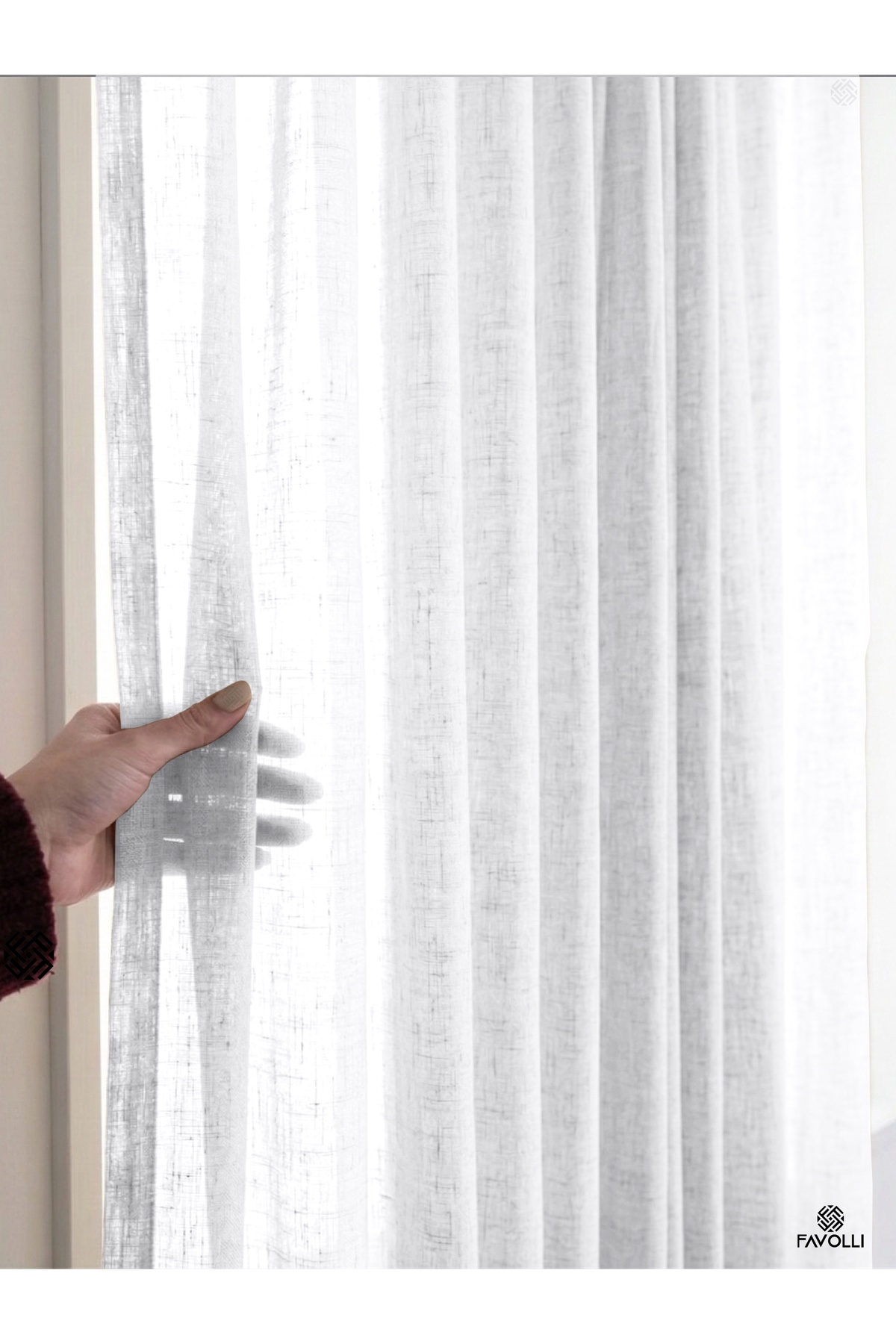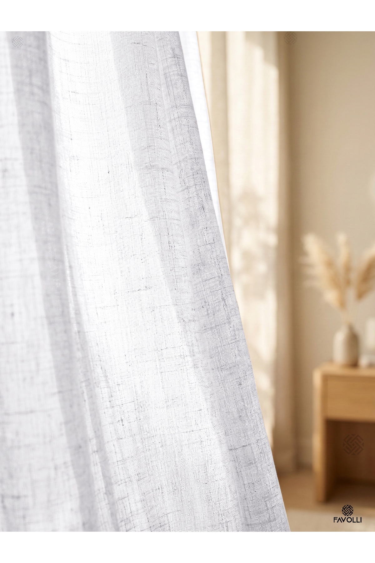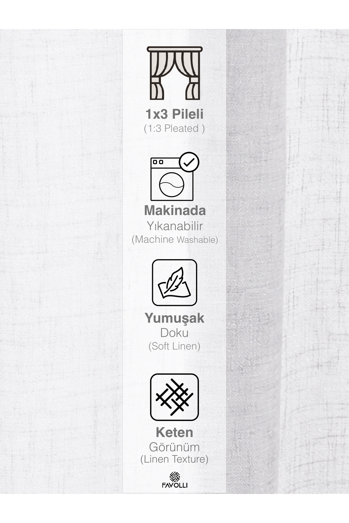 Fabric Specifications 100% polyester linen look tulle fabric Durable and long-lasting structure High air permeability A quality woven fabric Modern and elegant appearance 1 to 3 Frequent Pleat Feature Our product is produced as 1 to 3 frequent pleat (original pipe pleat).