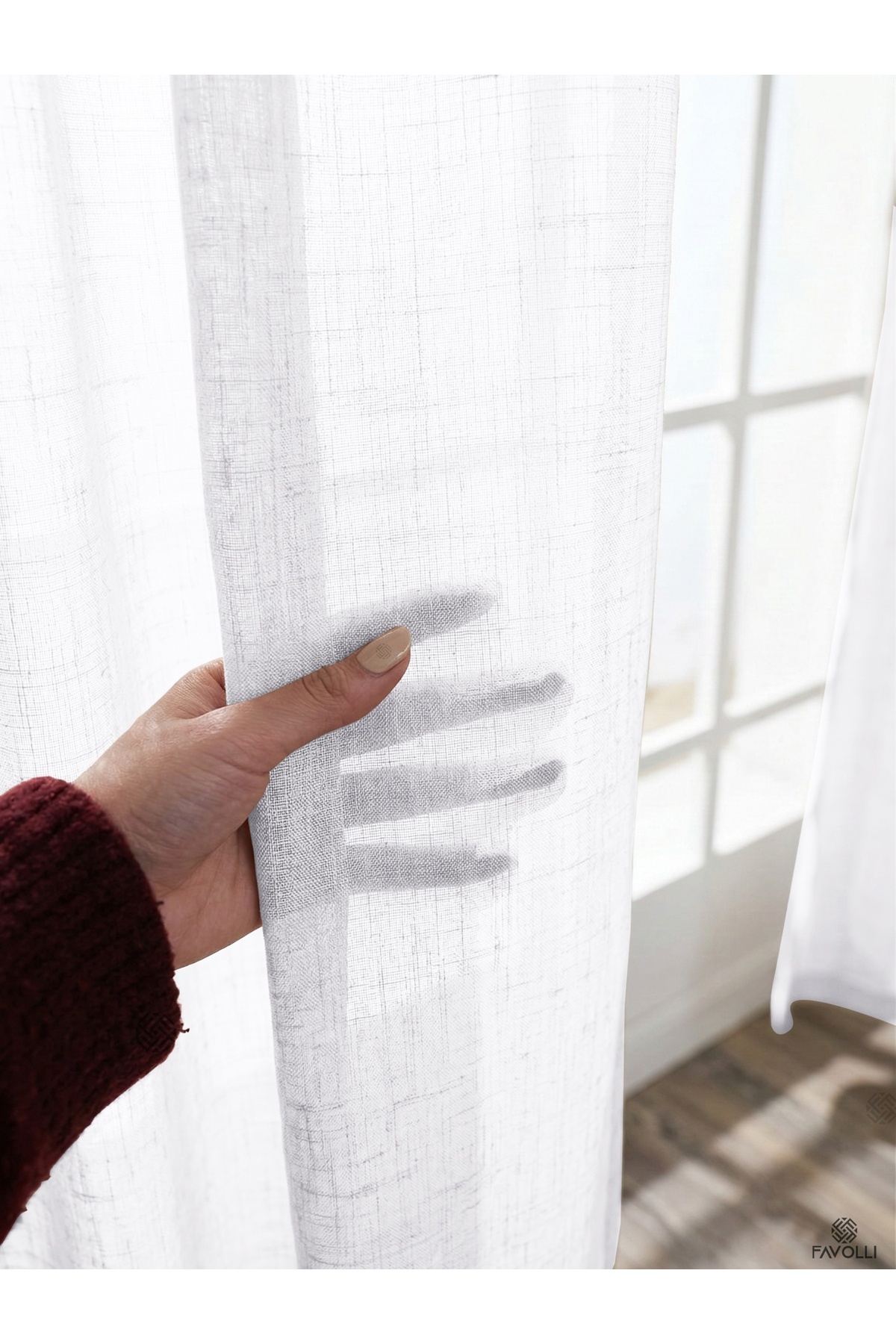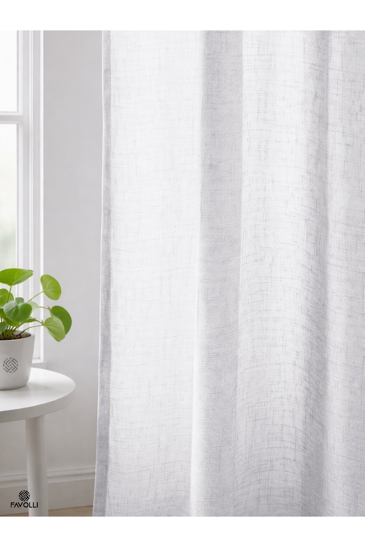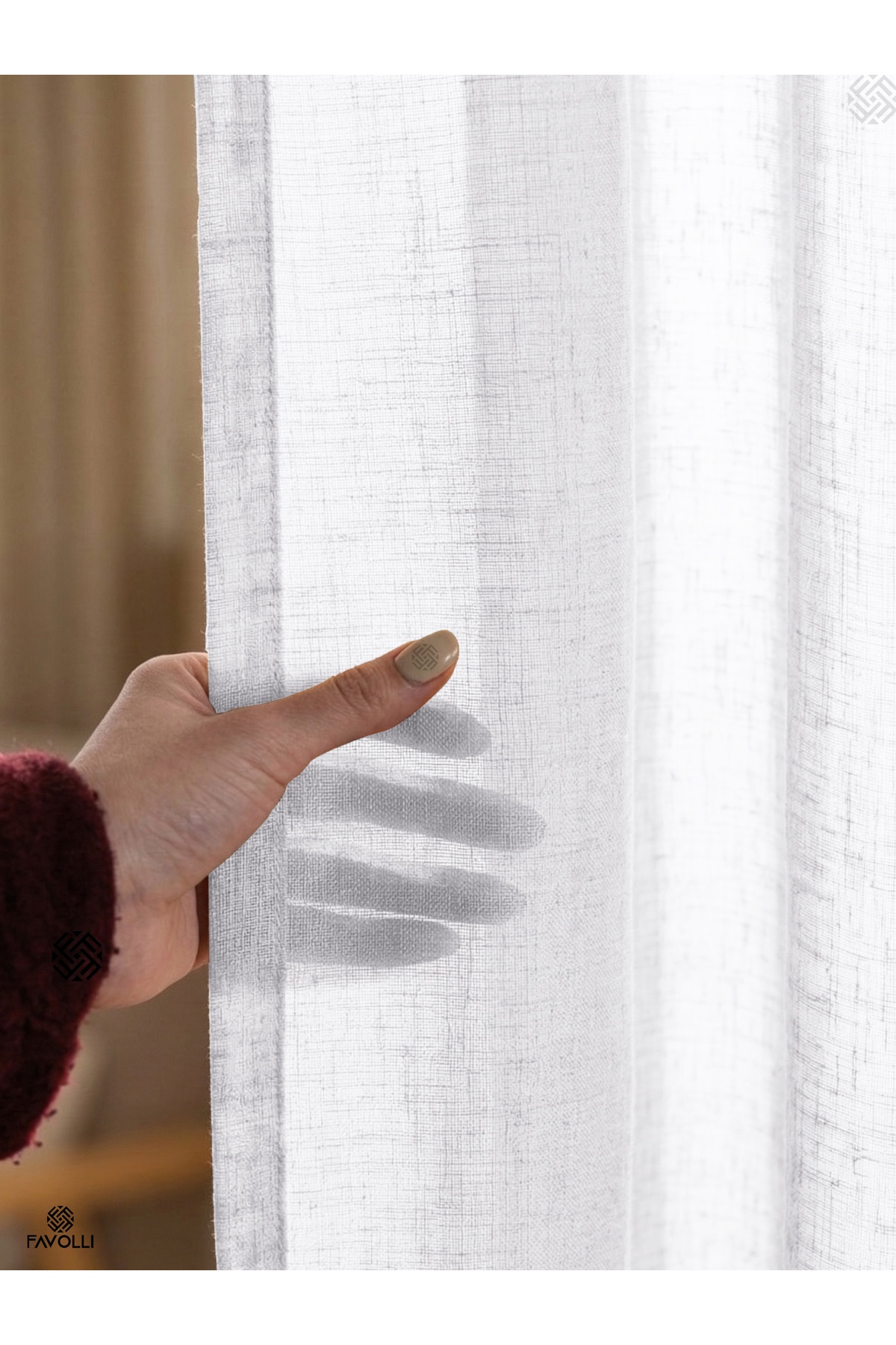 Fabric Specifications 100% polyester linen look tulle fabric Durable and long-lasting structure High air permeability A quality woven fabric Modern and elegant appearance 1 to 3 Frequent Pleat Feature Our product is produced as 1 to 3 frequent pleat (original pipe pleat).