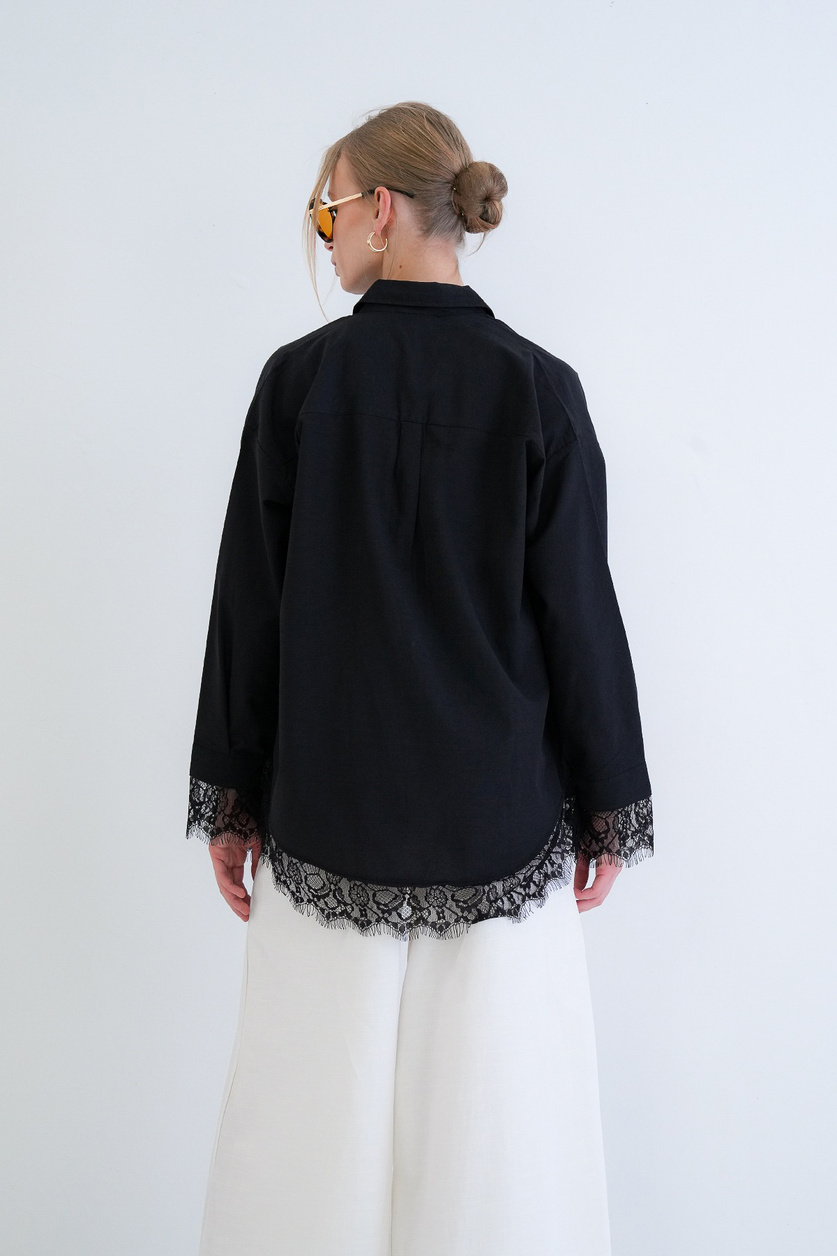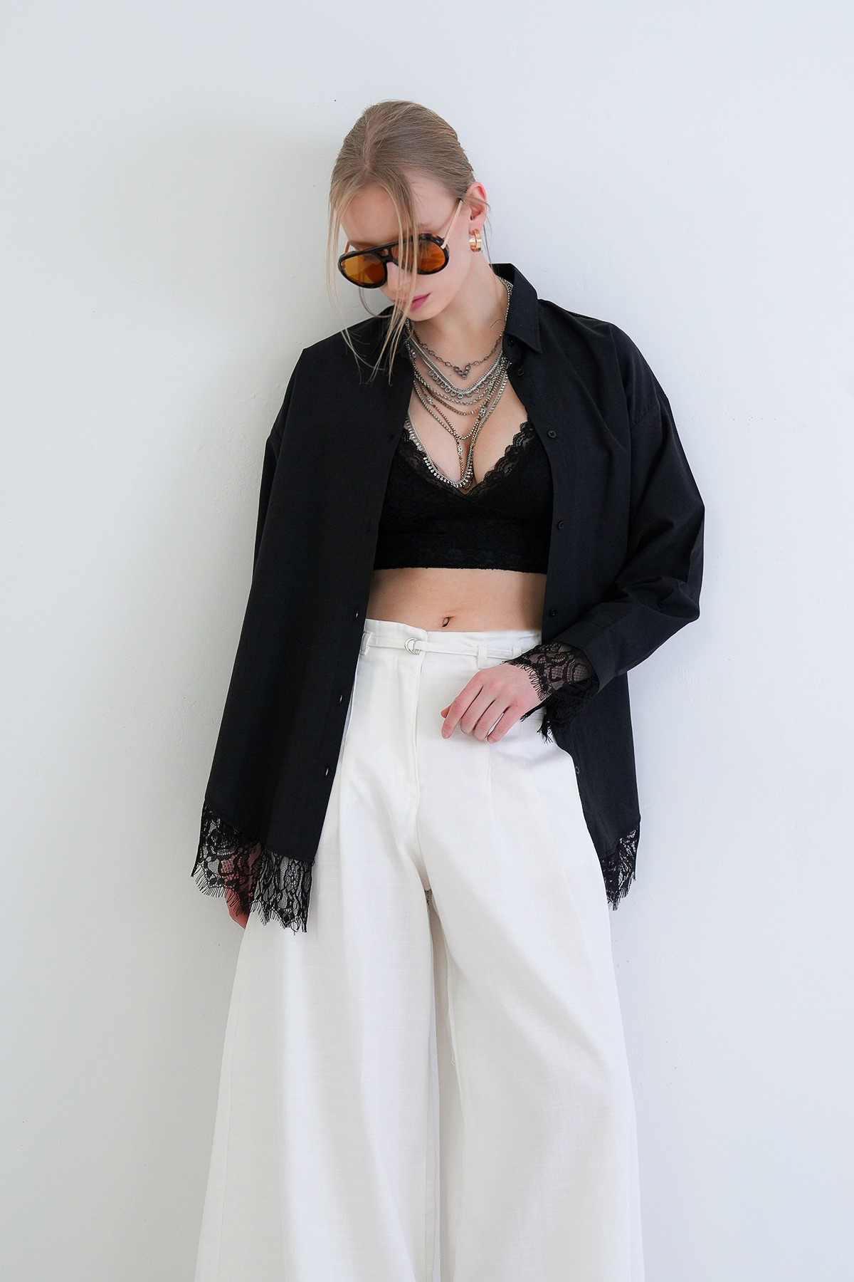Trend Alaçatı Stili Oversize Poplin Shirt with Black Skirt and Cuffs Lace Detail ALC-X15447 | ByTR