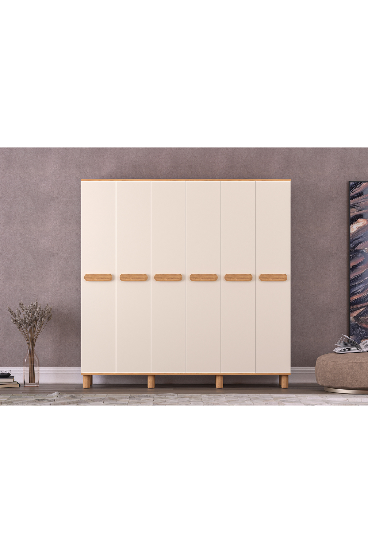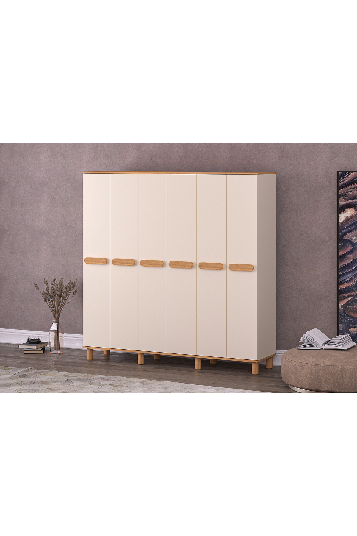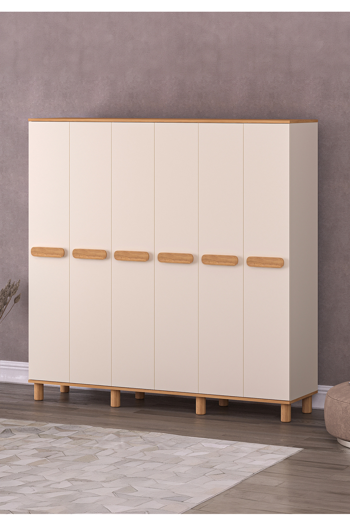 Mila 6 Lid Moonstone - Oak Wardrobe (Bohemian Feet) A stylish touch that will bring freshness and order to your home! Refresh the atmosphere of your living spaces with its modern lines, heartwarming moonstone color and warm oak details.