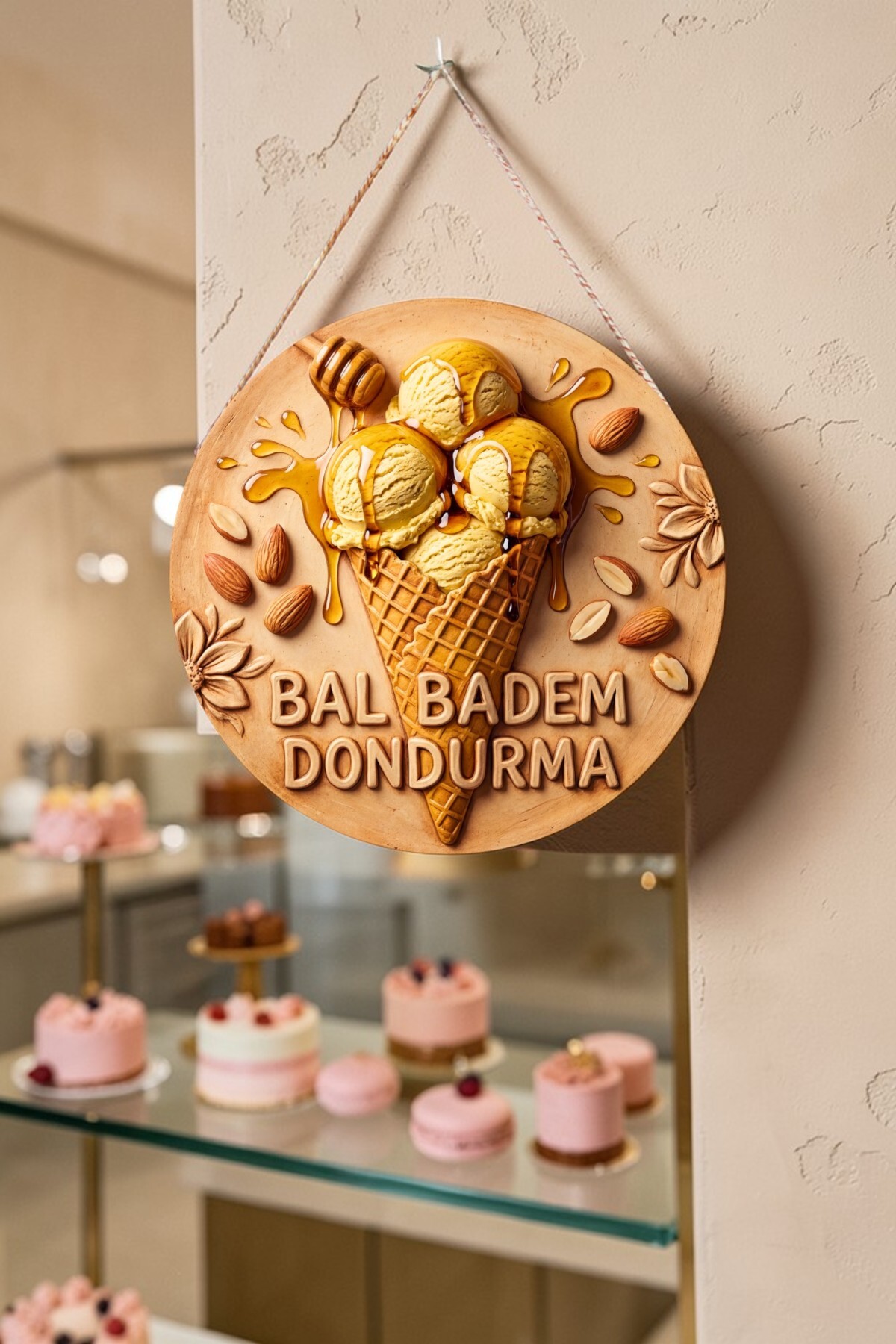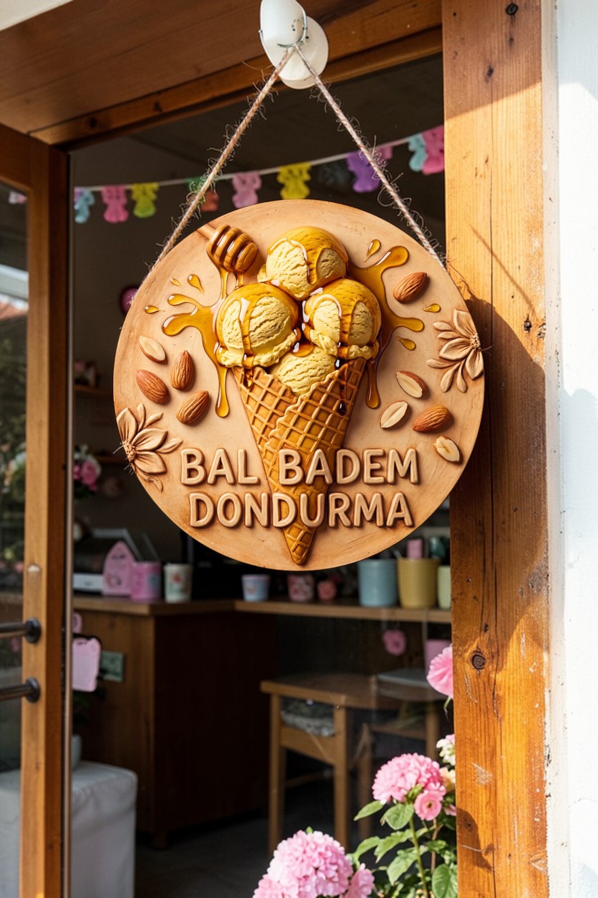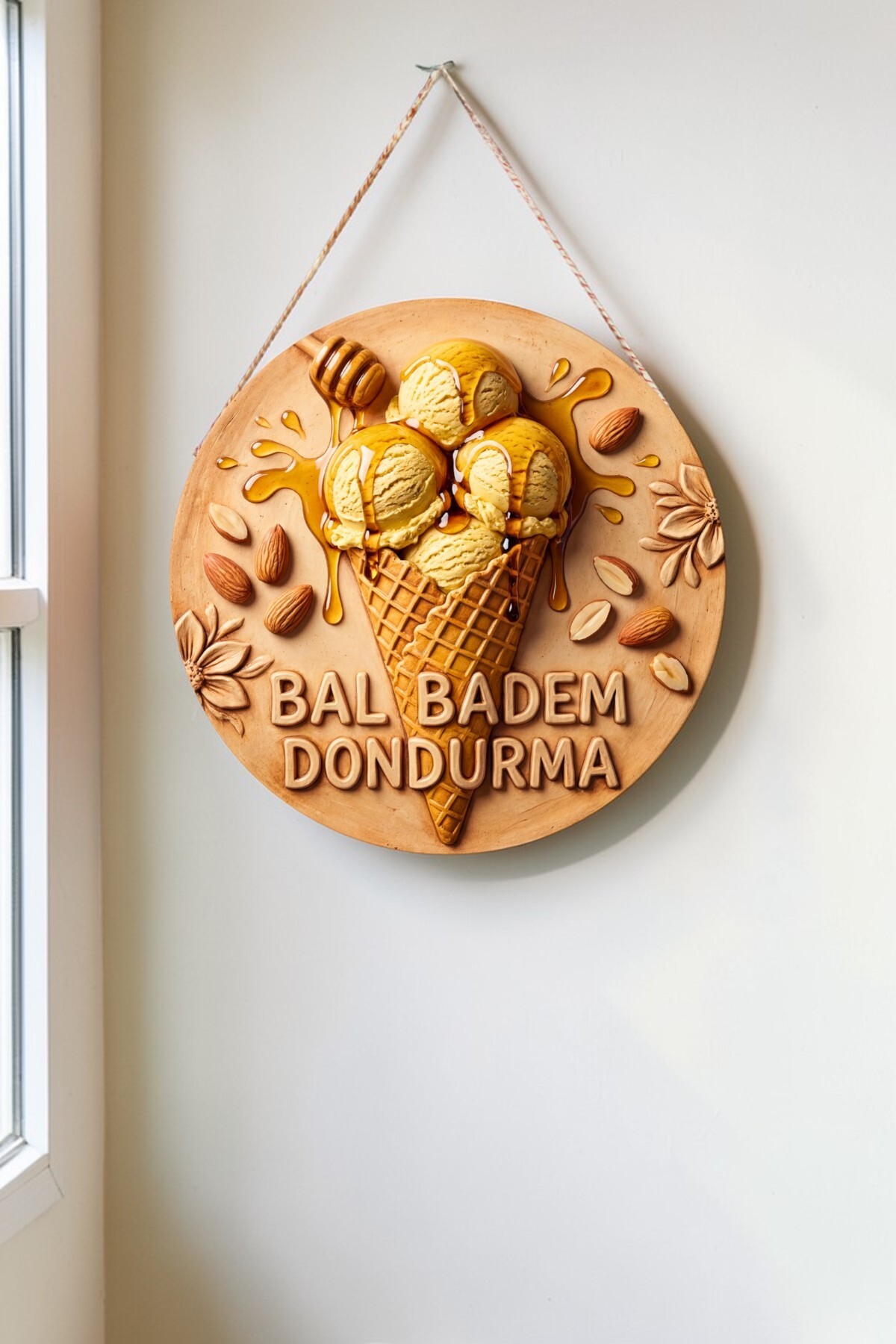 How about a sweet and chirpy touch to your space or home? Designed with vibrant color tones, appetizing cone detail and fresh Honey Almond ice cream visuals, this Ice Cream themed round wooden board will bring the energy of summer wherever it is hung! It attracts attention even from afar thanks to its high resolution printing with 3D (embossed) effect.