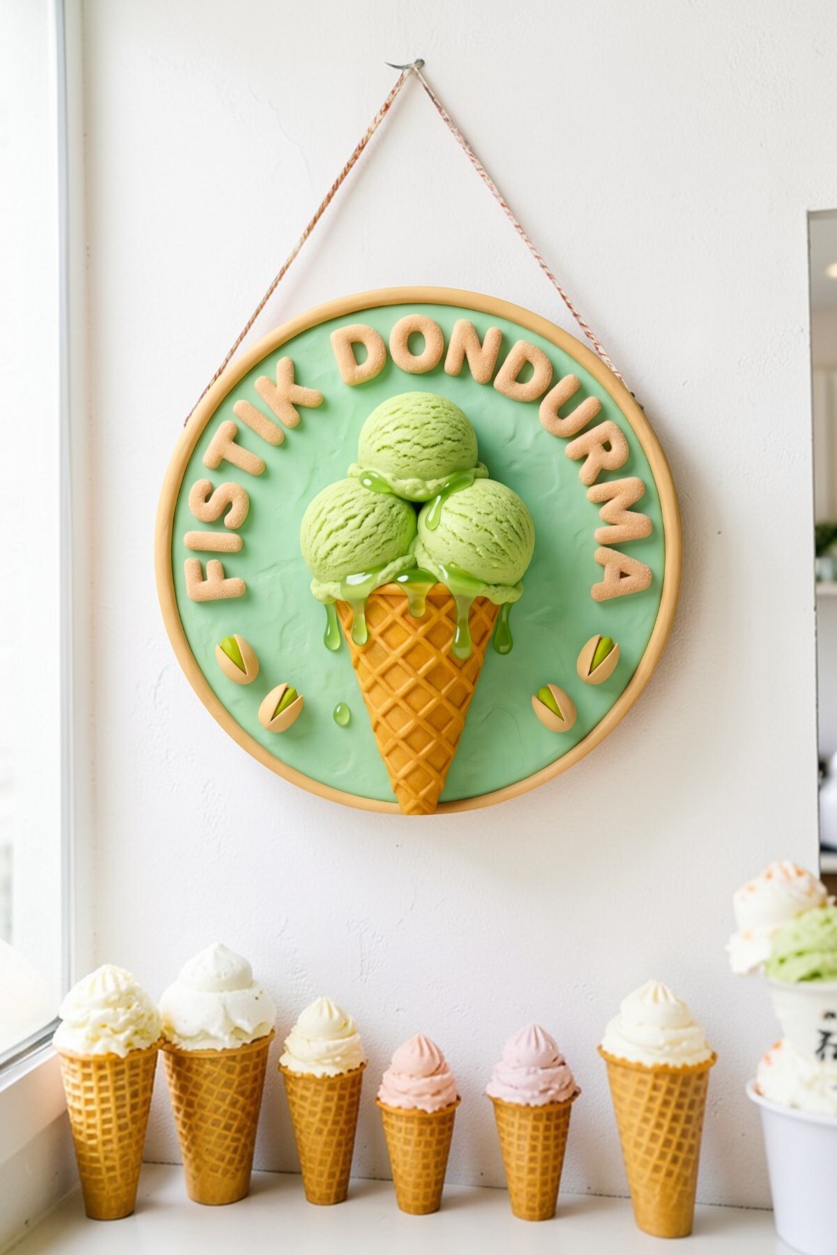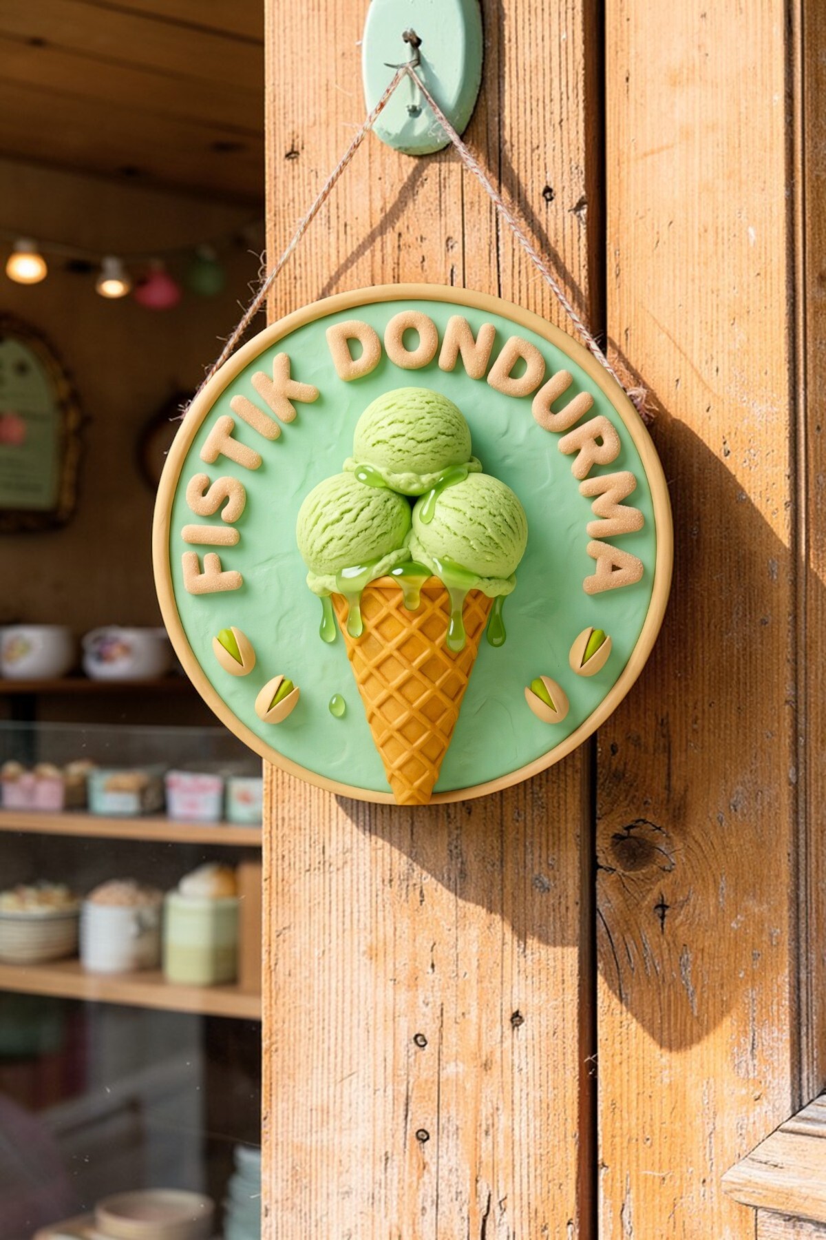 How about a sweet and chirpy touch to your space or home? Designed with vibrant color tones, appetizing cone detail and fresh Pistachio ice cream visuals, this Ice Cream themed round wooden board will bring the energy of summer wherever it is hung! It attracts attention even from afar thanks to its high-resolution printing with 3D (embossed) effect.