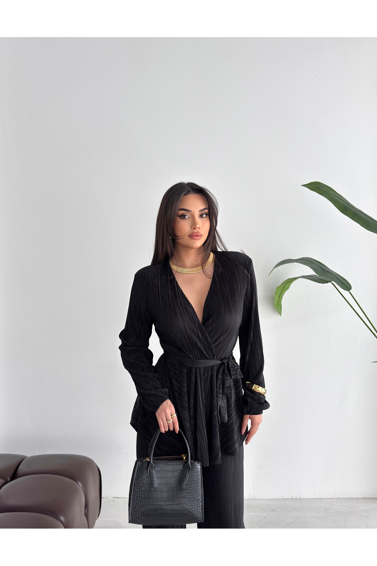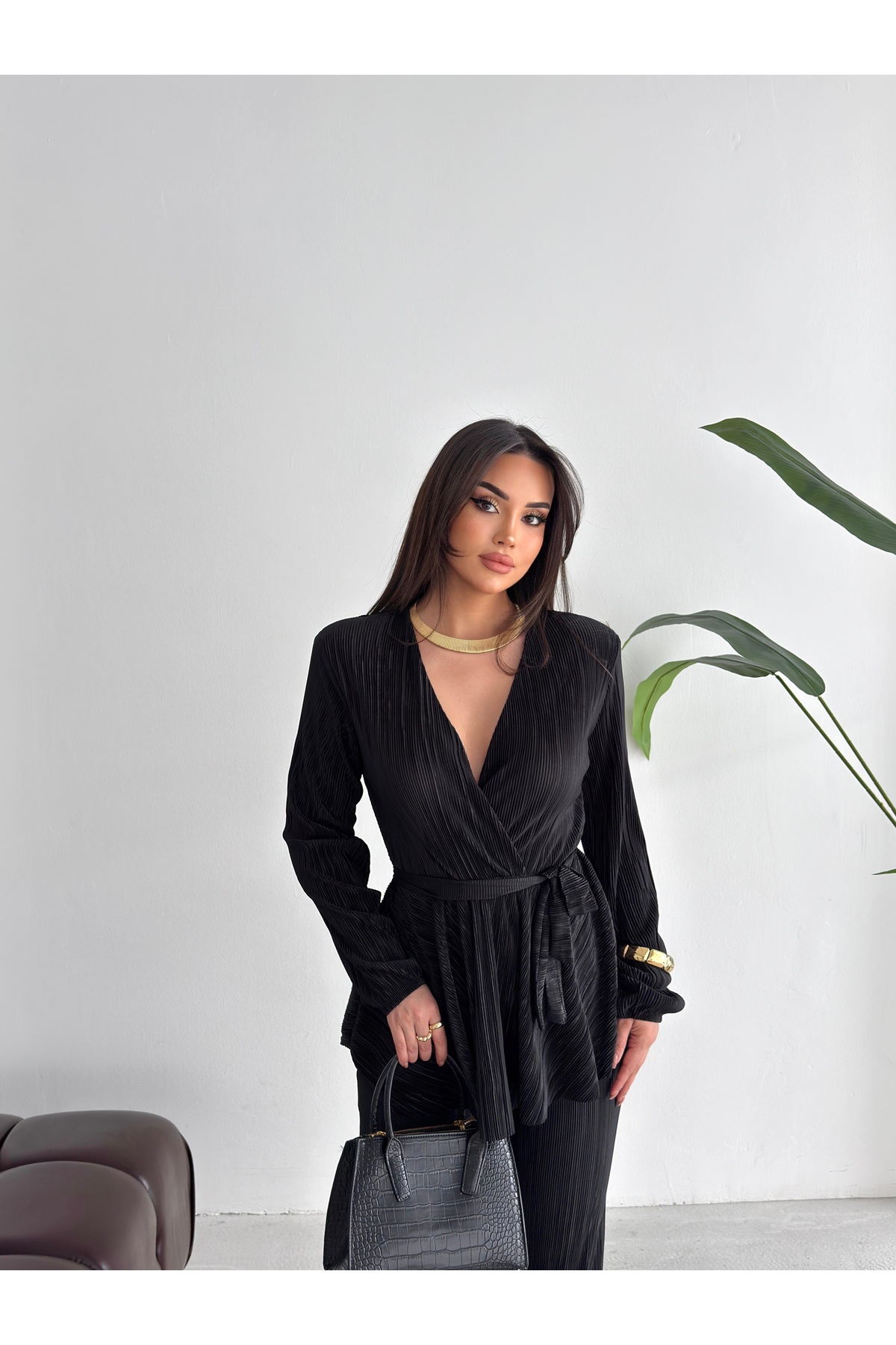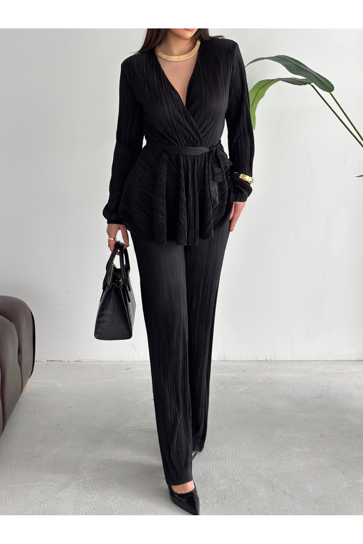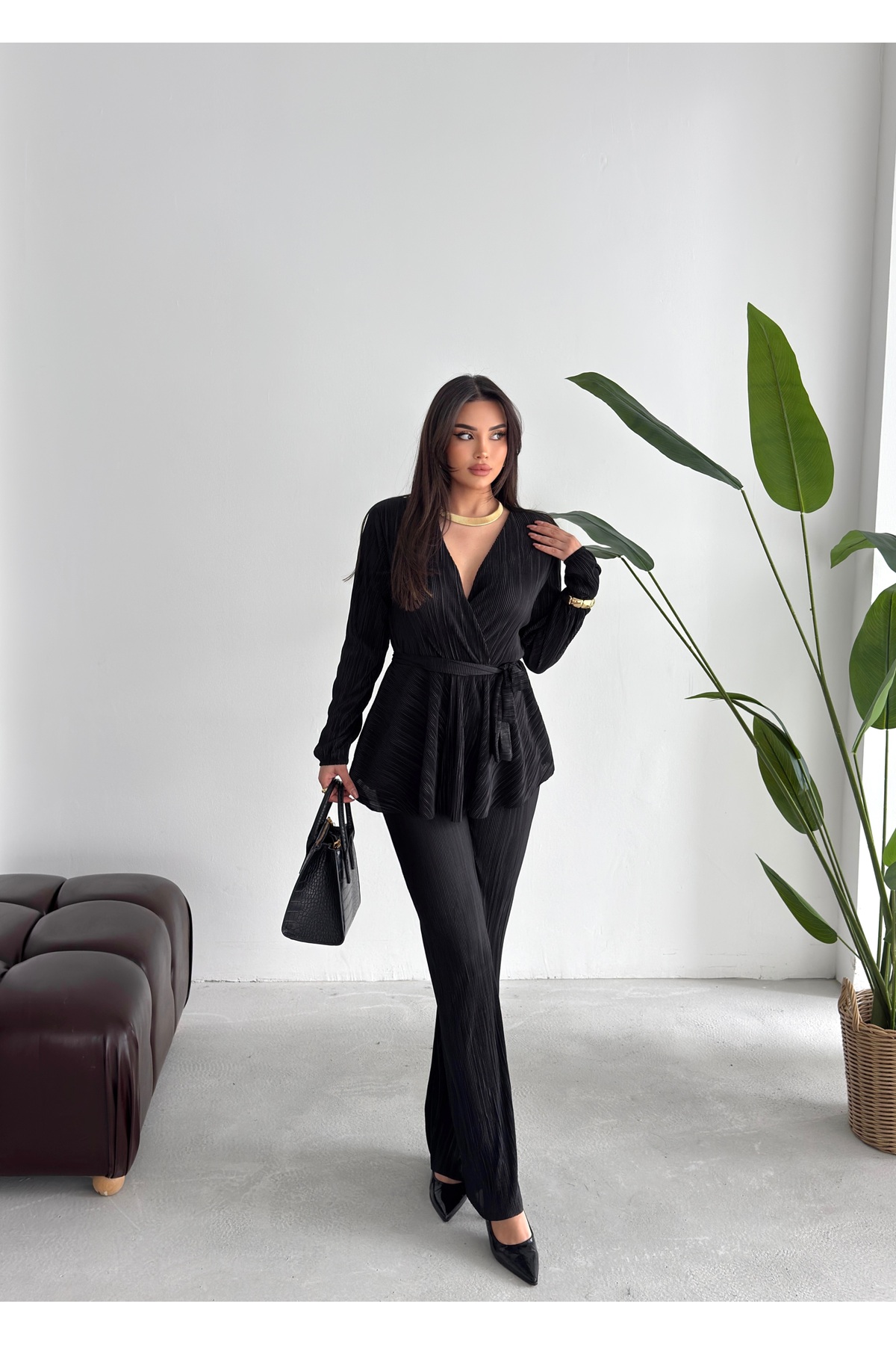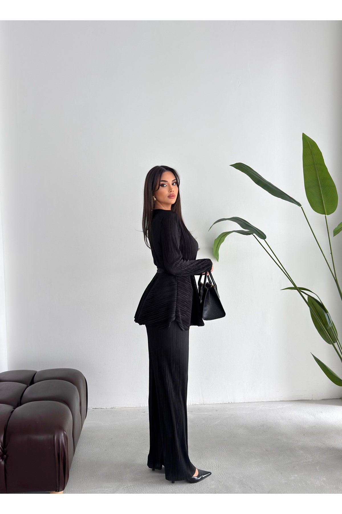 This women's black pleated bottom and top set offers a stylish look with its modern and elegant design.