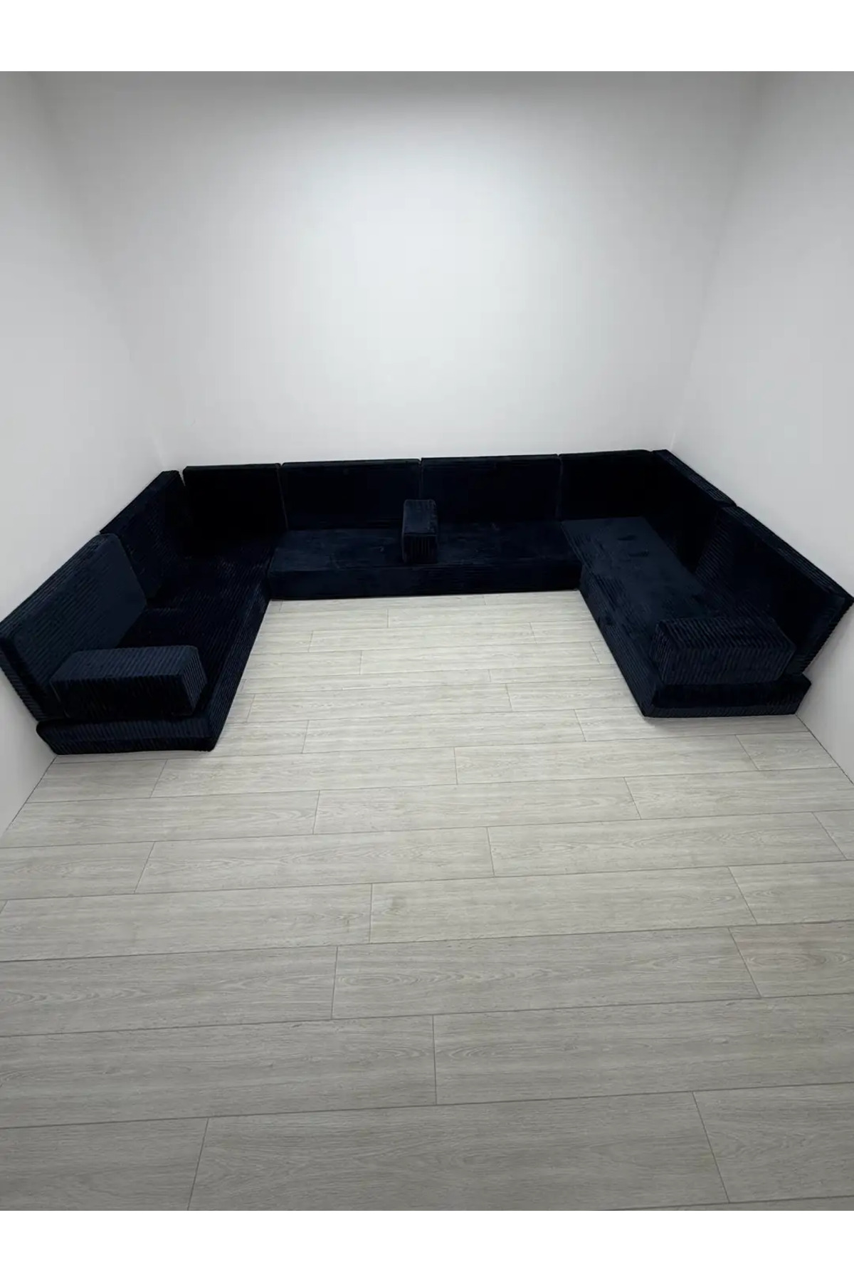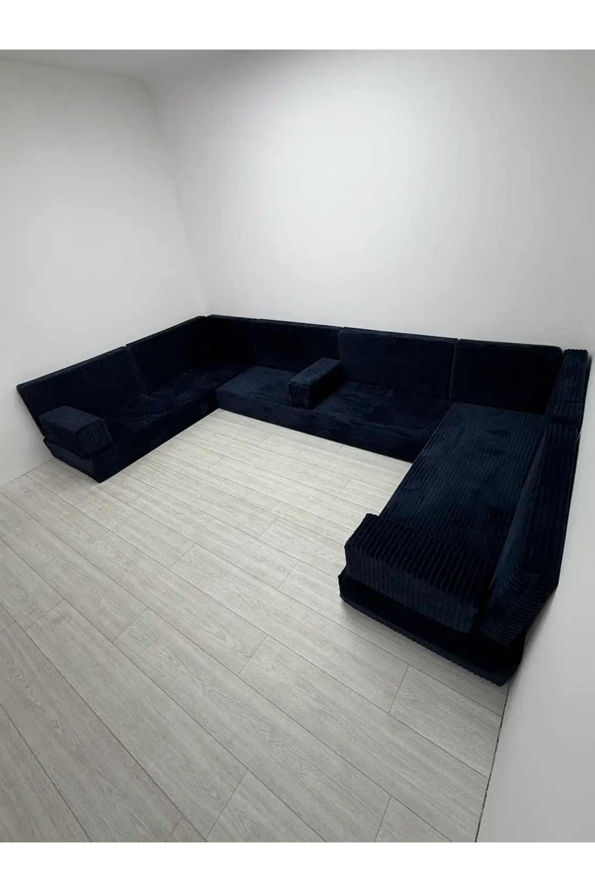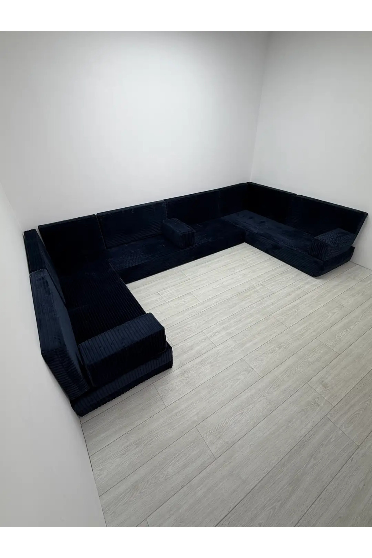 BAKIRÖZÜ HOME Premium Velvet Fabric, Comfort Floor Sofa ,Modular Oriental Corner Set - Navy- U SET | ByTR