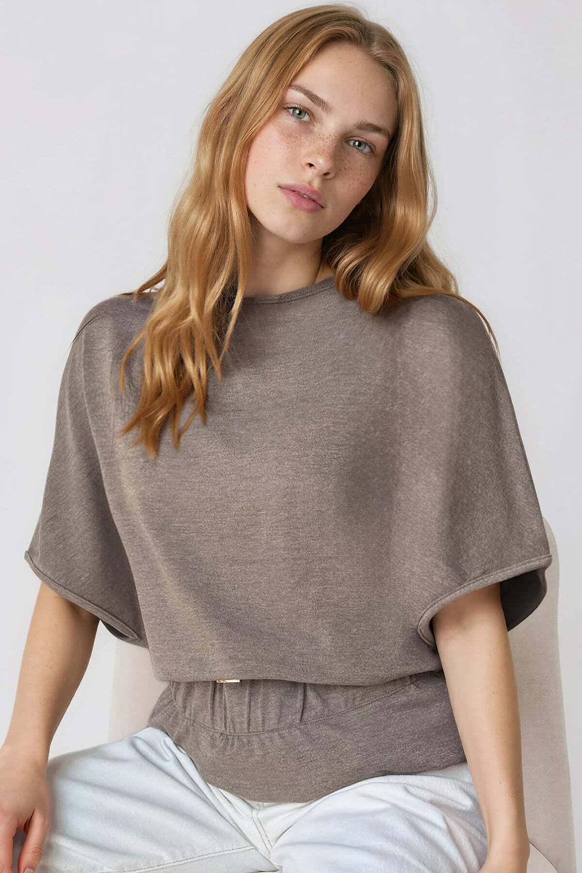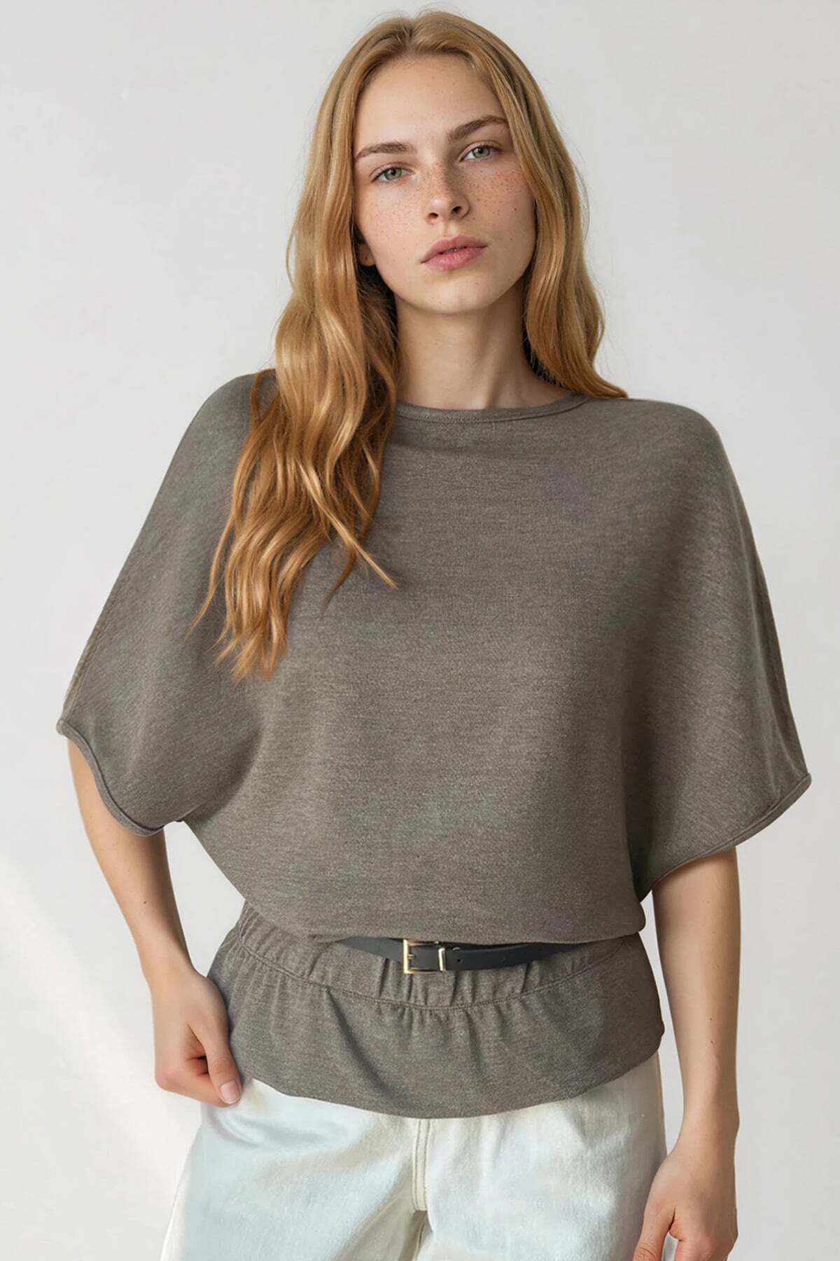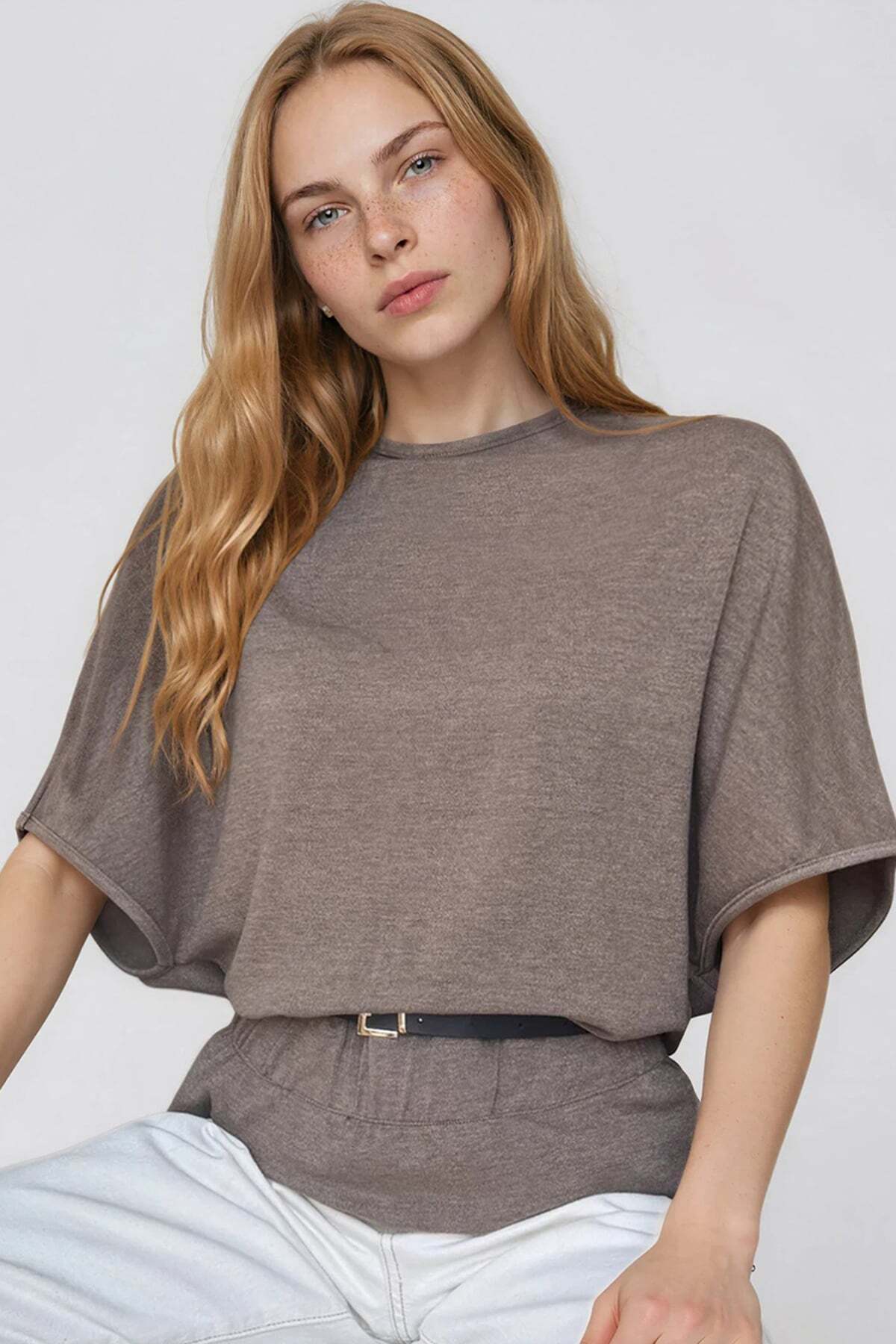 Trend Alaçatı Stili Brown Boat Neck Belt Detailed Knitted Blouse ALC-X15403 | ByTR