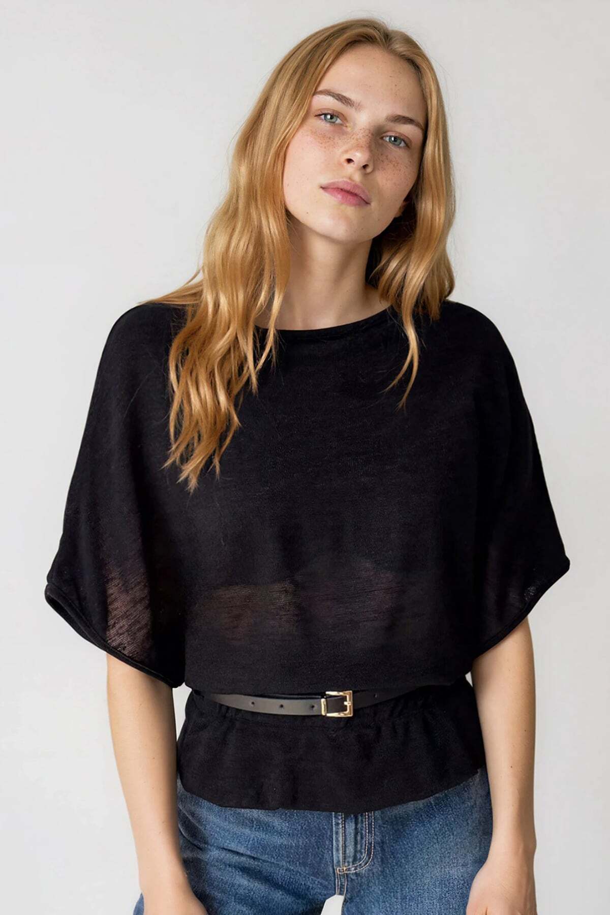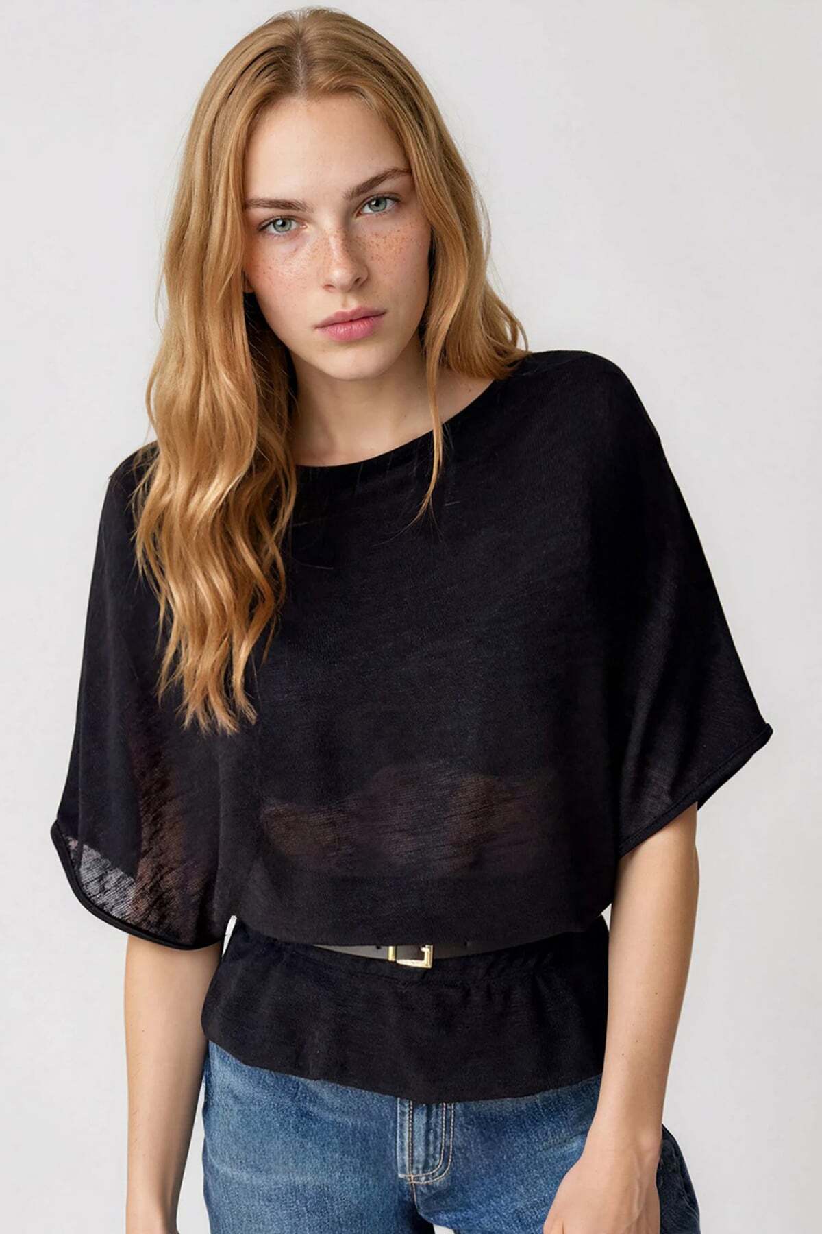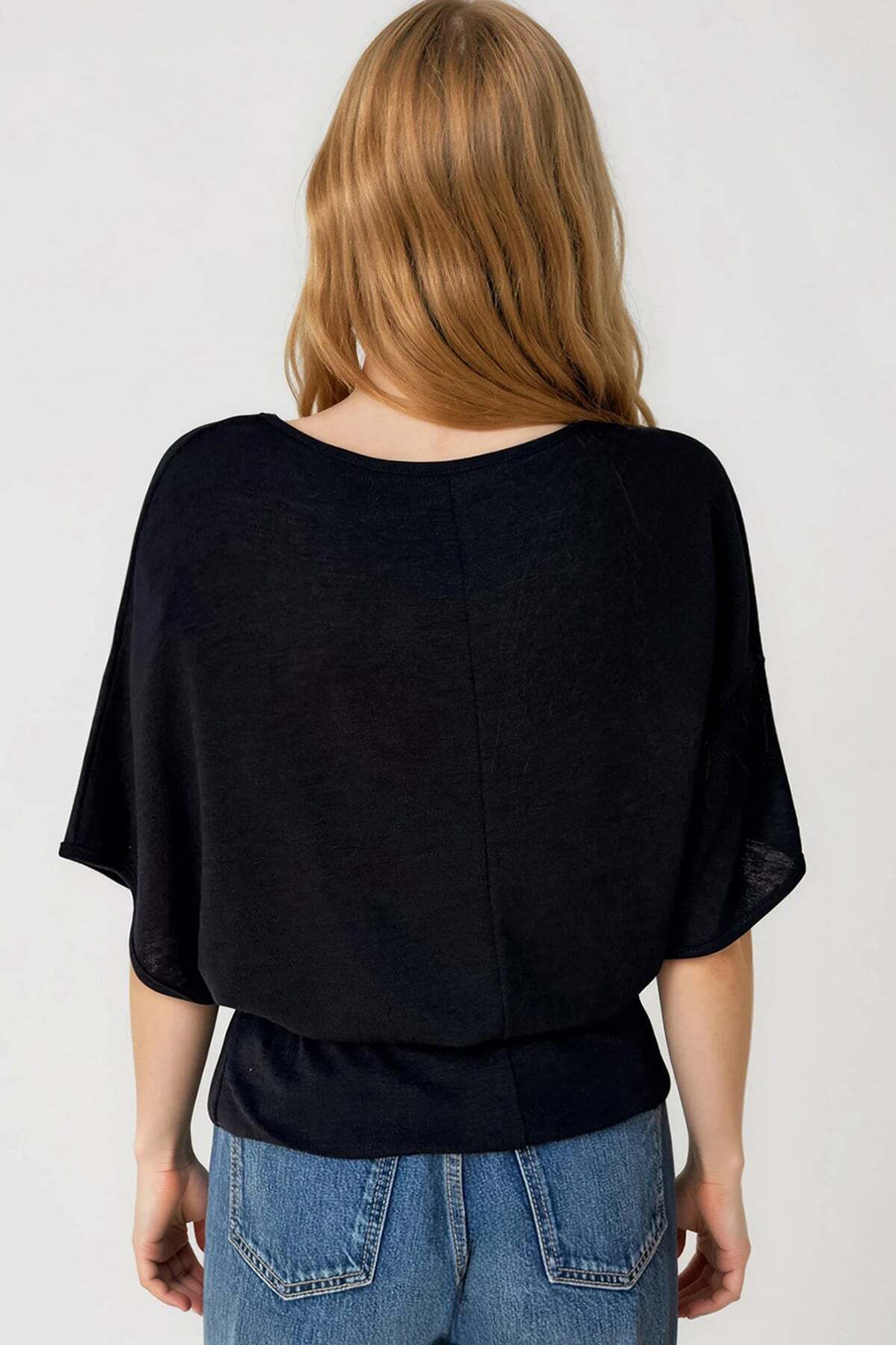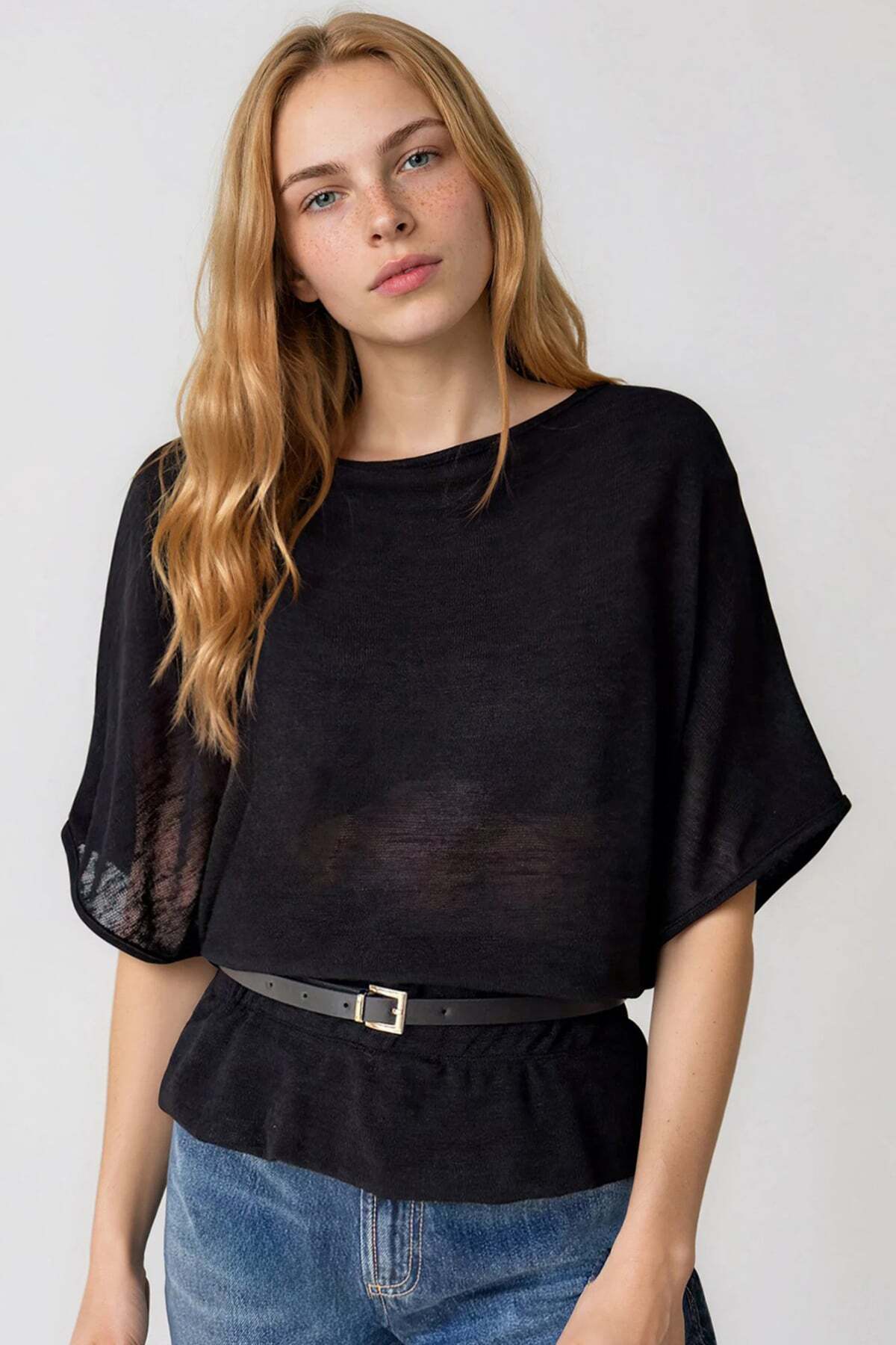 Black Boat Neck Belt Detailed Knitted Blouse