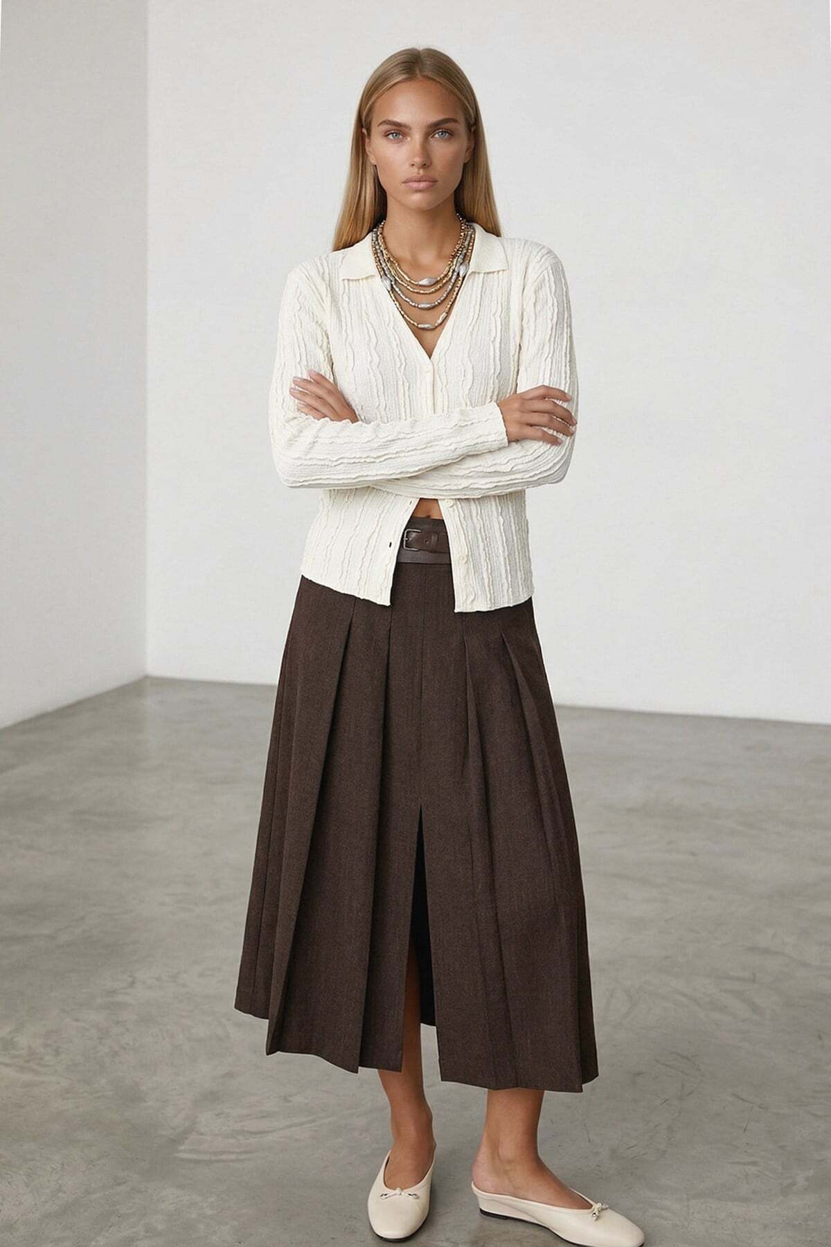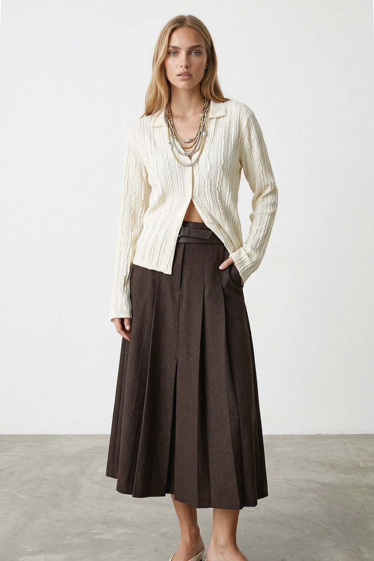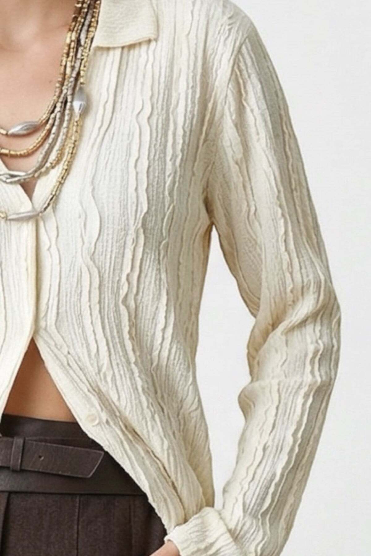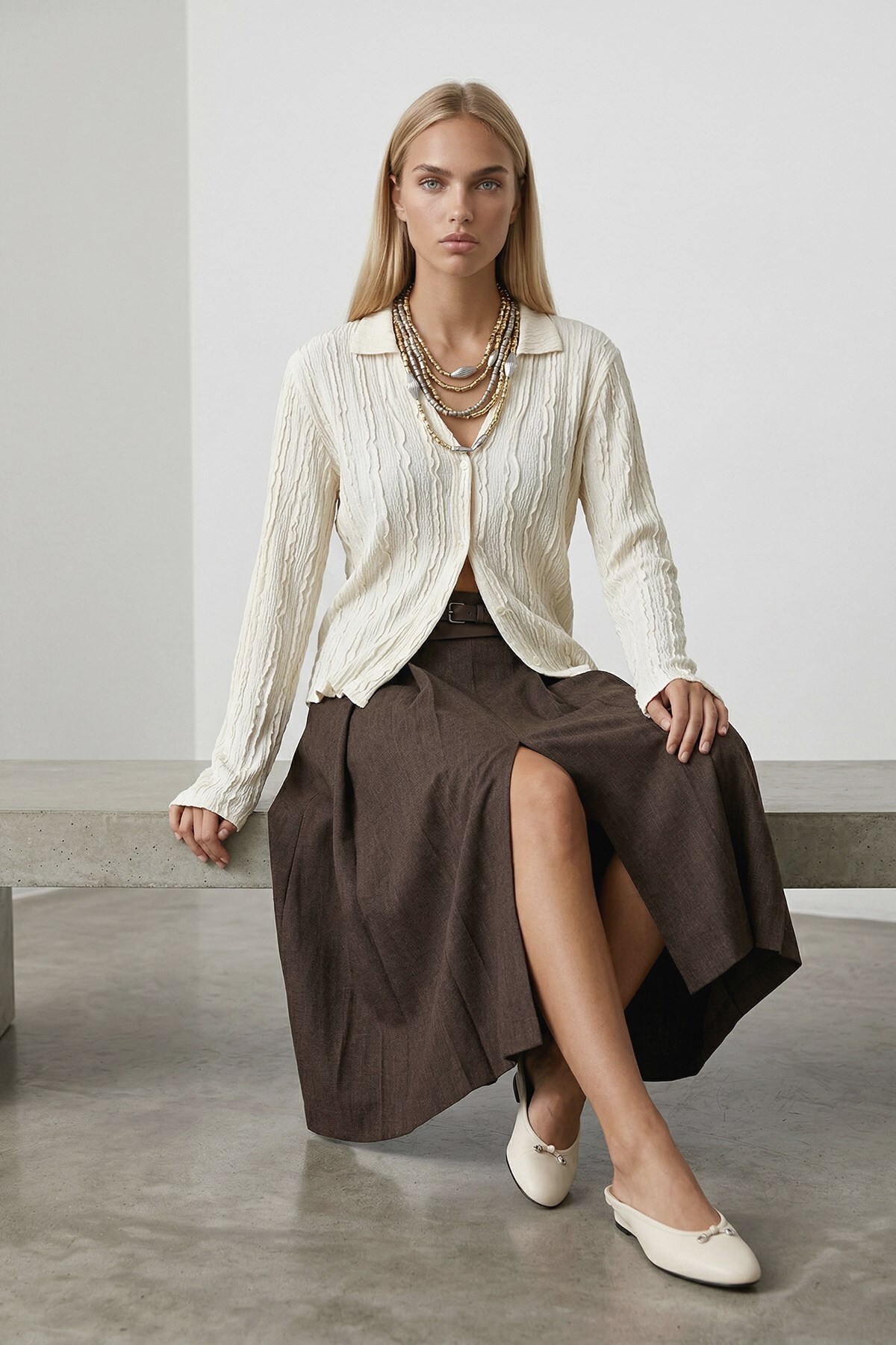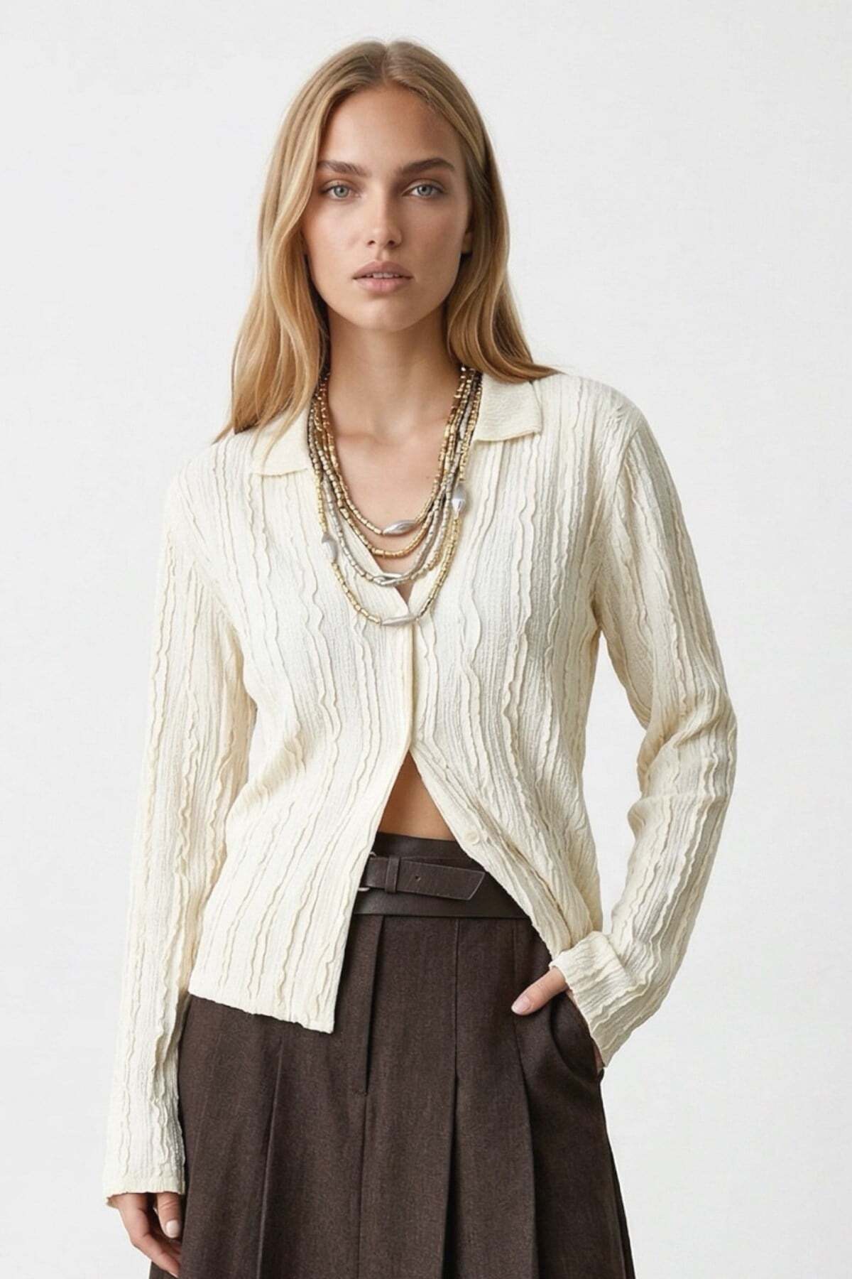 Designed with Shirt Collar Form and Button Detail on the Front Surface, This Blouse Offers a Movable Appearance with its Bürümcük Textured Structure.