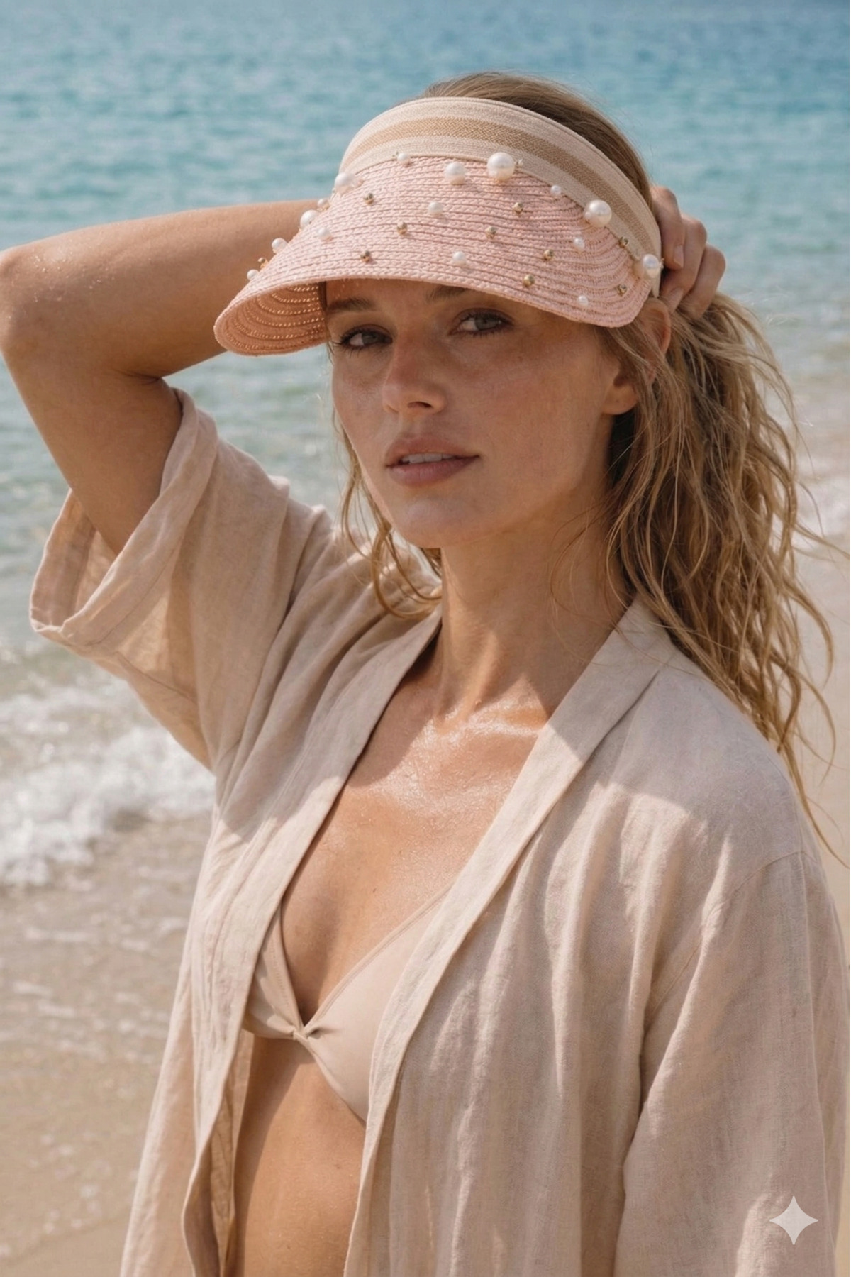 Powder-colored wicker visor hat that will complement your elegance at the beach and outdoor activities in the summer.