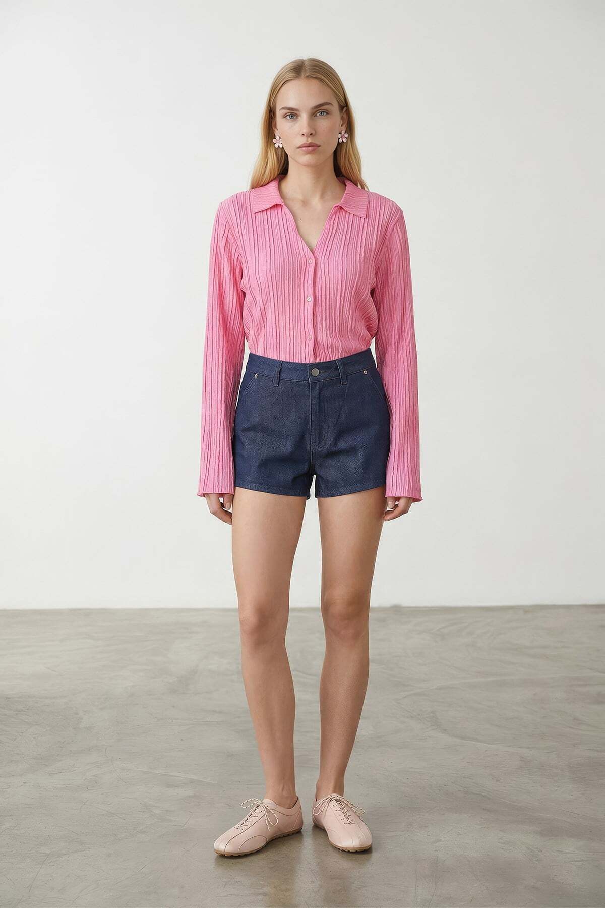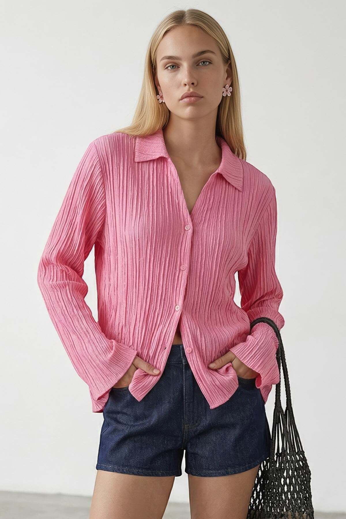 Designed with Shirt Collar Form and Button Detail on the Front Surface, This Blouse Offers a Movable Appearance with its Bürümcük Textured Structure.