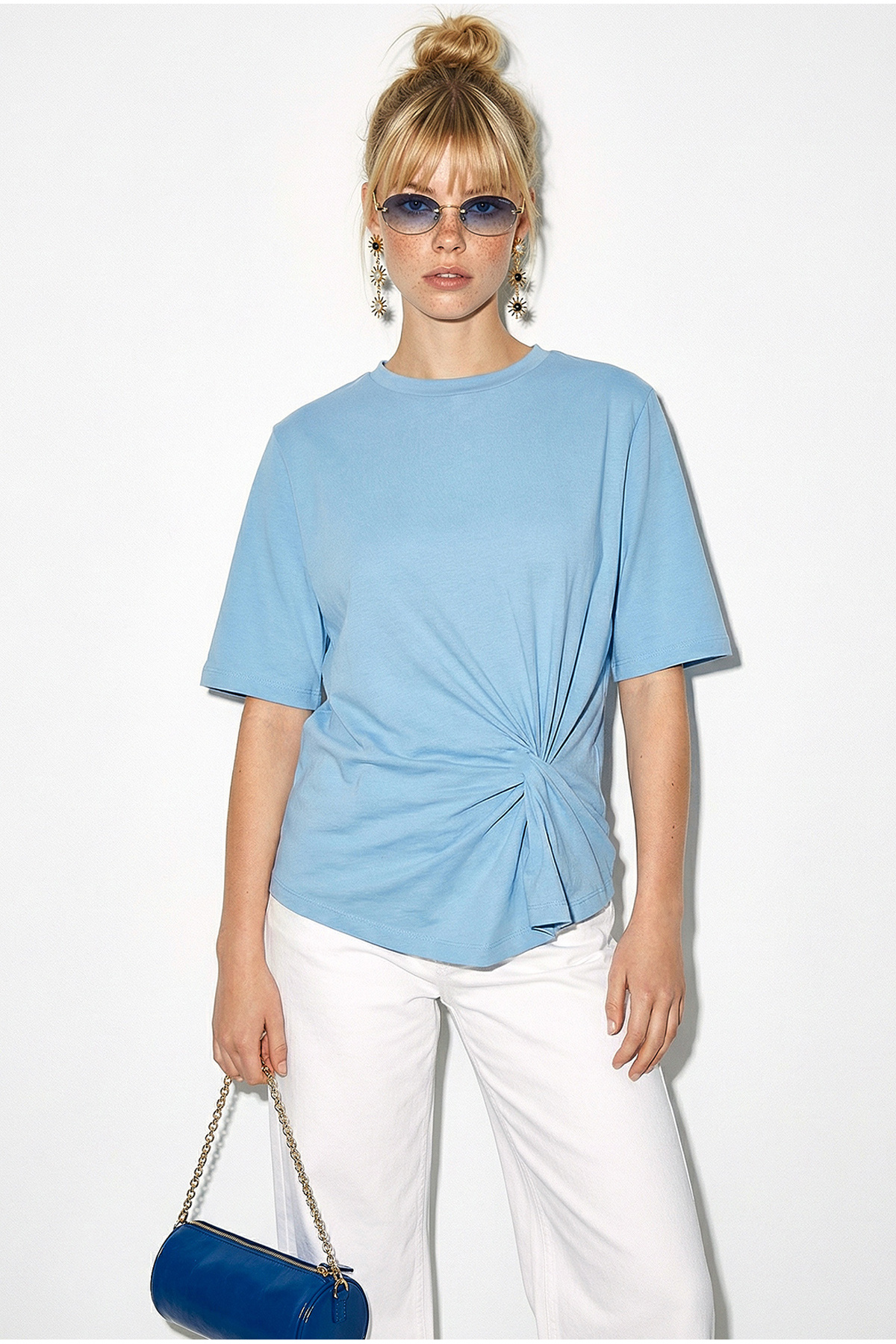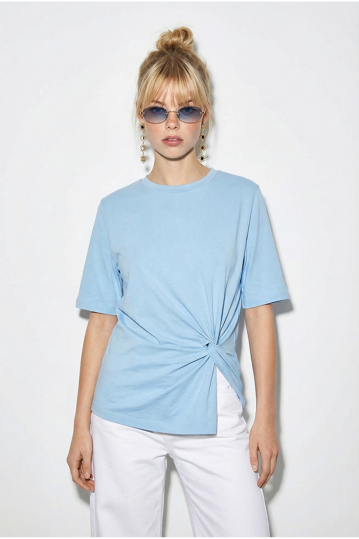 Product Features: Padded shoulder detail Knot detail on the side Short sleeve Comfortable fit Soft and comfortable fabric Stylish design suitable for daily use Size on the model is S Size Colors may vary due to light differences in studio shootings.
