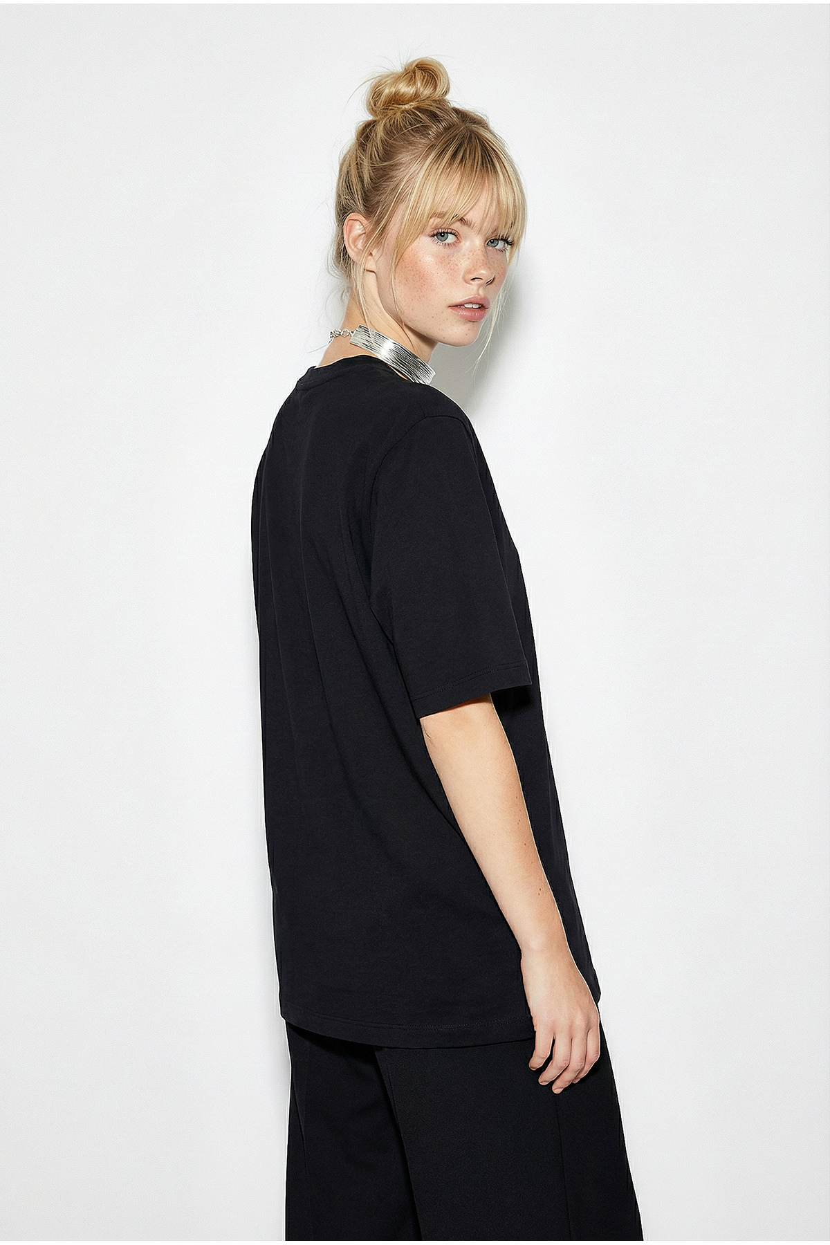 Model Sizes: Height:175, Chest:88, Waist:62, Hip: 90. Standing out with its modern and remarkable design, this t-shirt offers a strong silhouette thanks to its shoulder detail with shoulder pads.