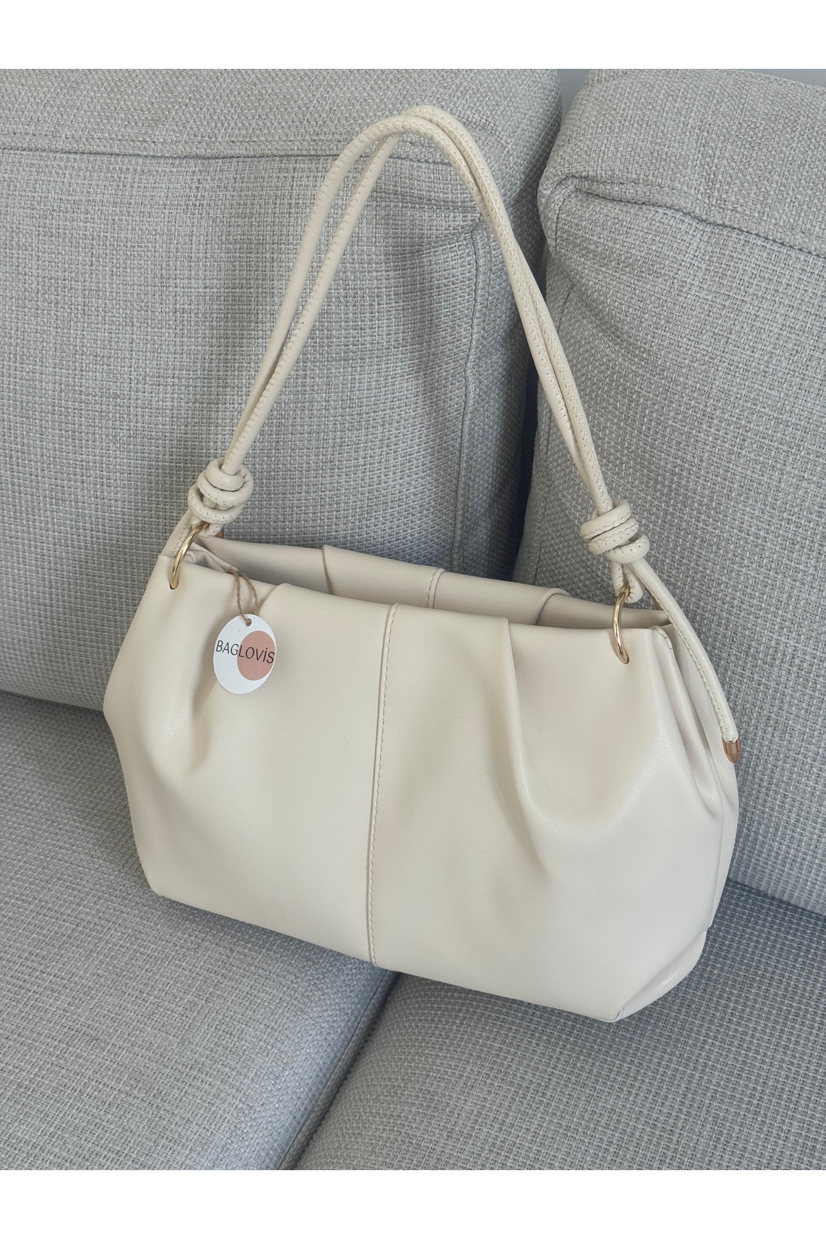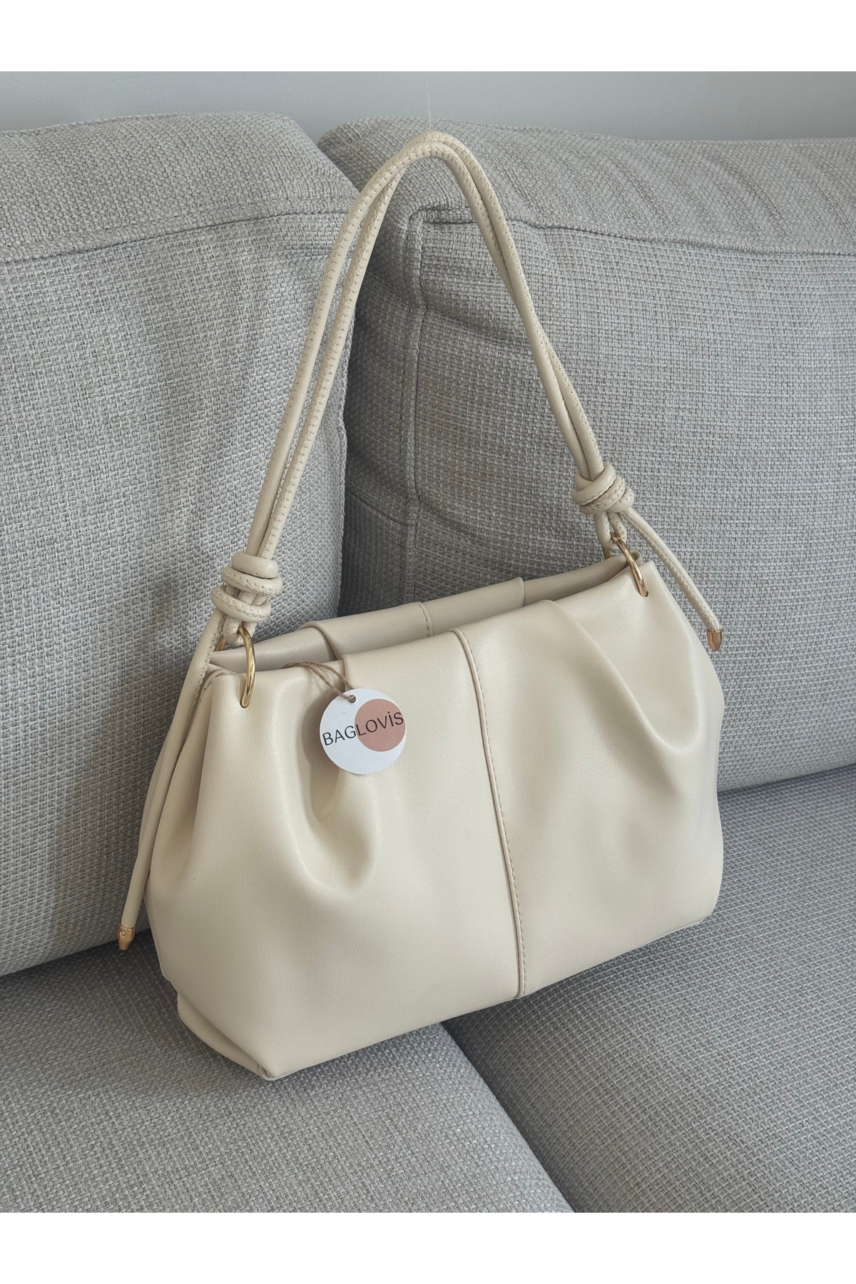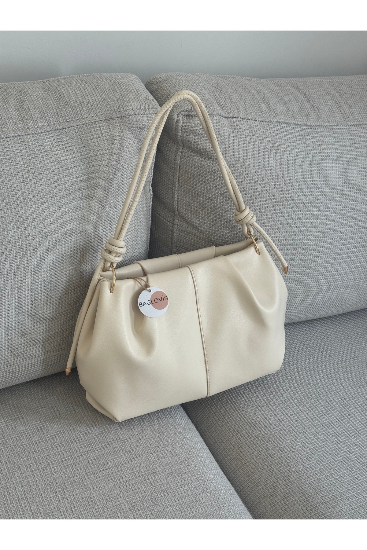 Modern and elegant design , vertical seam detail, shirred surface , knot detail hanger design , gold tone ring accessories , spacious and useful interior , first-class artificial leather material