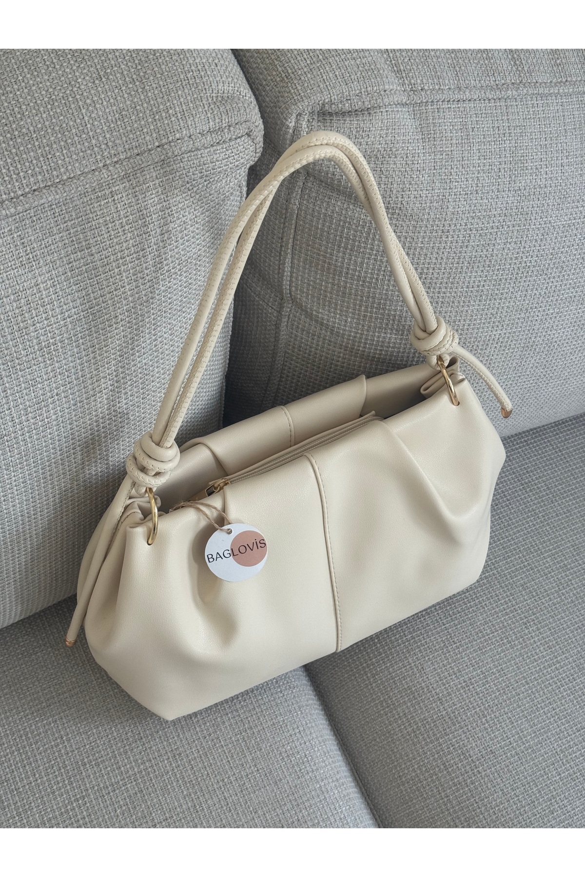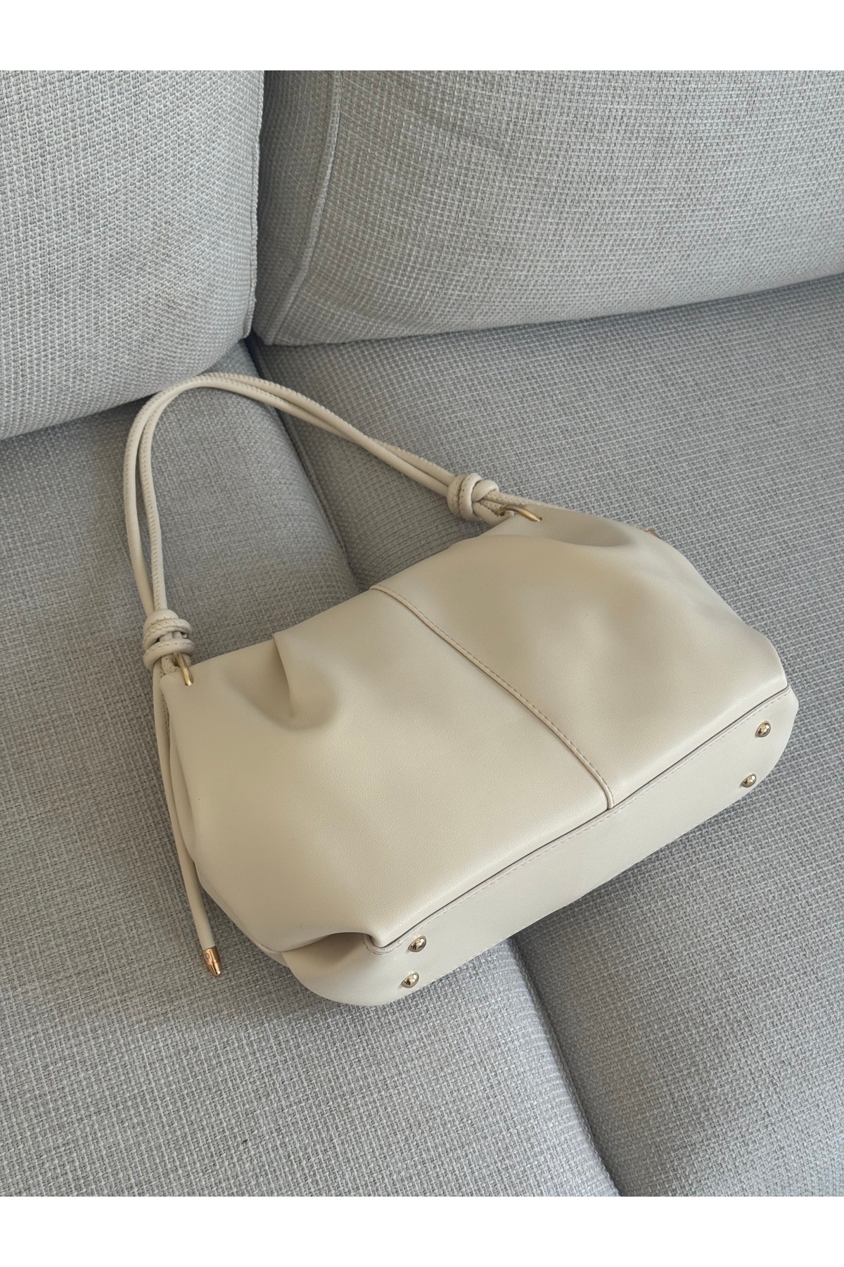 While the vertical seam details and shirred structure on the front surface give the bag a modern character, the knot details and gold tone ring accessories on the hanger add a stylish and premium touch to the product.