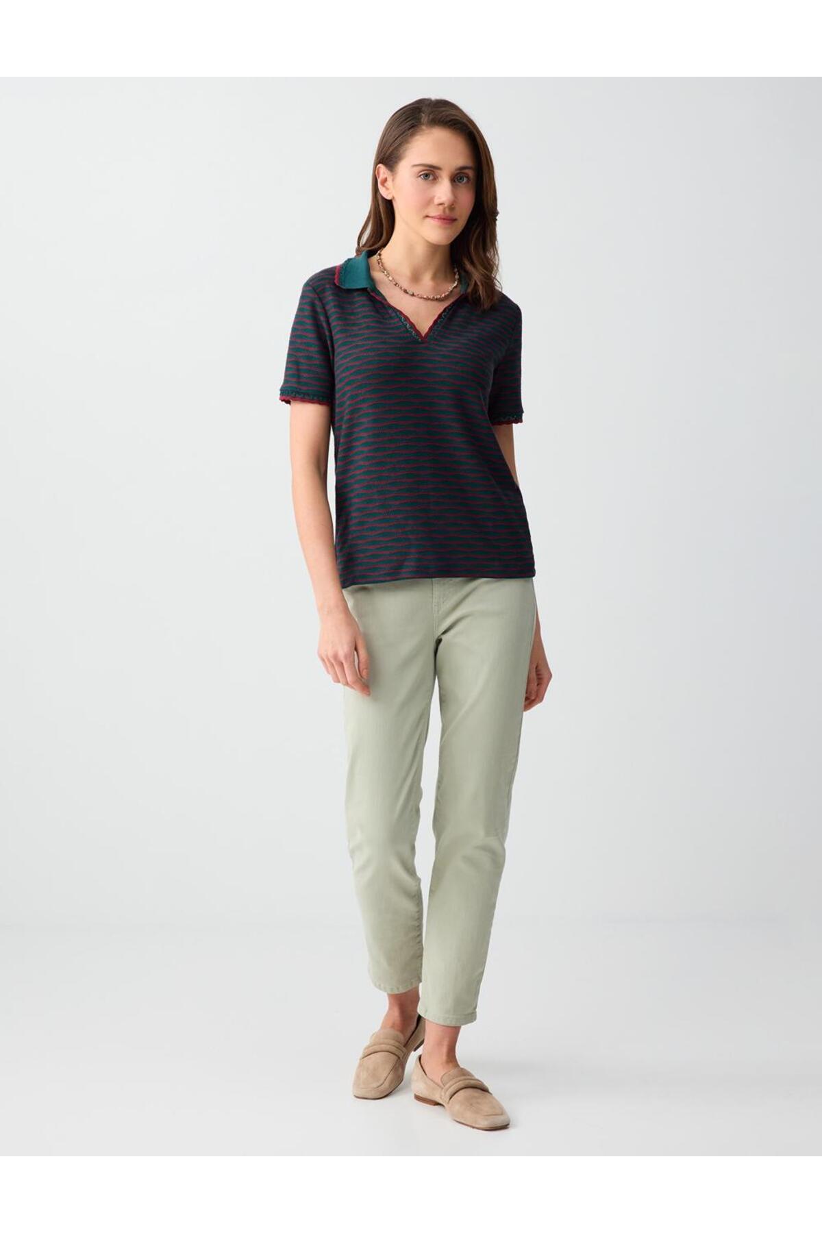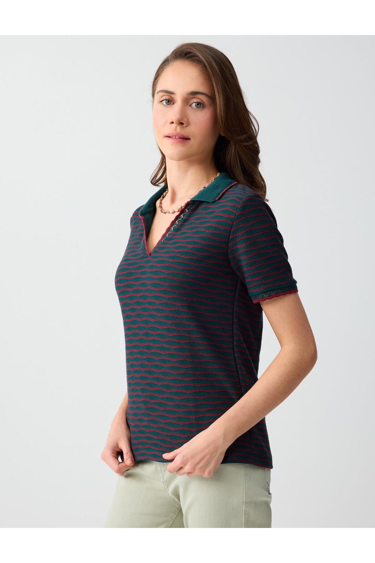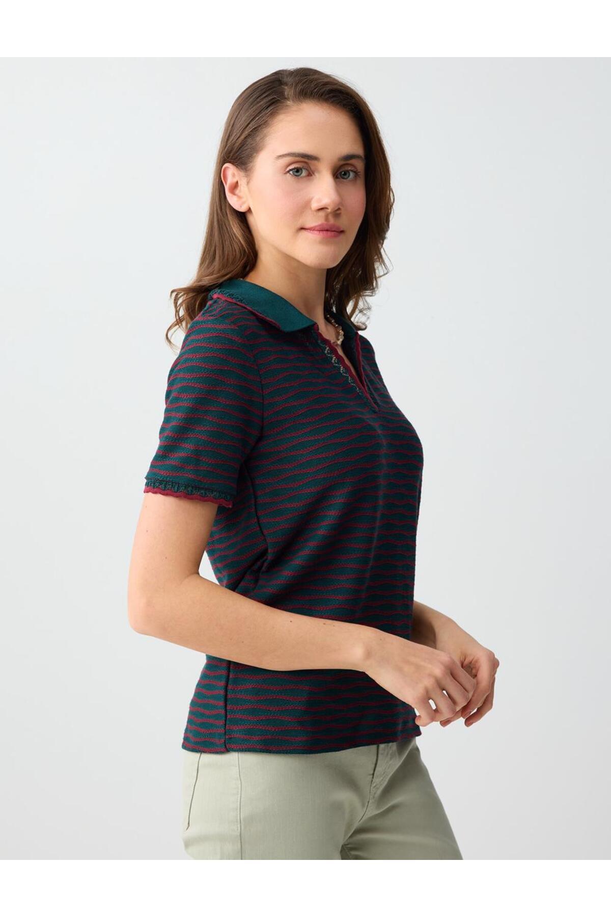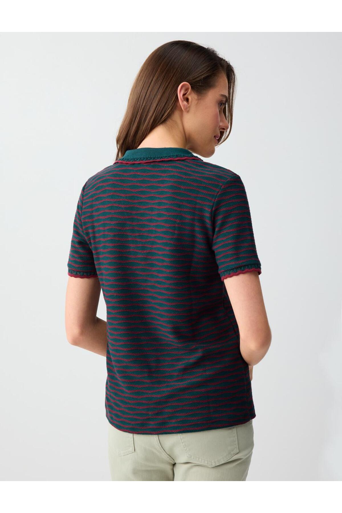 Jimmy Key Dark Green Short Sleeve Polo Neck Patterned Knitted Blouse | ByTR