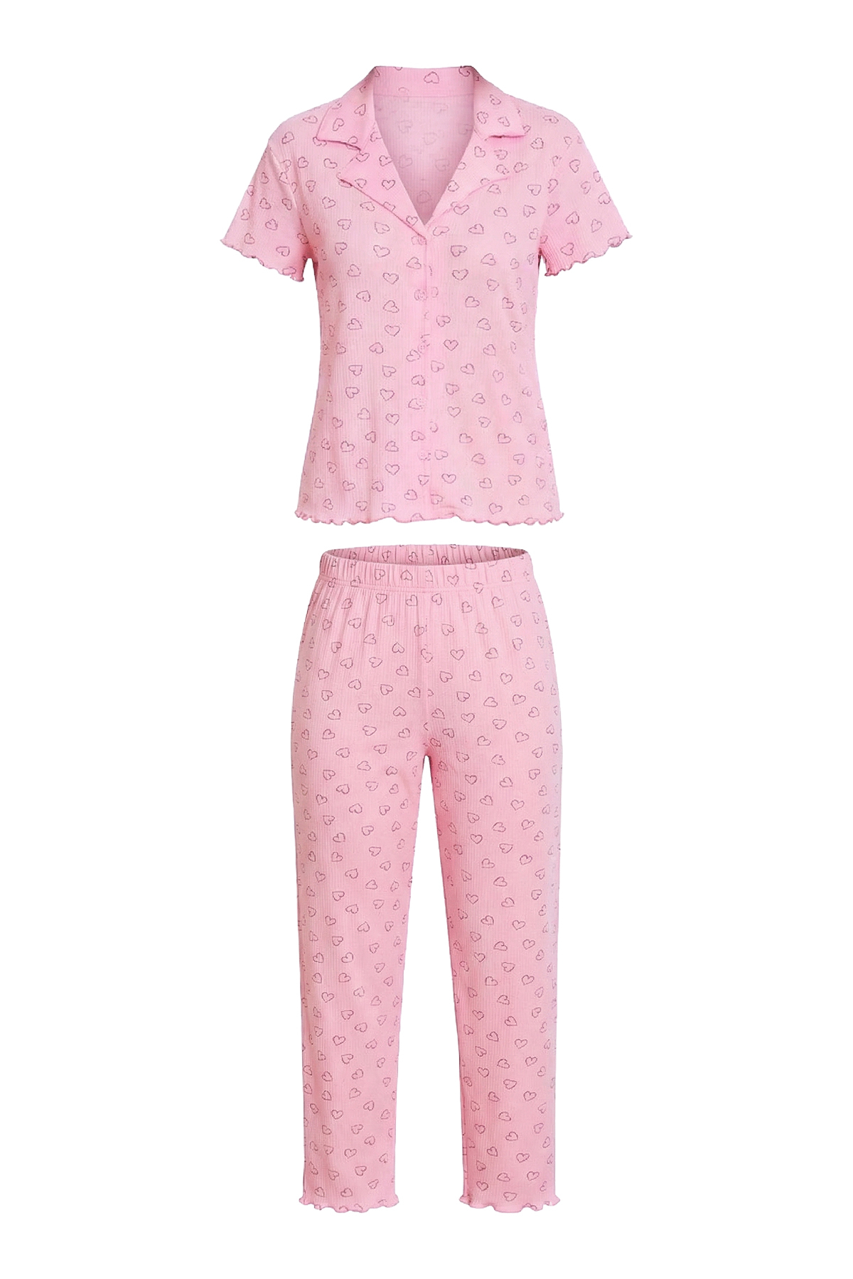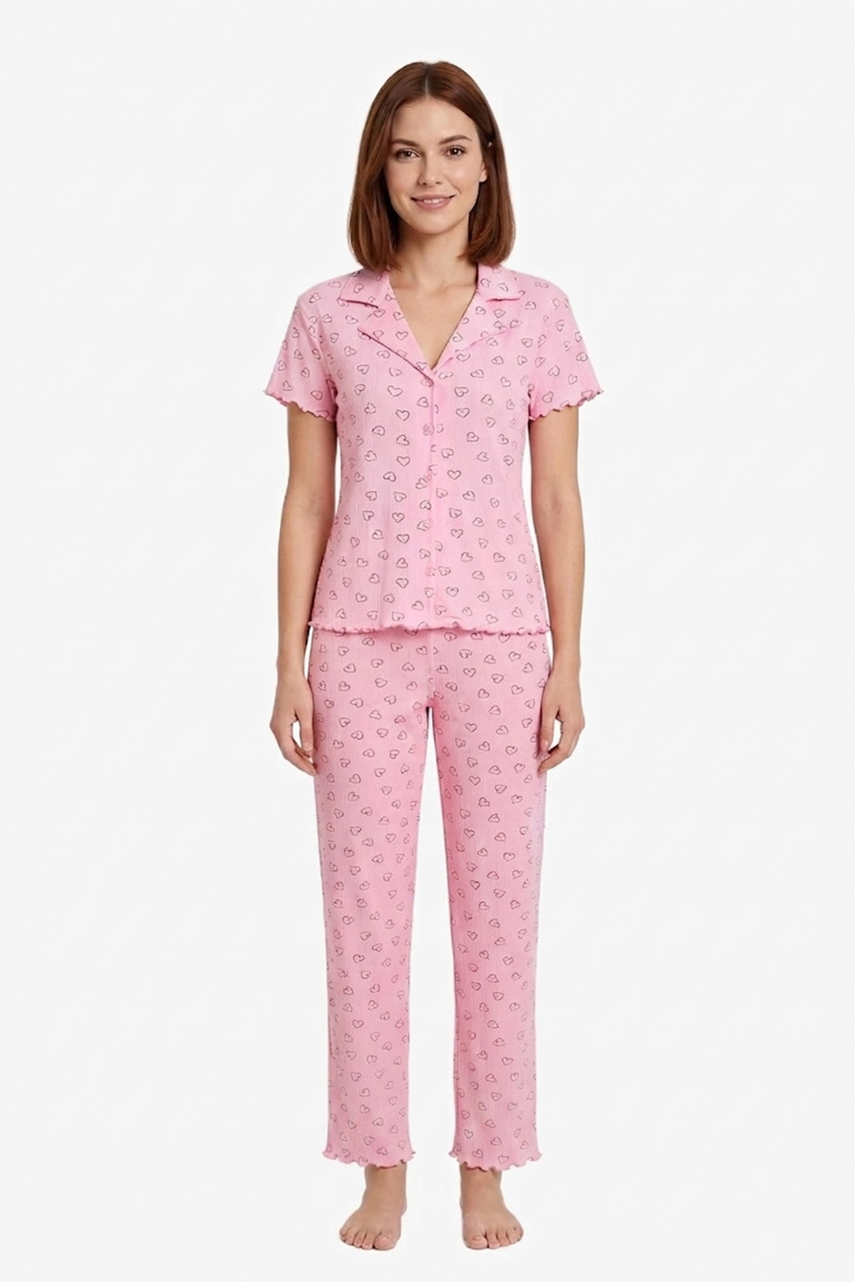 Cottonhill Powder Heart Patterned Pointel Shirt Collar Women's Pajamas Set | ByTR