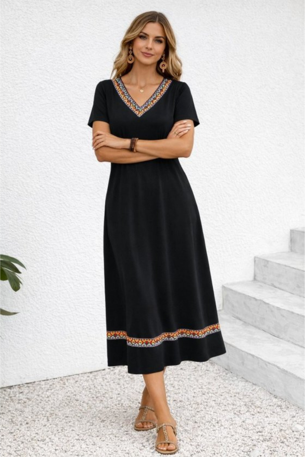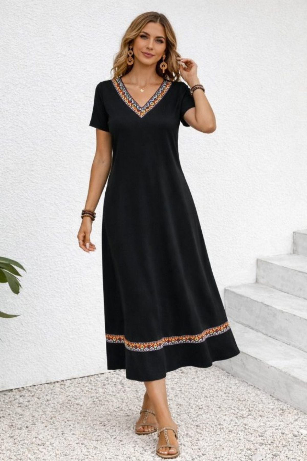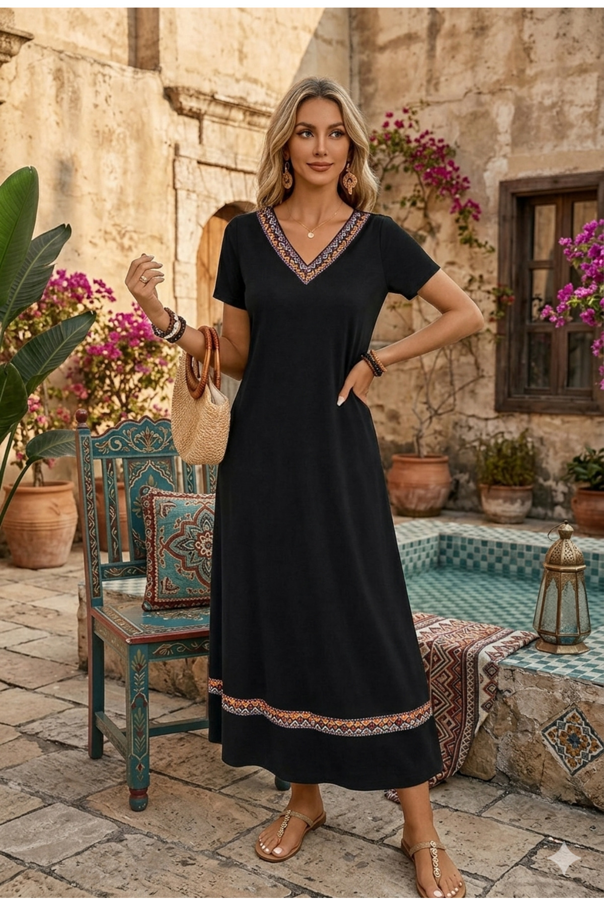 This dress, which attracts attention with its ethnic patterned design reflecting the trends of the new season, offers a modern look with its ribbon details.