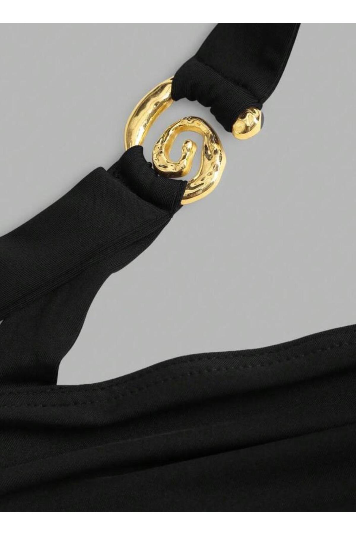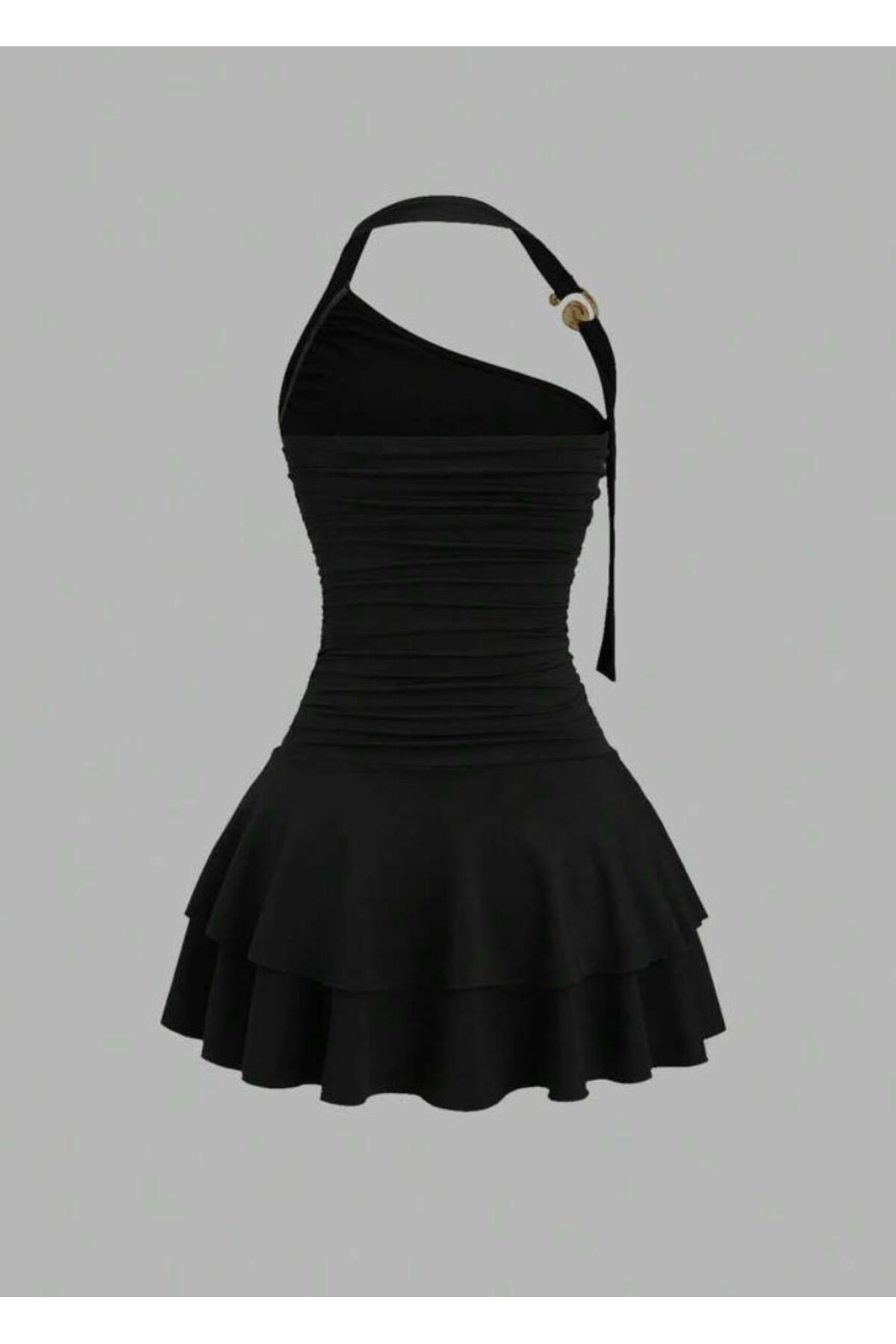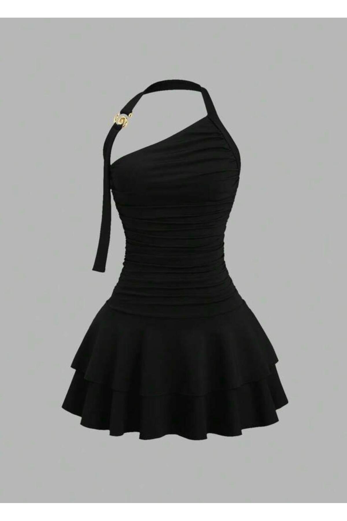 MEGOMEL Women's One Shoulder Layer Skirt Buckle Detailed Design Mini Dress | ByTR
