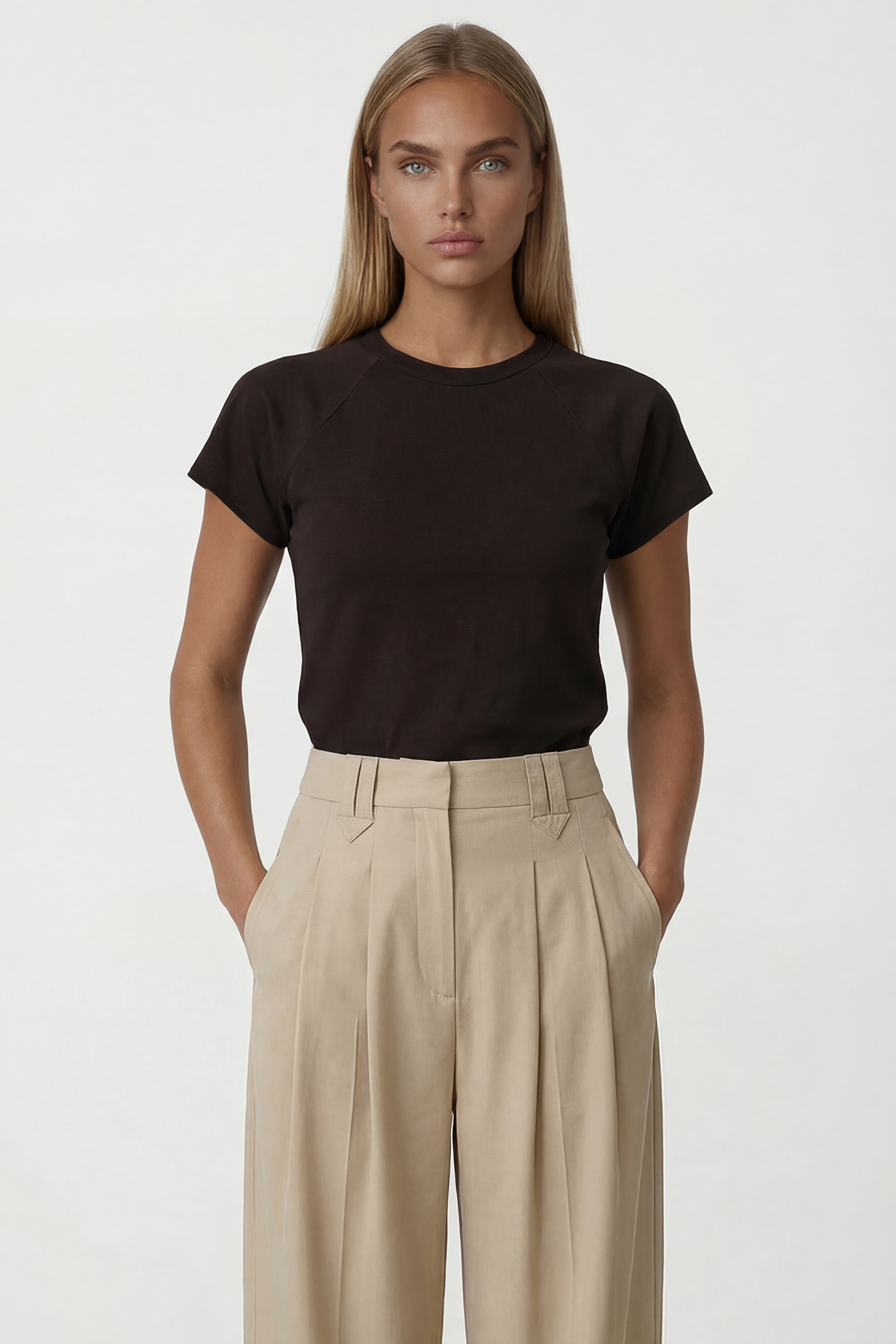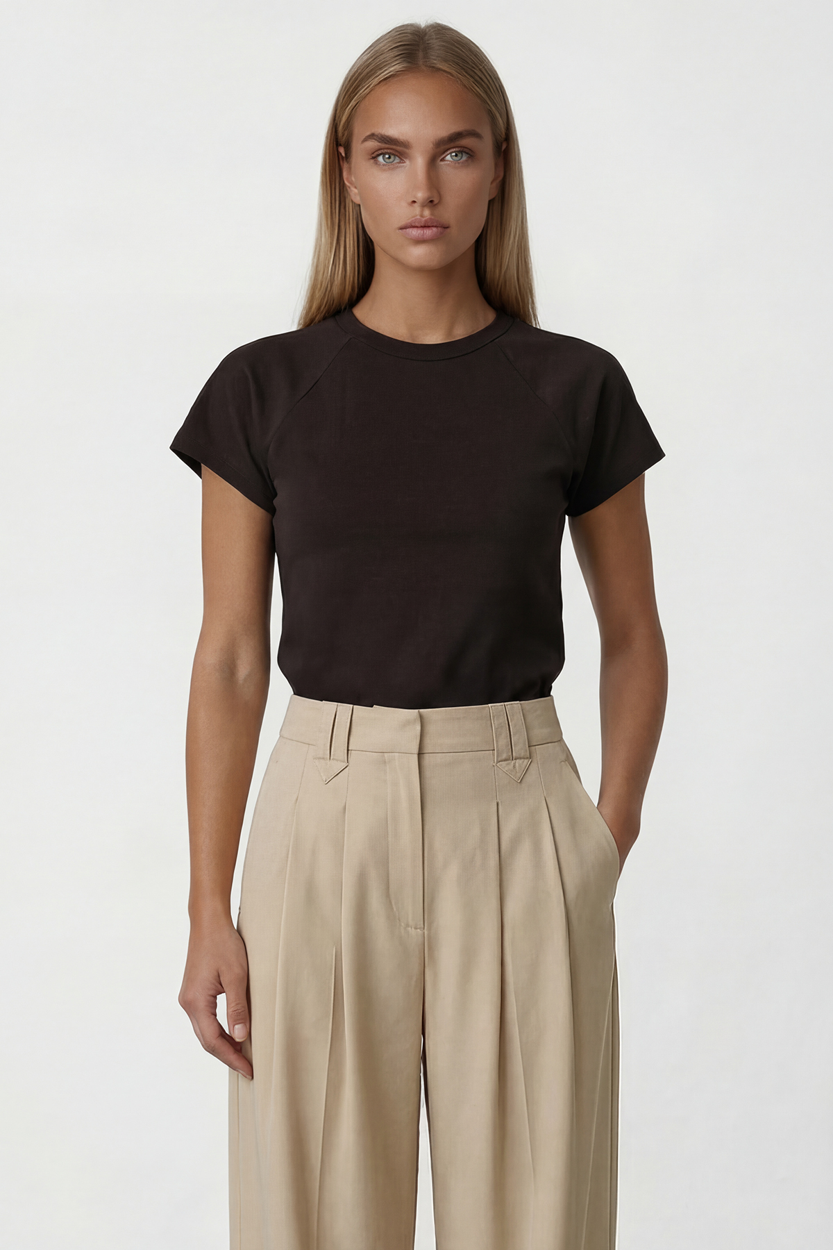 It creates a balanced silhouette with its short arm detail and simple design.
